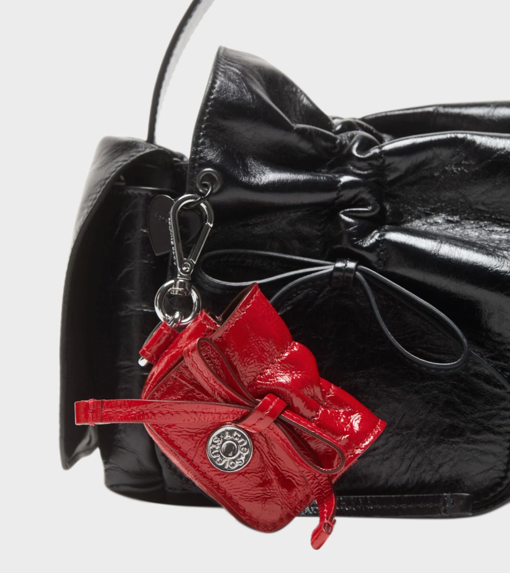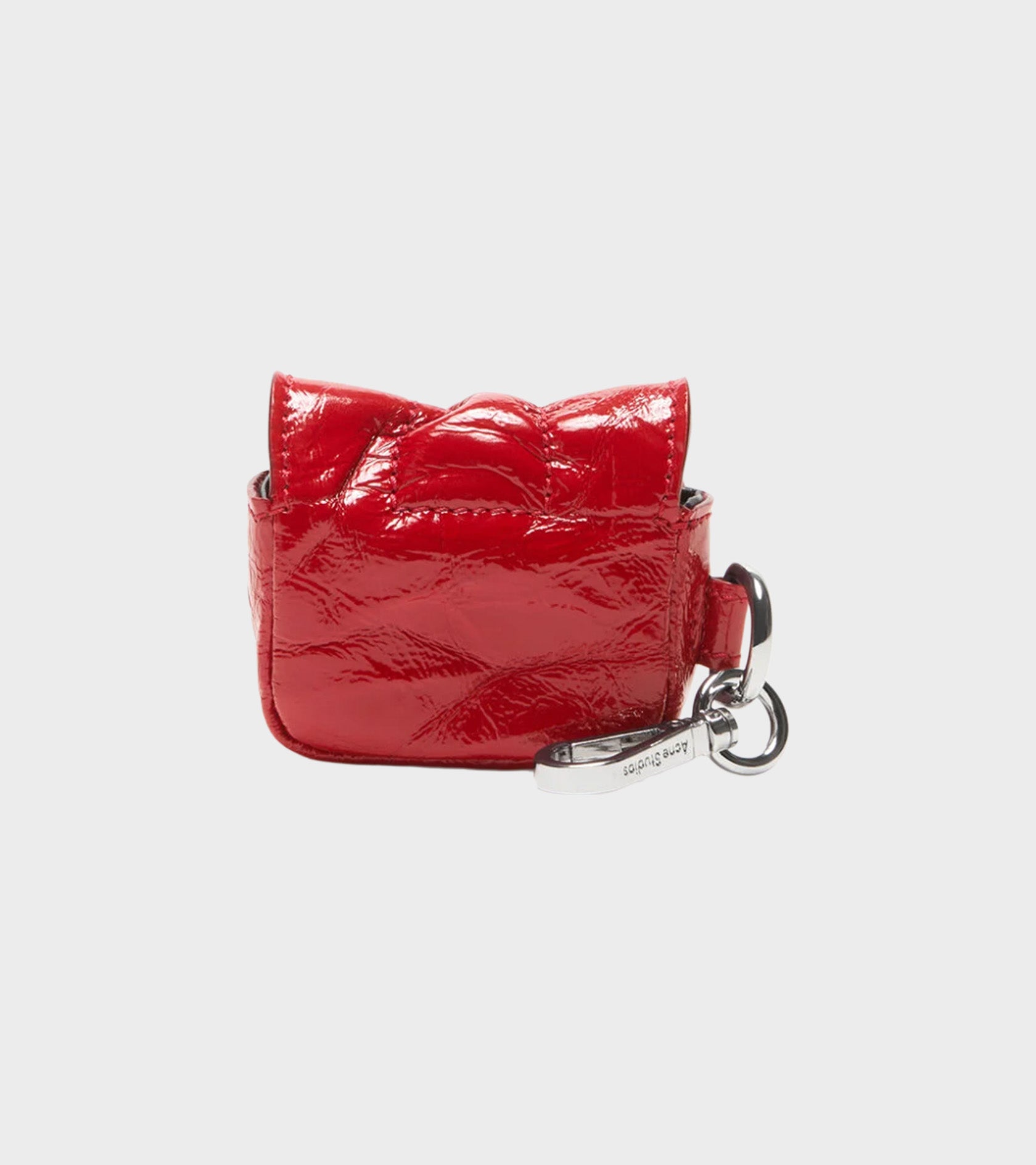 Mini taske i rødt lakeret læder fra Acne Studios. Den lille taske har sølv hardware, en karabinhage samt en trykknaplukning. Den kan bruges til evt. airpods.