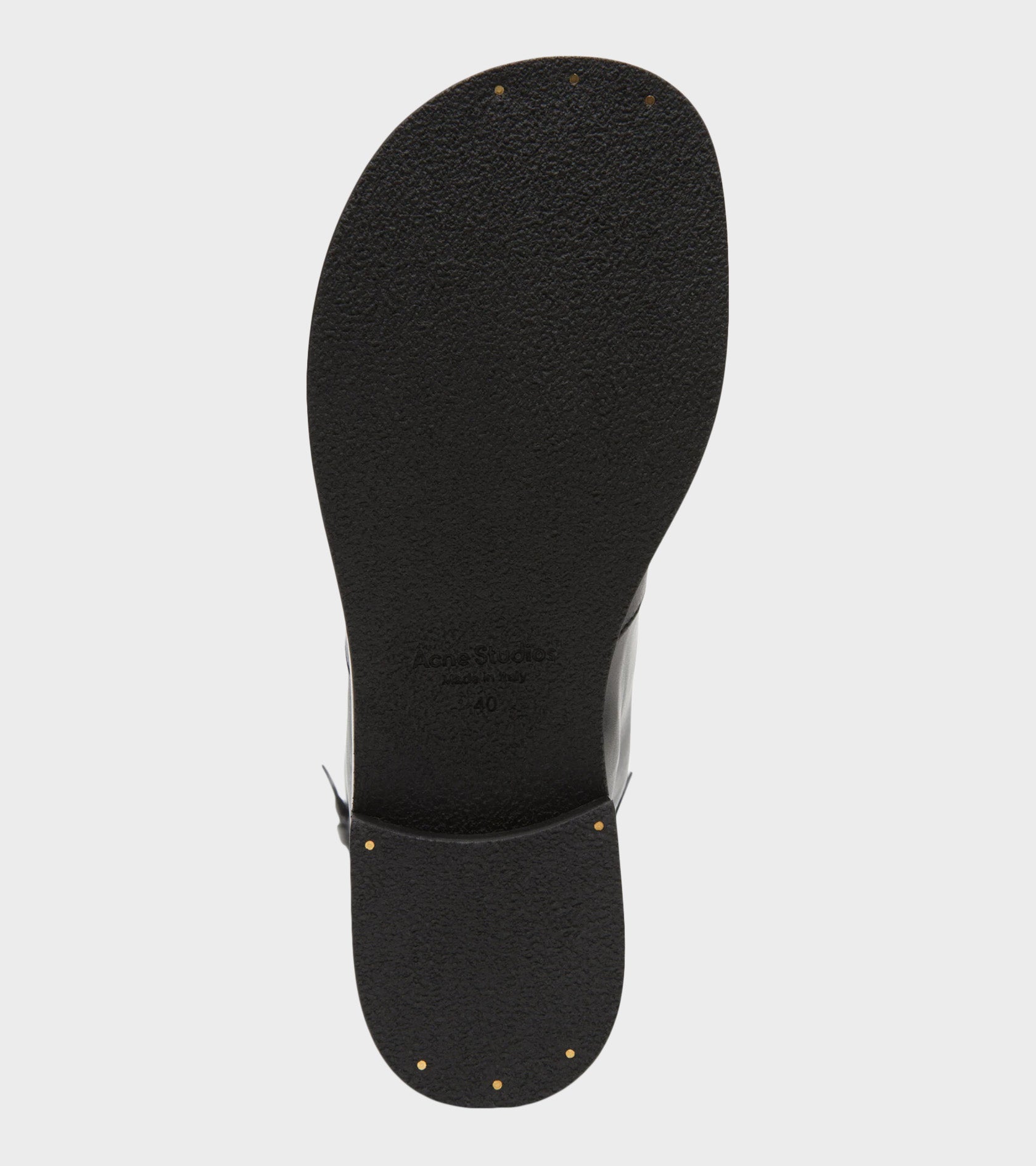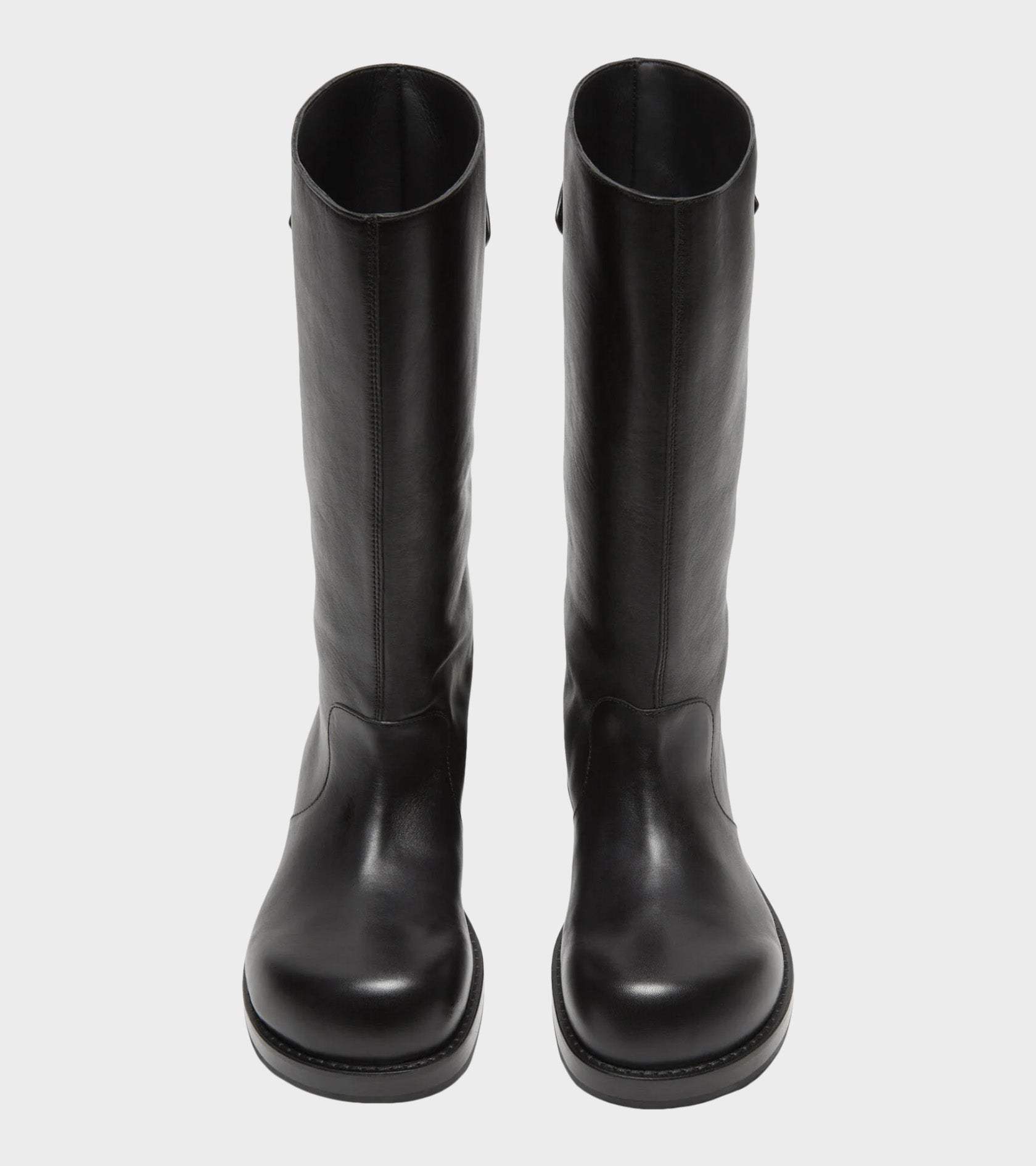 Sorte støvler i kalvelæder fra Acne Studios. Disse støvler har et højt skaft samt en bred rund snude. Øverst bagpå er en stropdetalje. Støvlen har et diskret præget logo på stroppen samt på sålen.