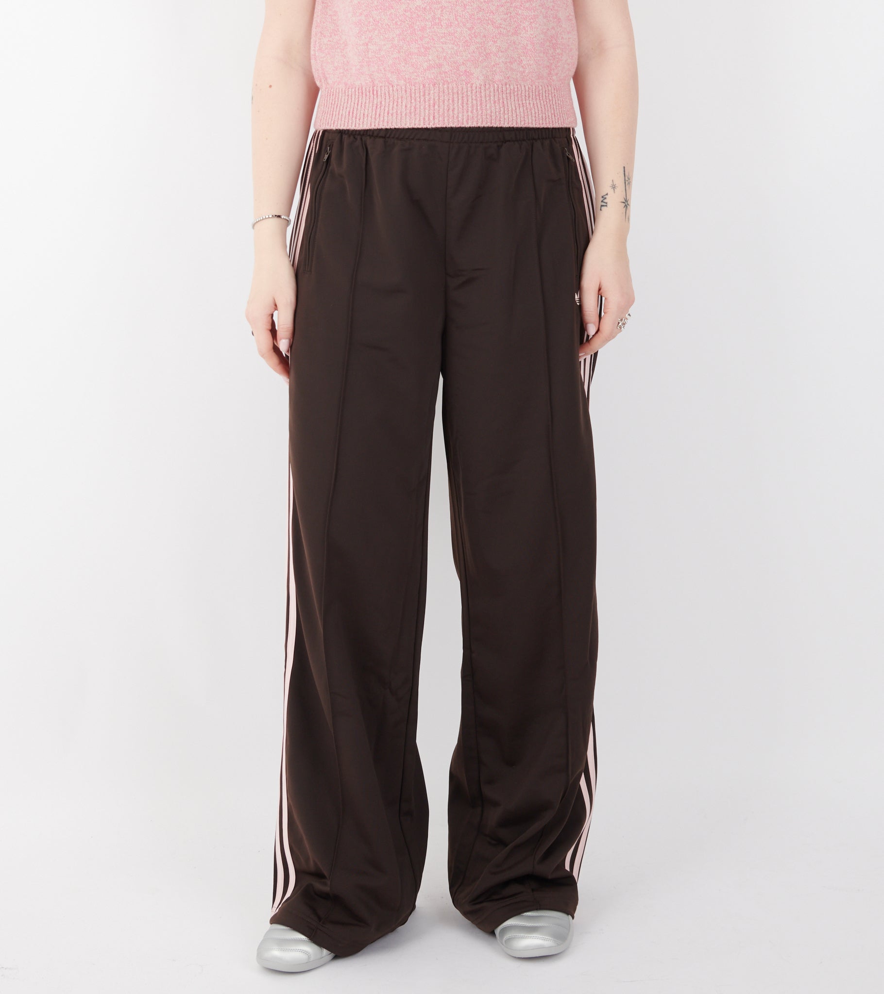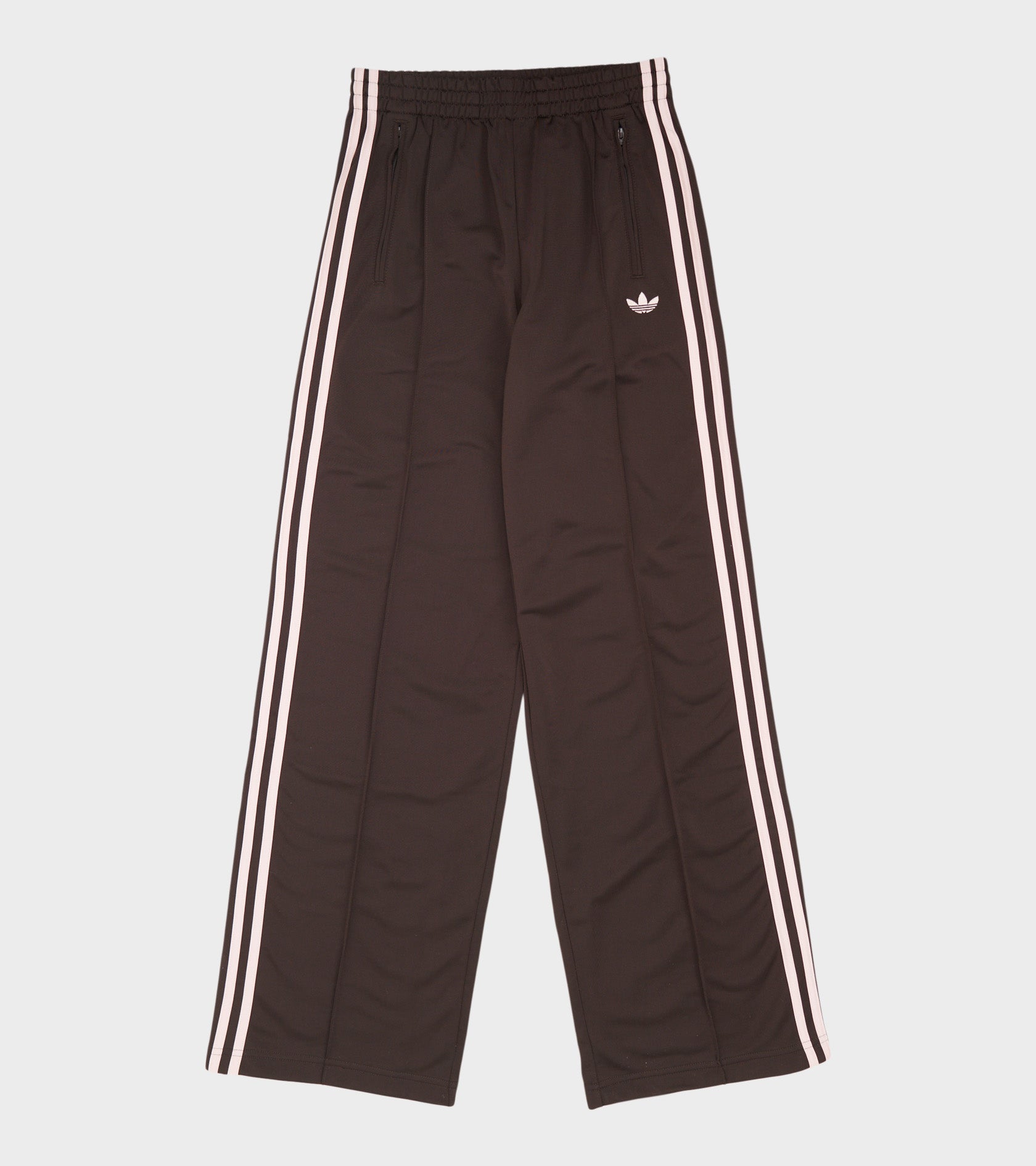 Brune trackpants med lyserøde detaljer fra Adidas. Disse trackpants har elastik og et indvendigt bindebånd i livet, en skrålomme i hver side og de ikoniske striber i lyserød ned langs siden. I venstre side er et broderet logo.