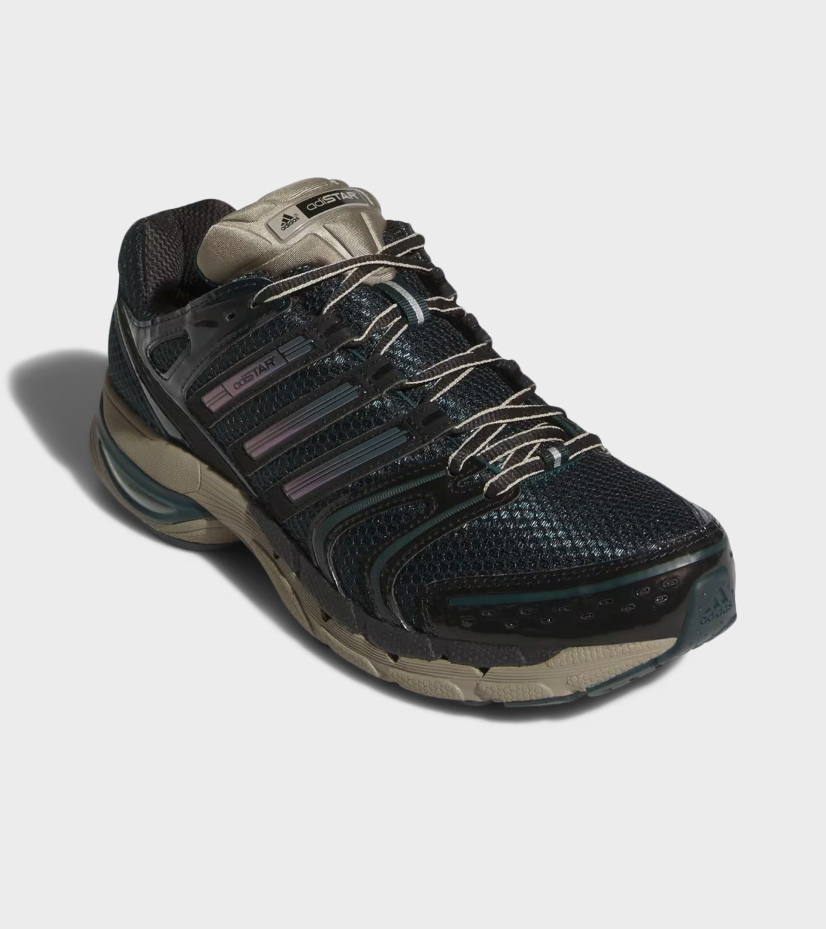 Adistar Control 5 fra Adidas. Disse sneakers har en overdel i sort mesh samt detaljer i en mørkegrøn og khaki-farvet nuance. På siden er de ikoniske striber.