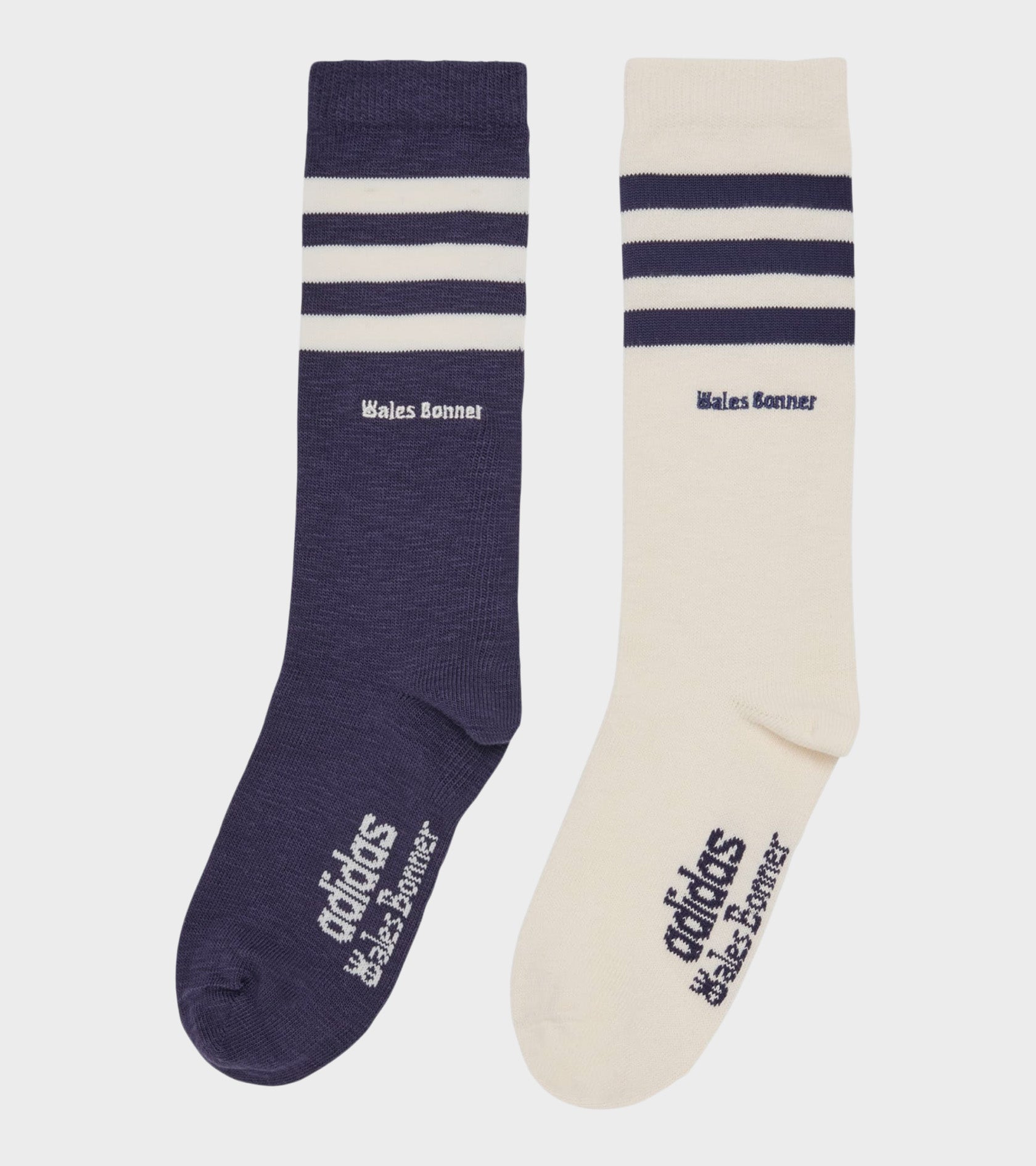 Strømper i bomuldsgarn fra Adidas i samarbejde med Wales Bonner. Pakken indeholder to par: ét par råhvide med navy striber og ét par råhvide med navy striber. På siden er et broderet Wales Bonner logo.