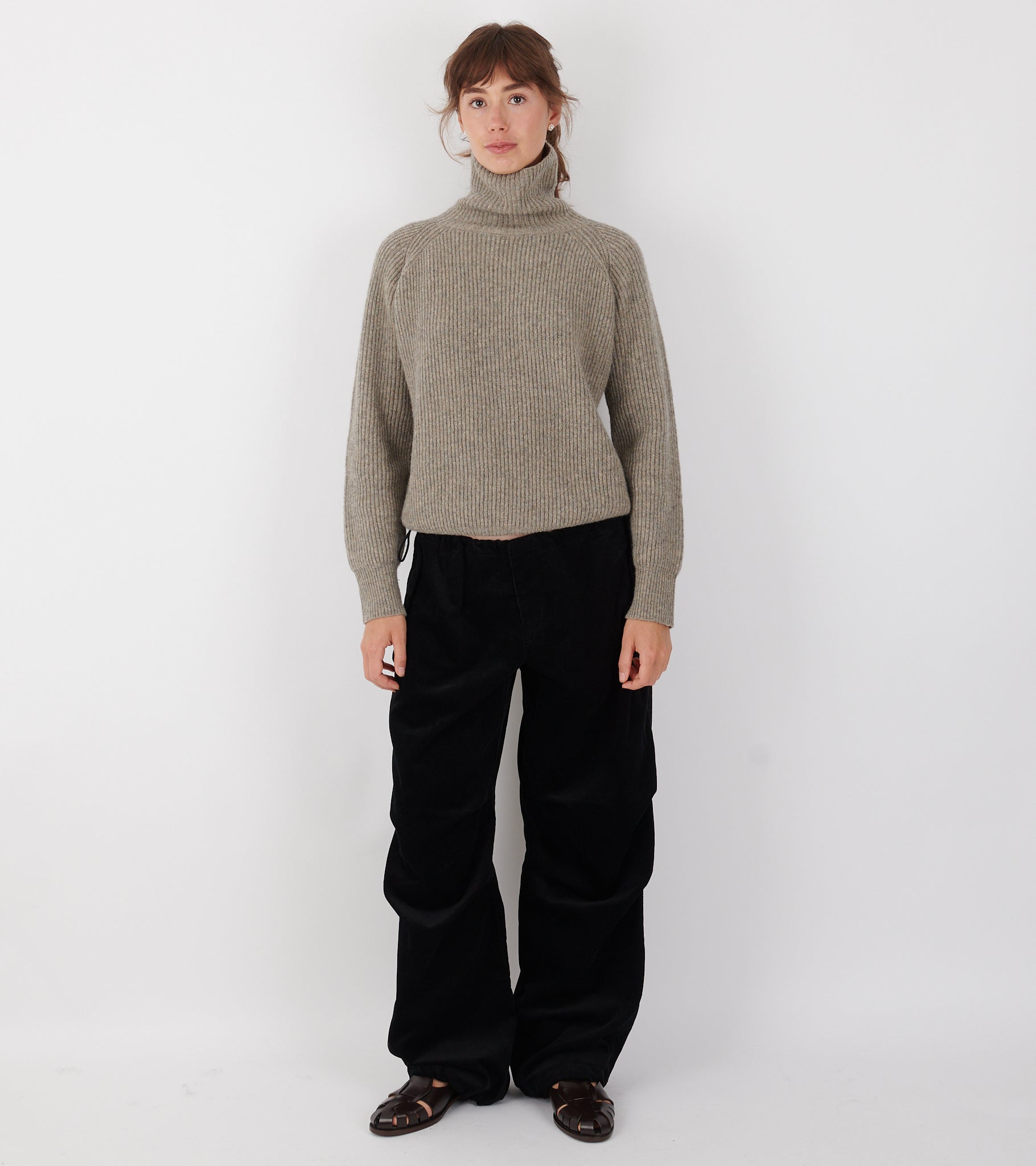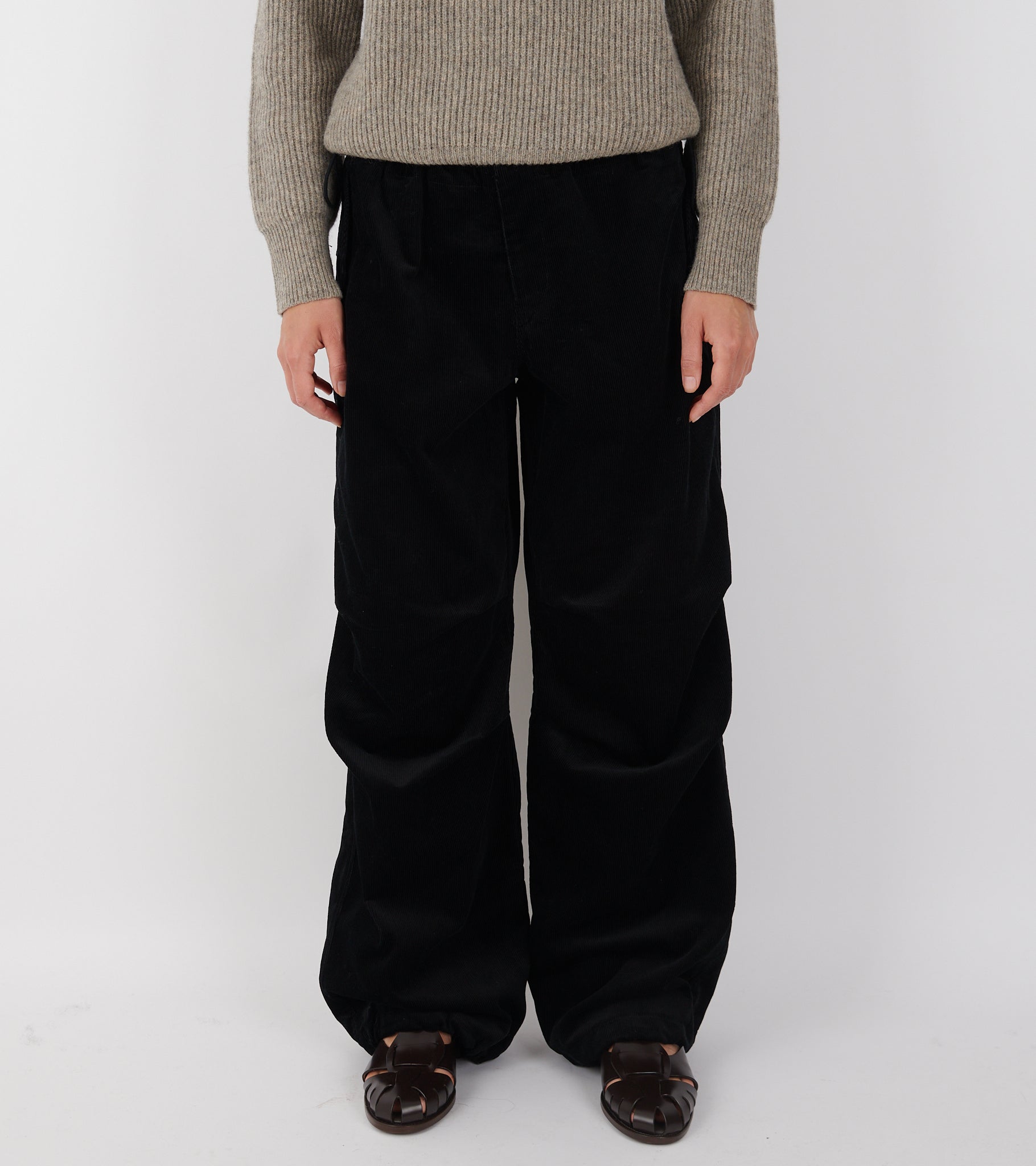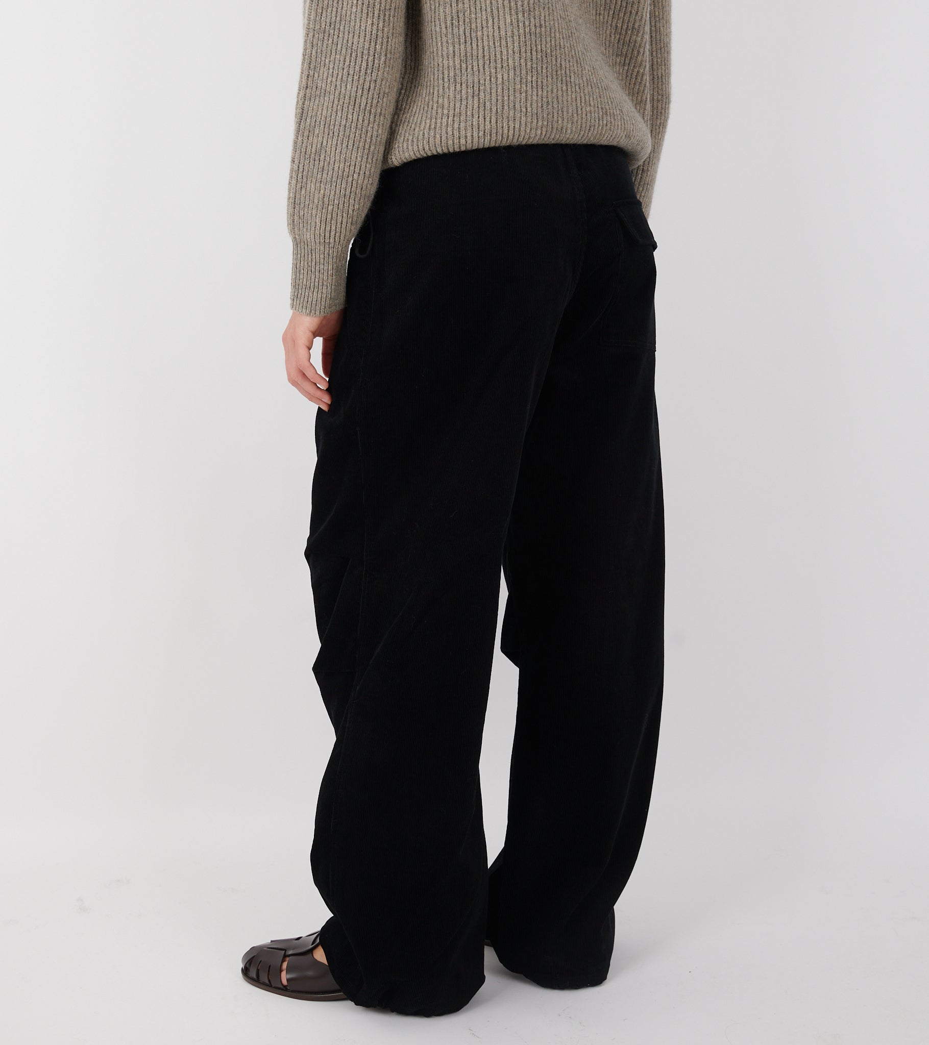 Sorte bukser i baby-bomuldsfløjl fra AF Agger. Disse bukser har en skjult knaplukning og en lynlåsgylp på fronten. I livet i hver side er en skjult justerbar elastiksnøre. Bukserne har en lomme med trykknaplukning i hver side, en lomme bagpå samt læg på fronten ved knæene. Pasformen er afslappet med en skjult justerbar elastiksnøre i buksernes ender, så de kan reguleres i vidden.