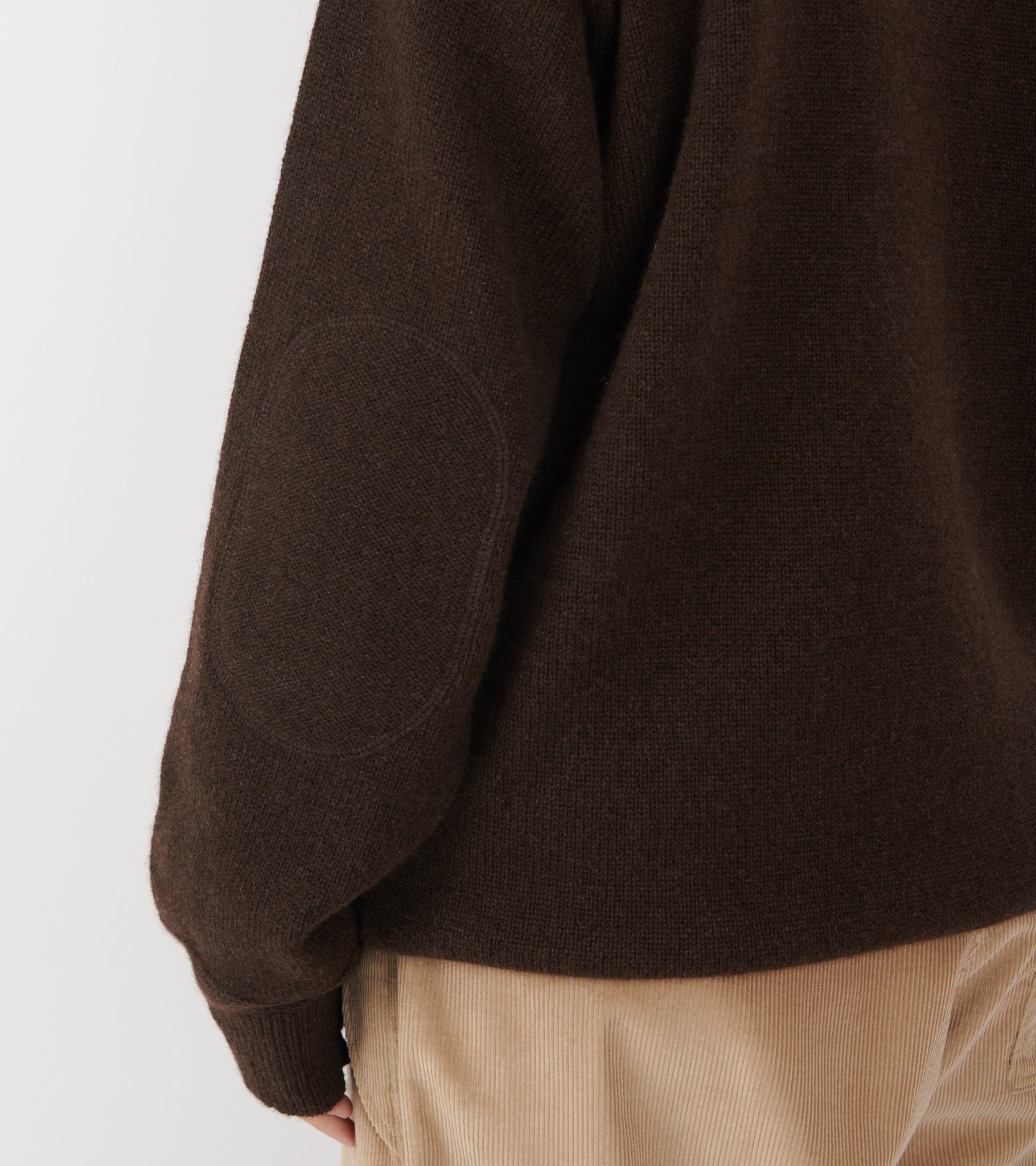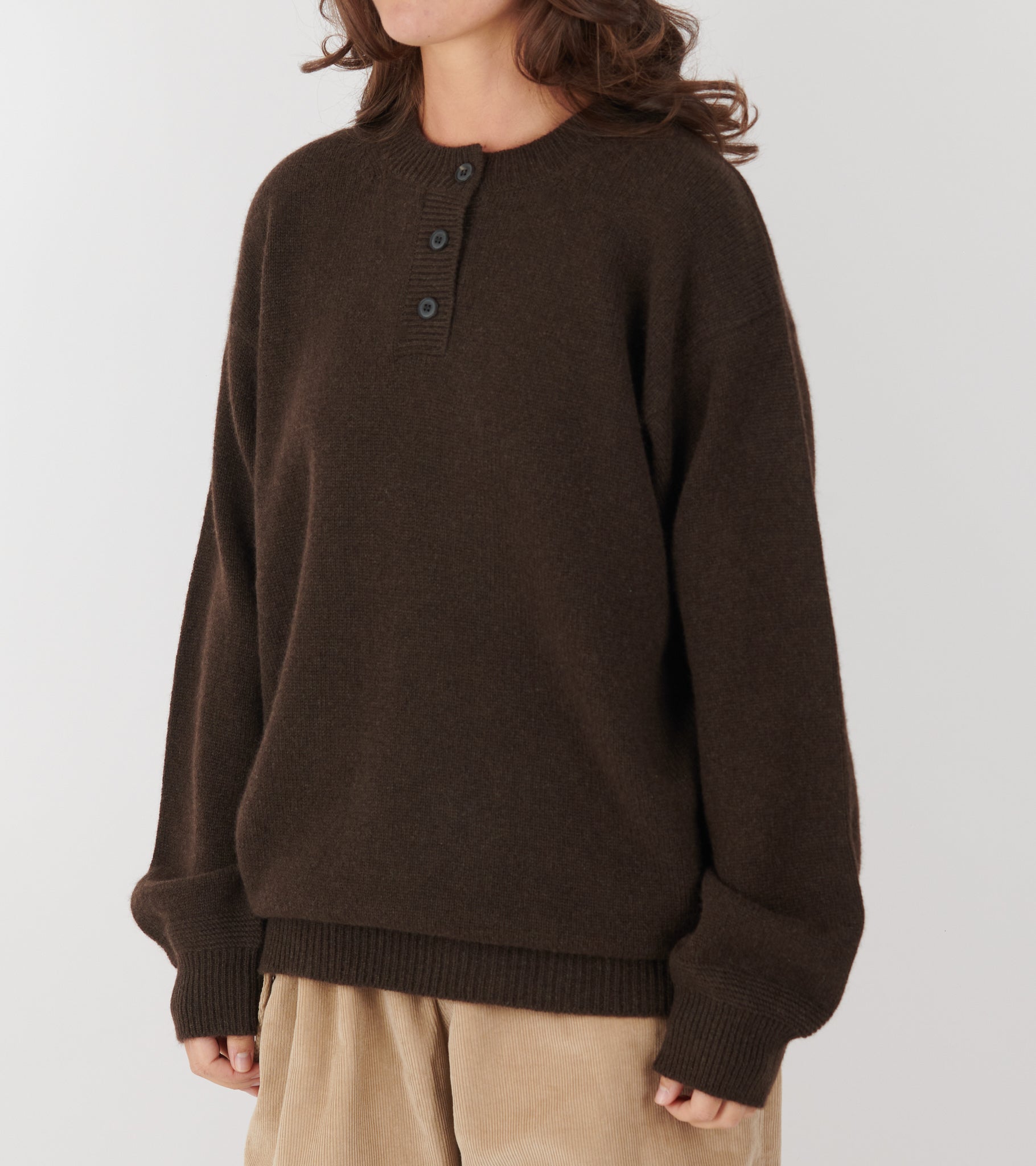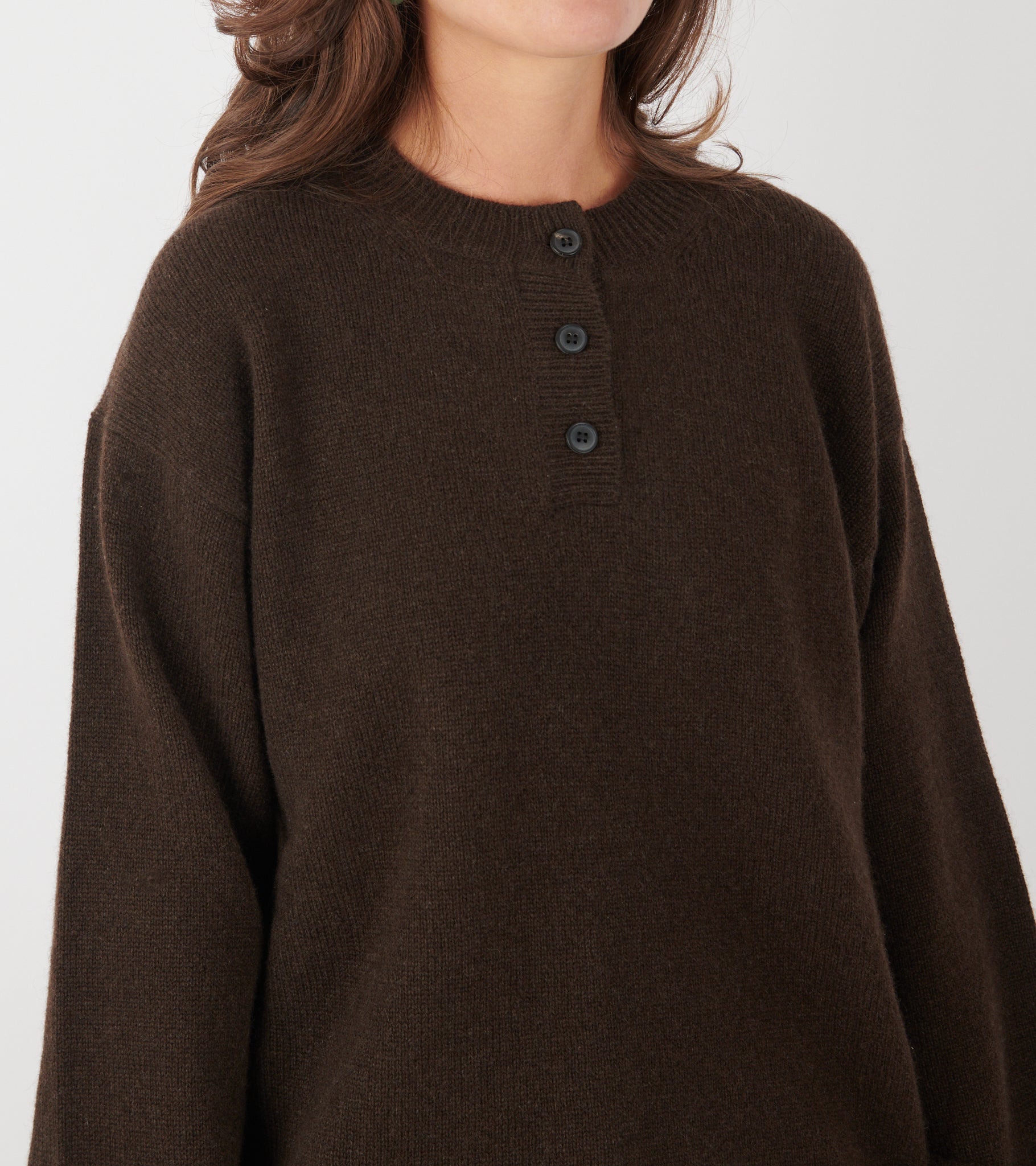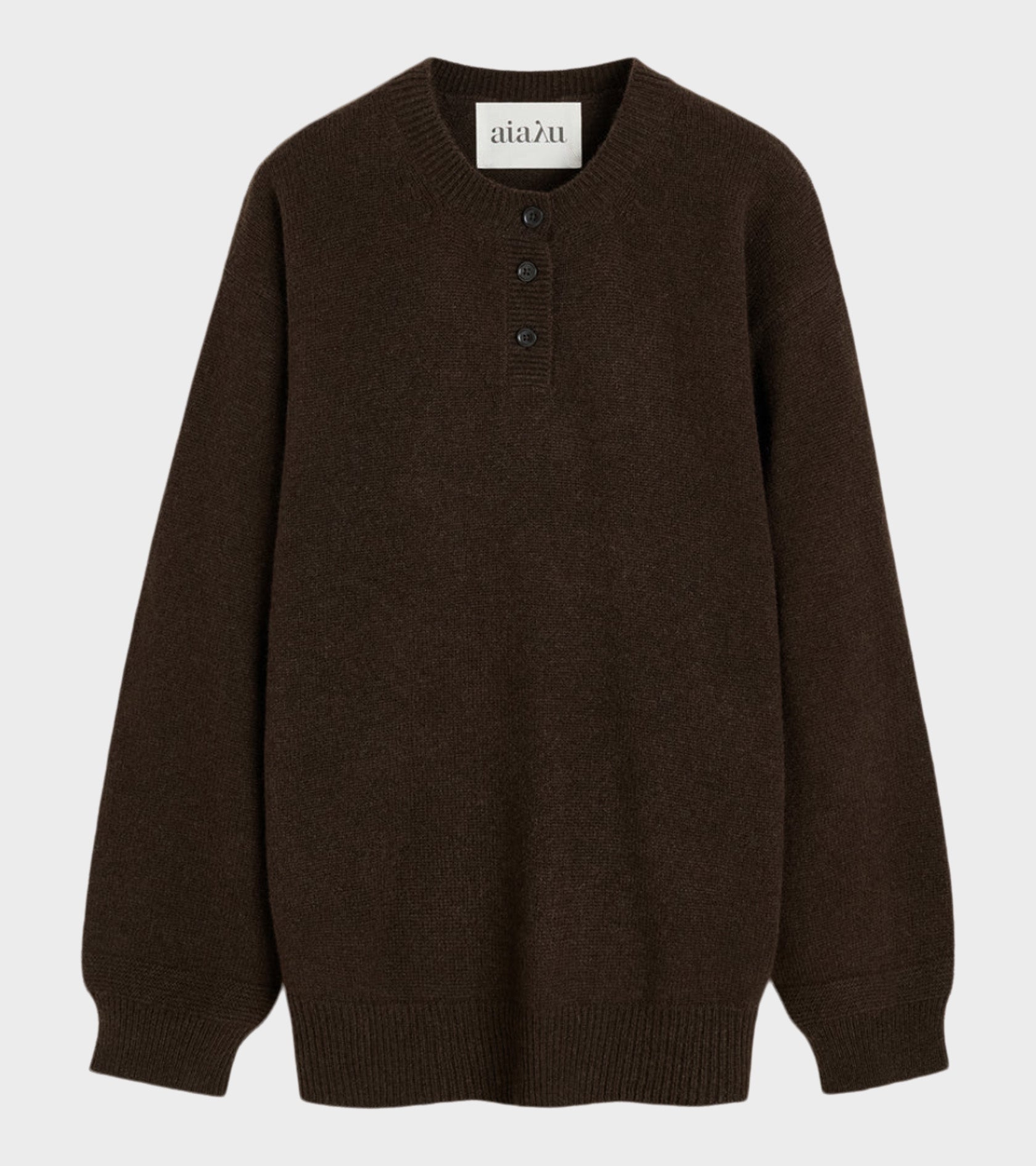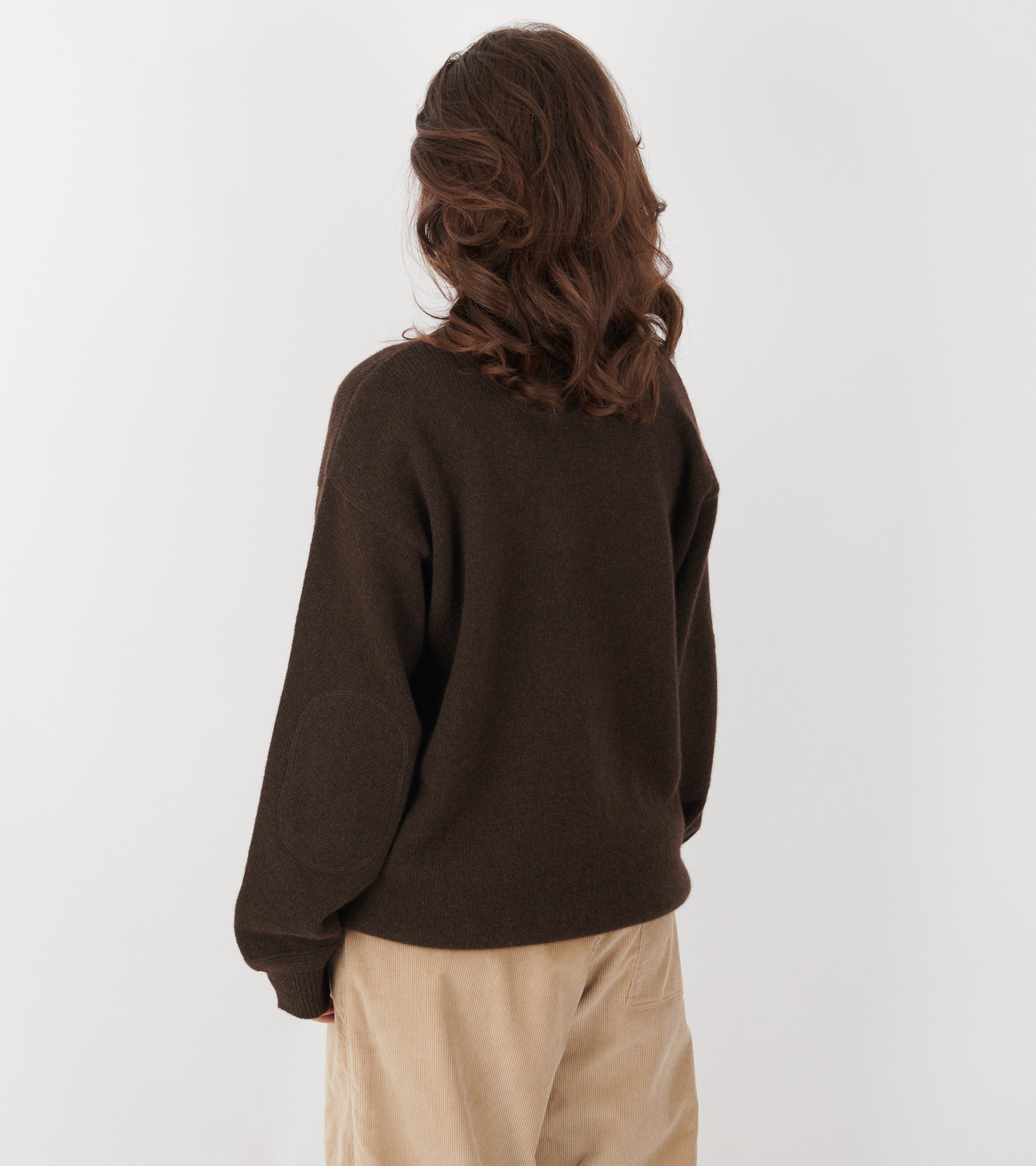 Mørkebrun strik fra Aiayu. Franco Sweater Pure Dark Brown er strikket i en blød og eksklusiv yakuld i et polo inspireret strikket mønster. Strikken har en rund hals med hornknapper samt patch-detaljer ved albuerne.