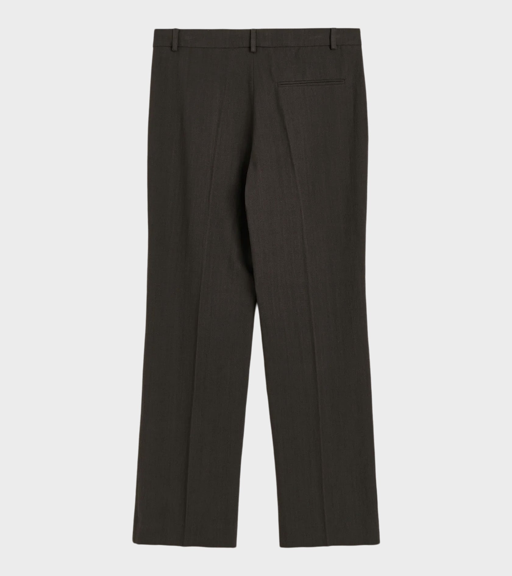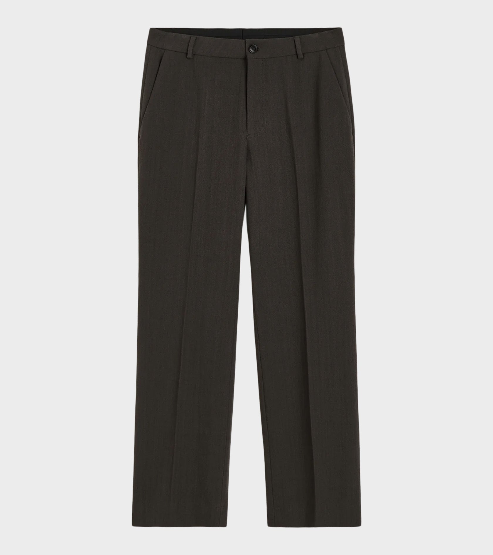 Mørkebrune suitbukser fra Aiayu. Milo Pant har bæltestropper, pressefolder, en skrålomme i hver side samt en paspoleret baglomme. Bukserne har lige ben med en smule svaj i bunden.