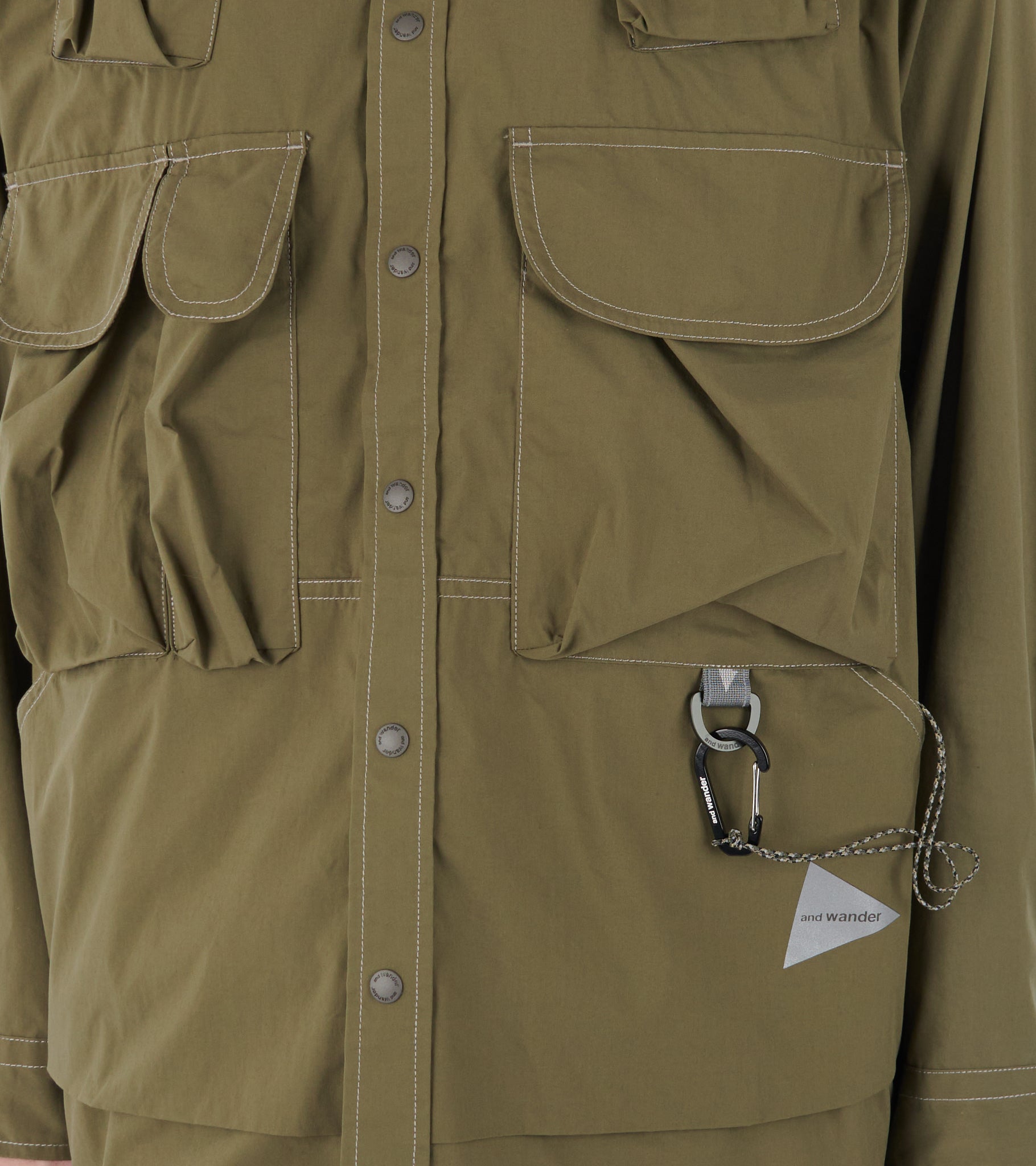 Olivengrøn skjorte fra And Wander. Skjorten har en klassisk krave, synlige syninger, en trykknaplukning samt syv lommer på fronten. På den ene lomme er et refleks-logo samt en aftagelig karabinhage.
