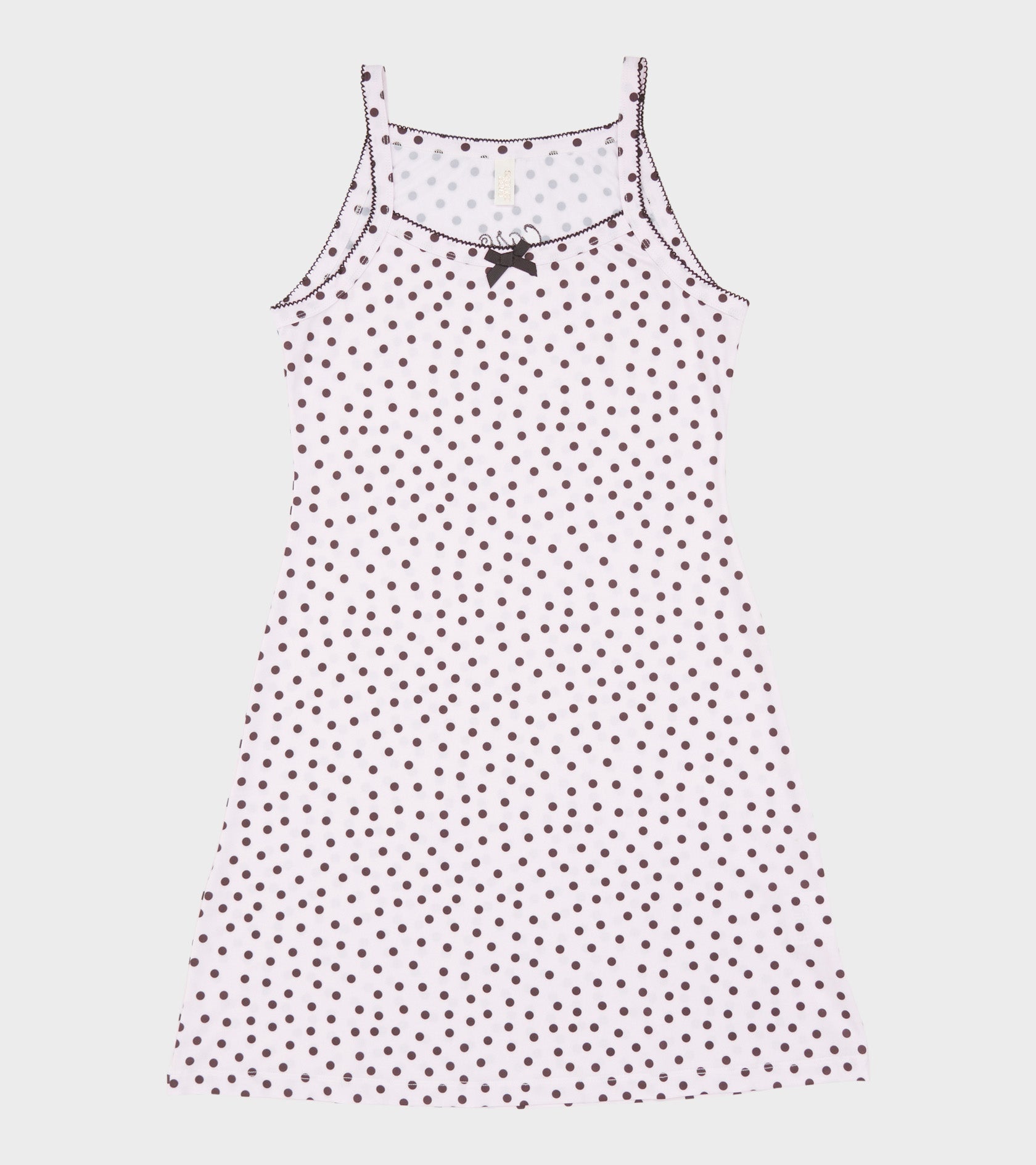 Kort lyserød kjole med sorte prikker og detaljer fra Caro Editions. Slip Dress Pink Dots er fremstillet i en strækbar polyesterkvalitet og har tynde stropper samt sorte bølgede kontrastkanter. Øverst på fronten er en lille sort sløjfe. Øverst bagpå er 'Caro' broderet i sort.
