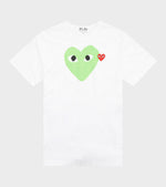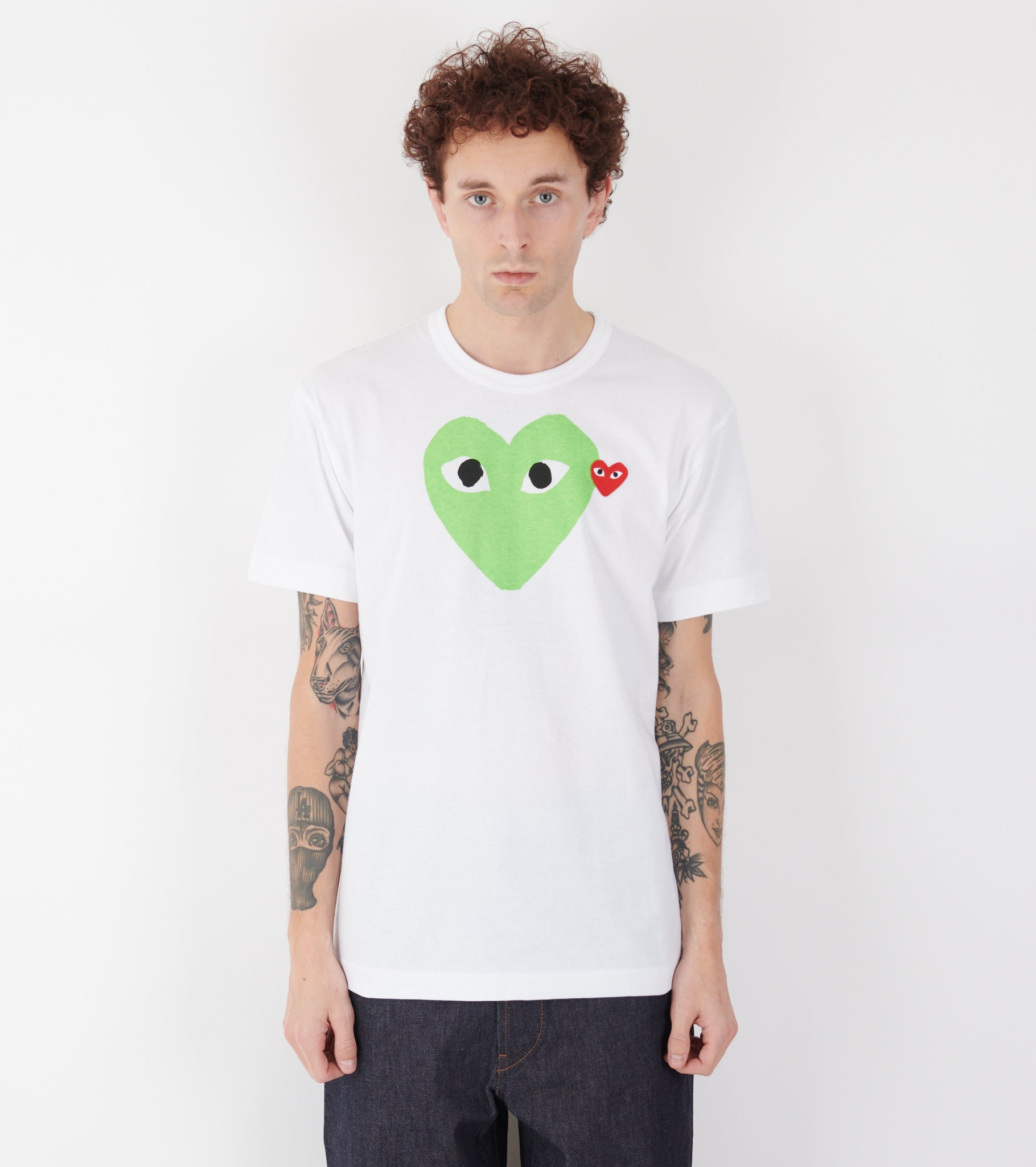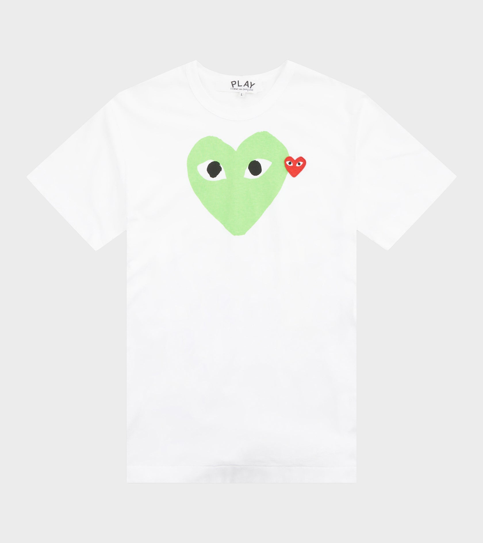 Hvid unisex t-shirt fra Comme des Garcons PLAY med mærkets karakteristiske hjerte med øjne. Det ikoniske hjerte med øjnene fra PLAY er designet af Filip Pagowski og er gennemgående på alle PLAY produkter. Denne t-shirt har et stort printet hjerte i grøn samt et lille broderet hjerte i rød ved venstre bryst.