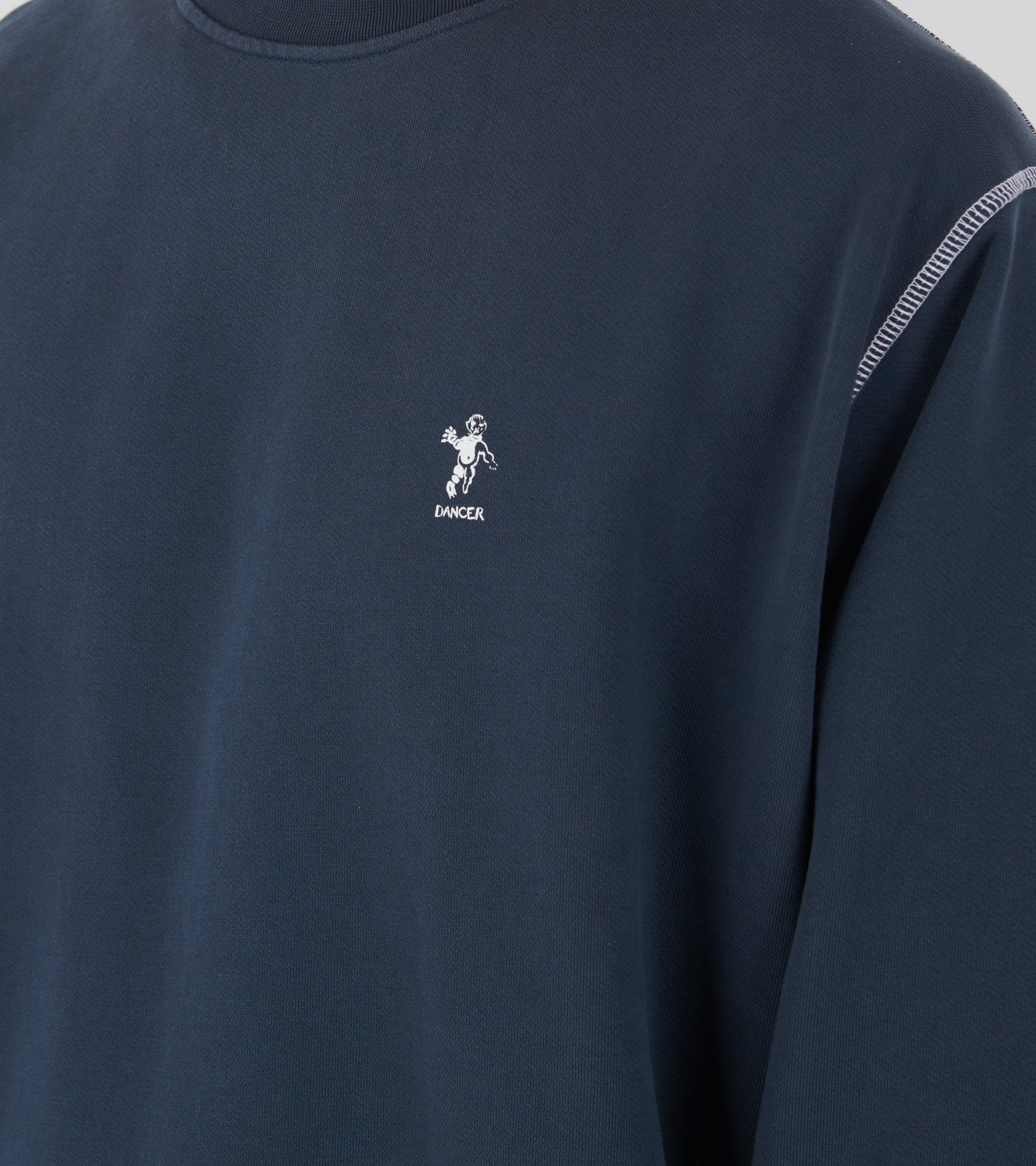 Navy sweatshirt fra Dancer. Denne sweatshirt har synlige hvide syninger samt et logo ved venstre bryst.