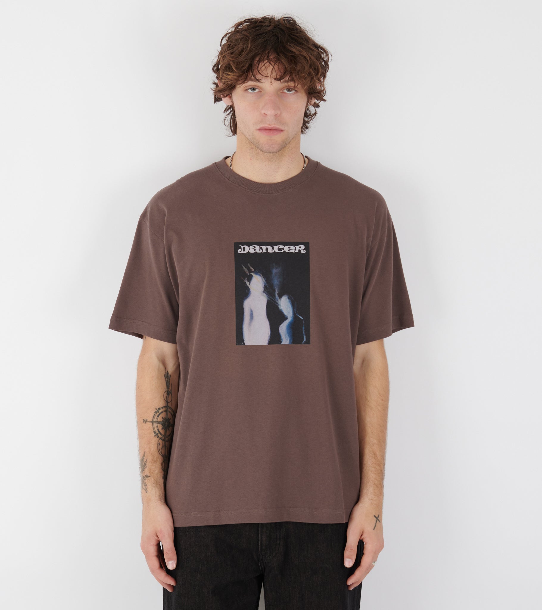 Brun t-shirt i økologisk bomuld fra Dancer. T-shirten har logoprint på fronten.