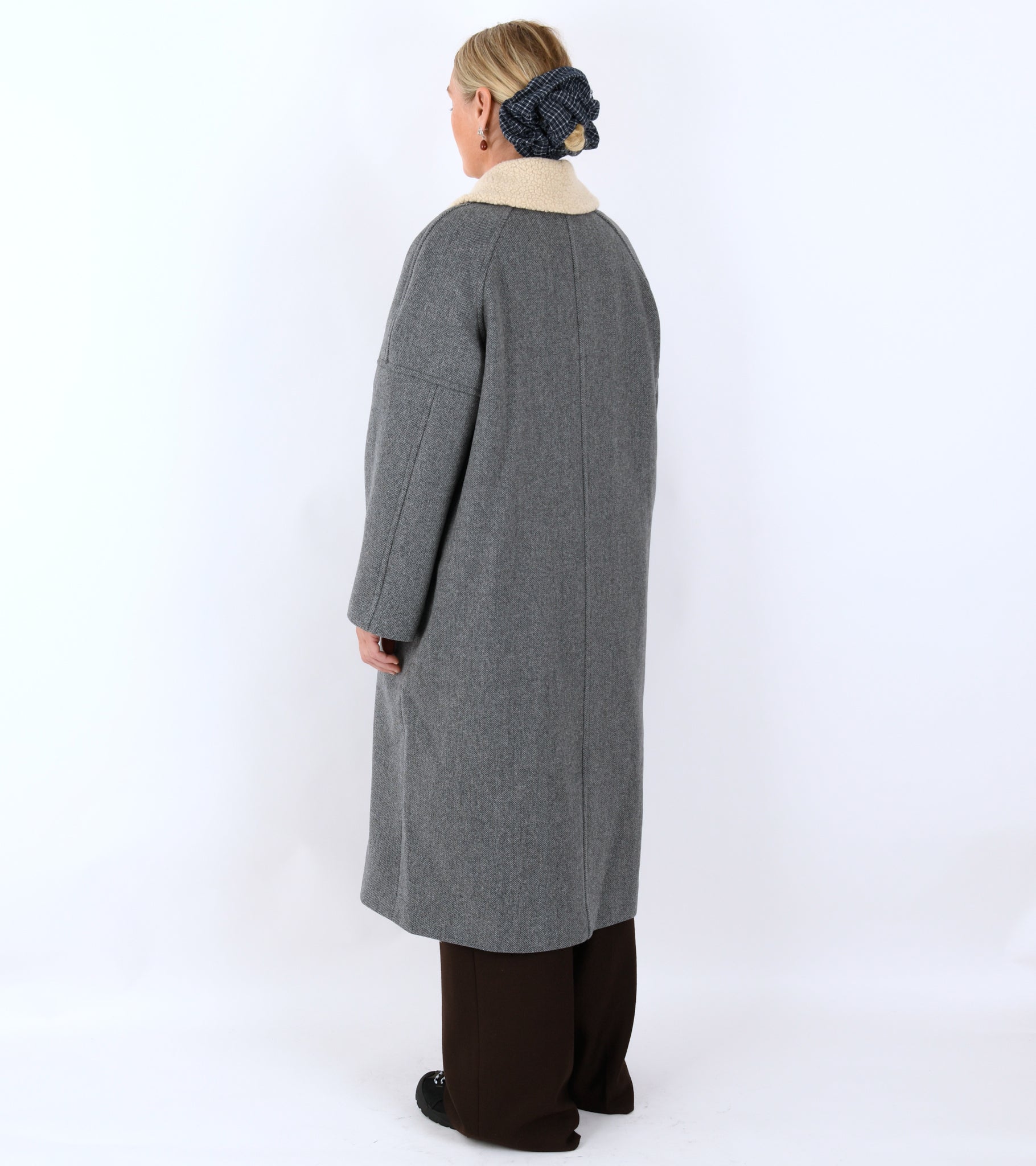 Grå lang frakke i genanvendt 100% uld fra Skall Studio.