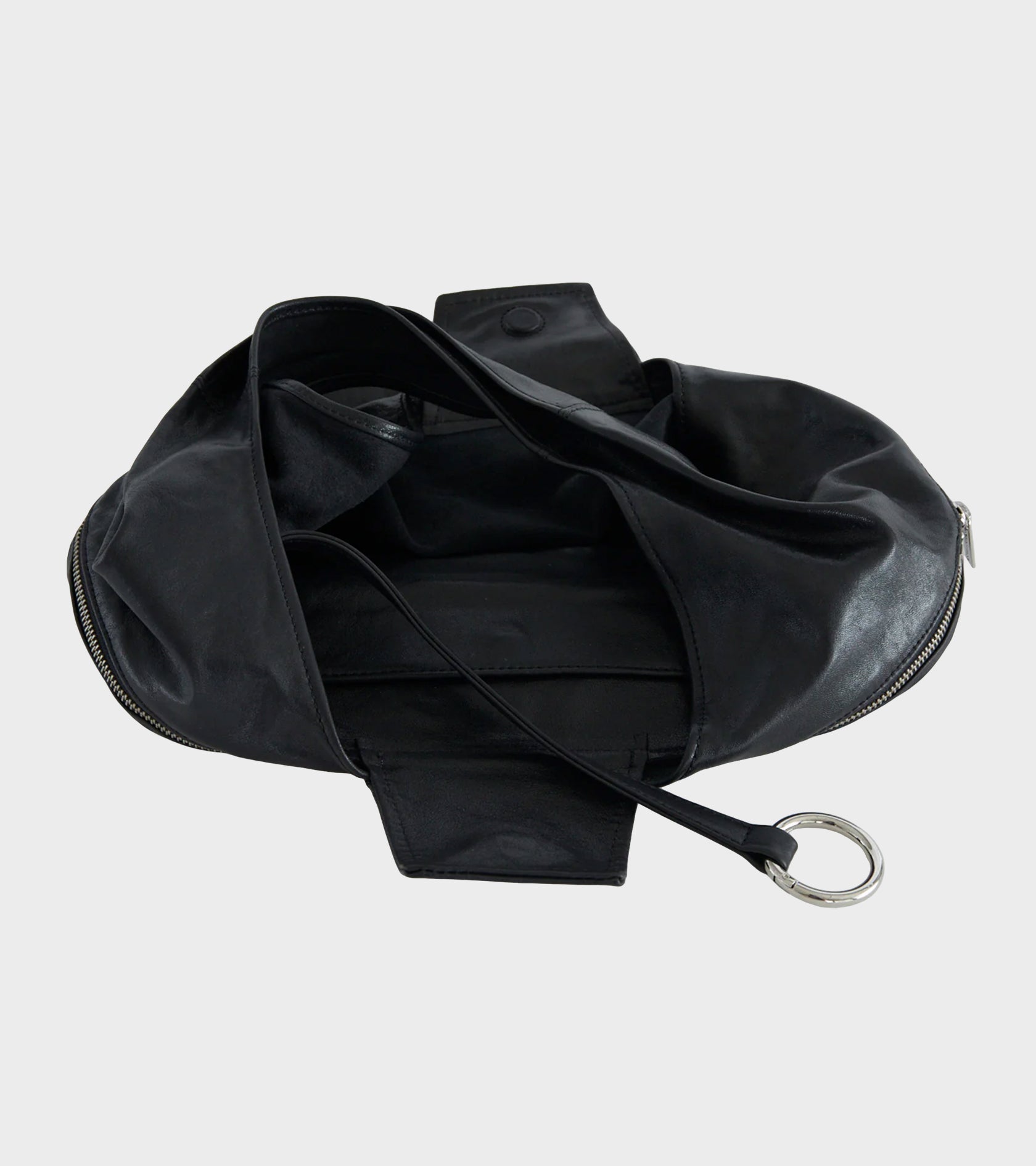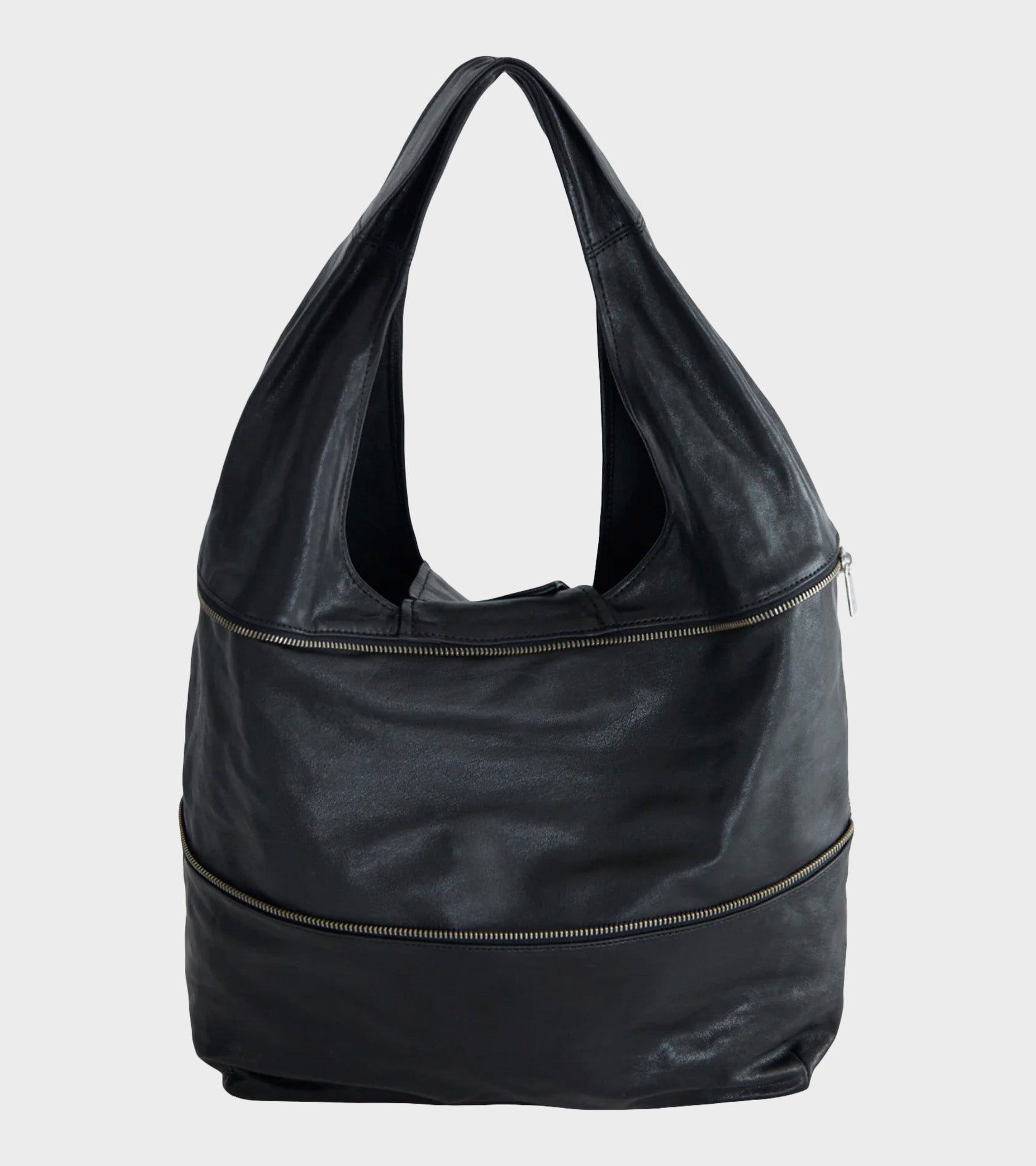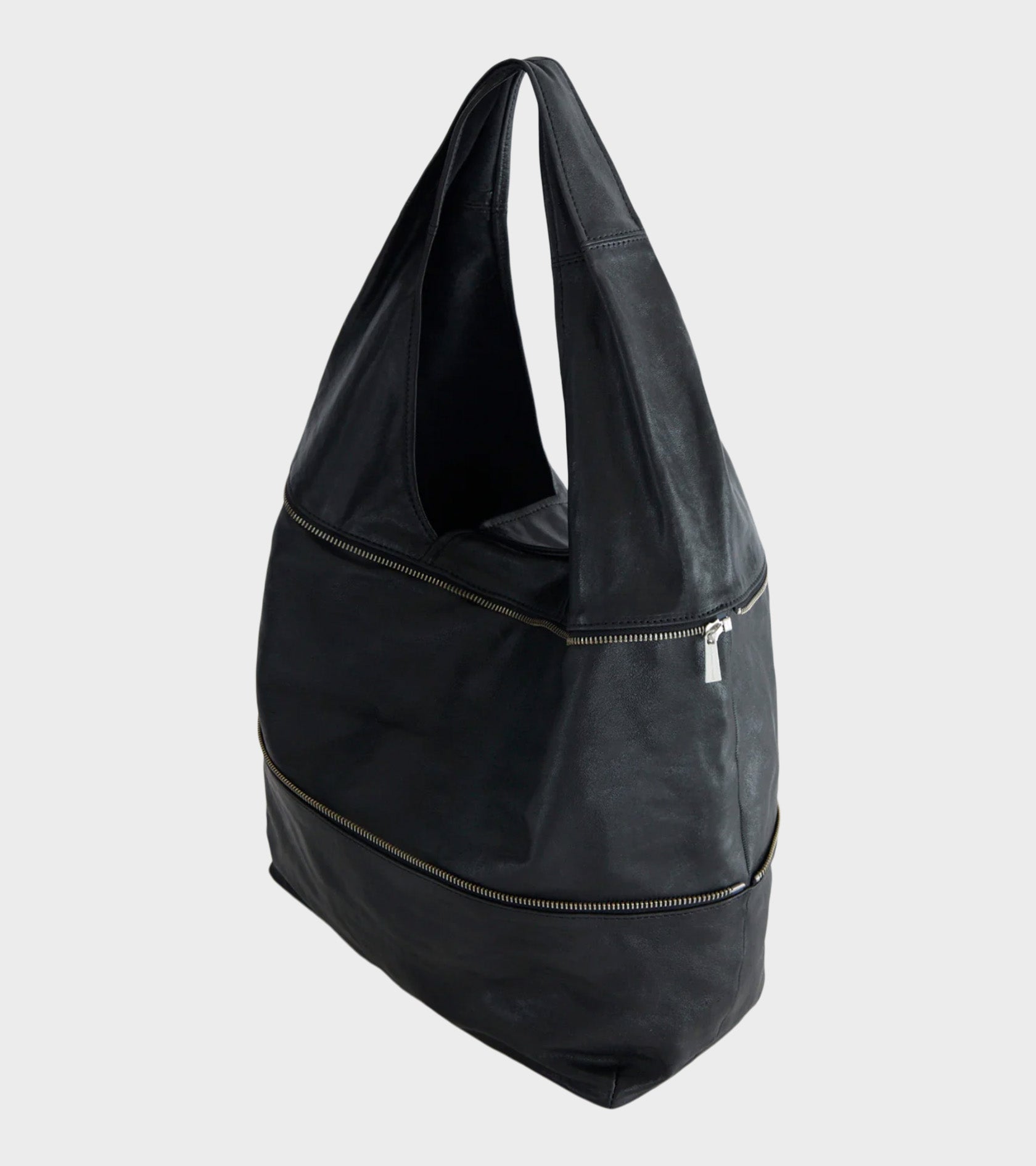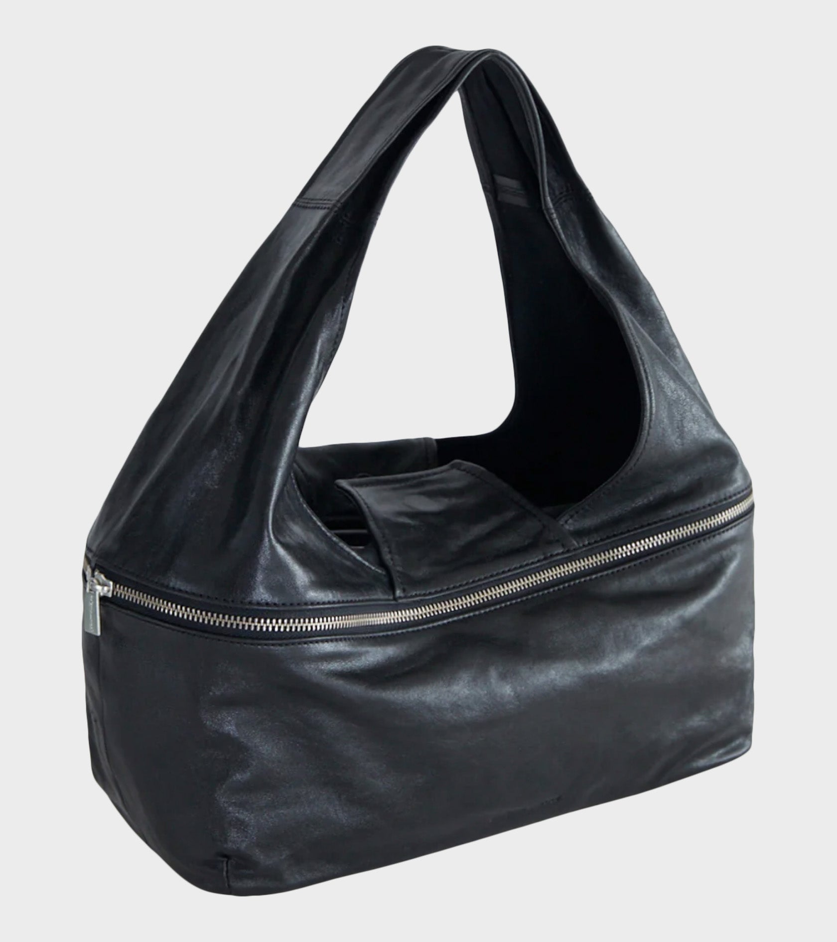 Sort taske fra Paloma Wool. Riba Zip Bag er fremstillet i blødt og let skinnende læder. Tasken kan laves til en mindre skuldertaske via den synlige lynlås. Den har en skulderhank, en magnetisk knaplukning øverst, ét stort centralt rum samt en lille indvendig lomme. Tasken har sølv hardware og en indvendig snor med en rund key-ring. Nederst på fronten er et lille præget logo.