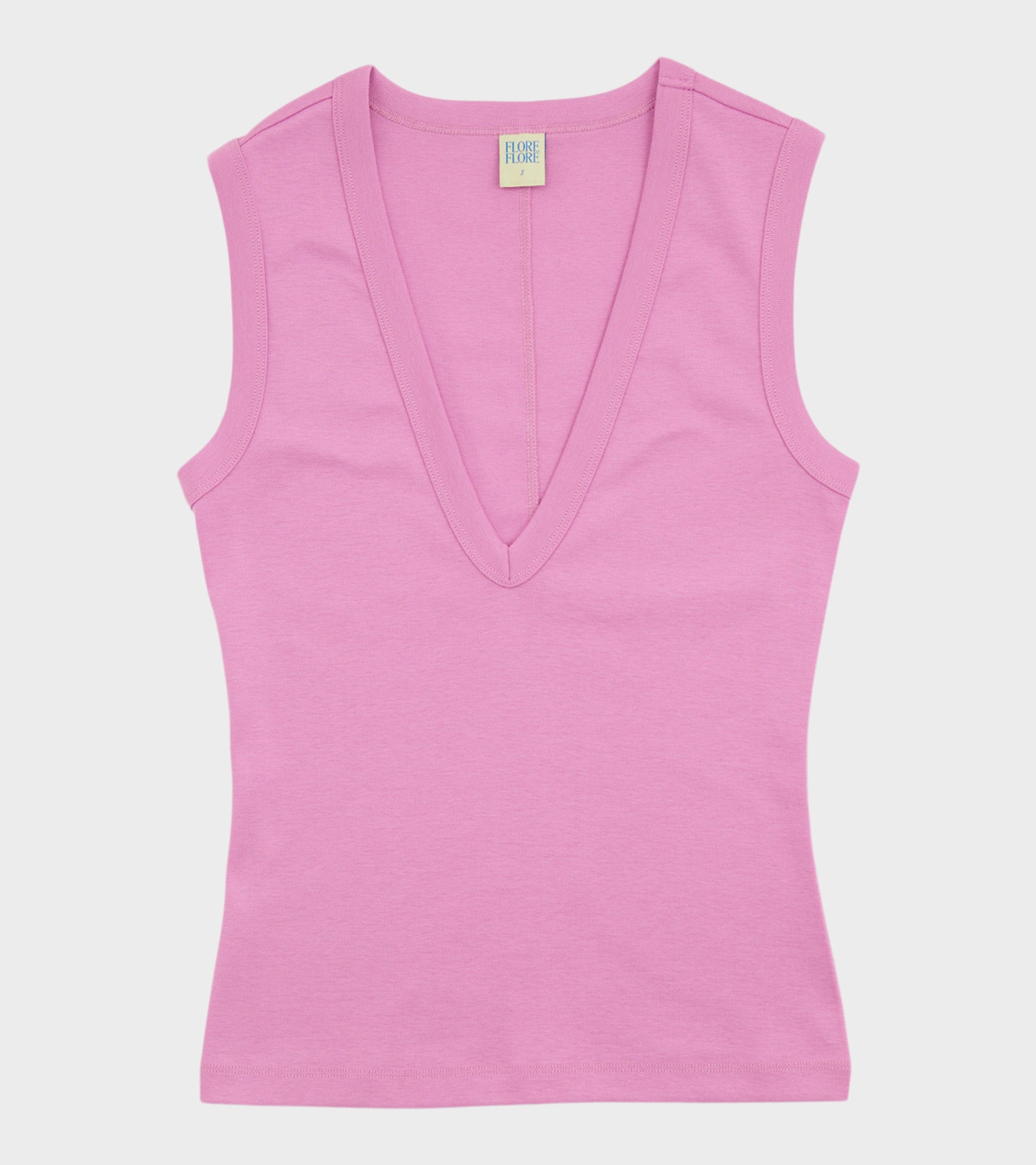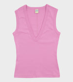 Pink tank top fra Flore Flore. Dewi Tank er fremstillet i en 'medium weight' økologisk bomuldskvalitet og har en dyb v-udskæring på fronten.