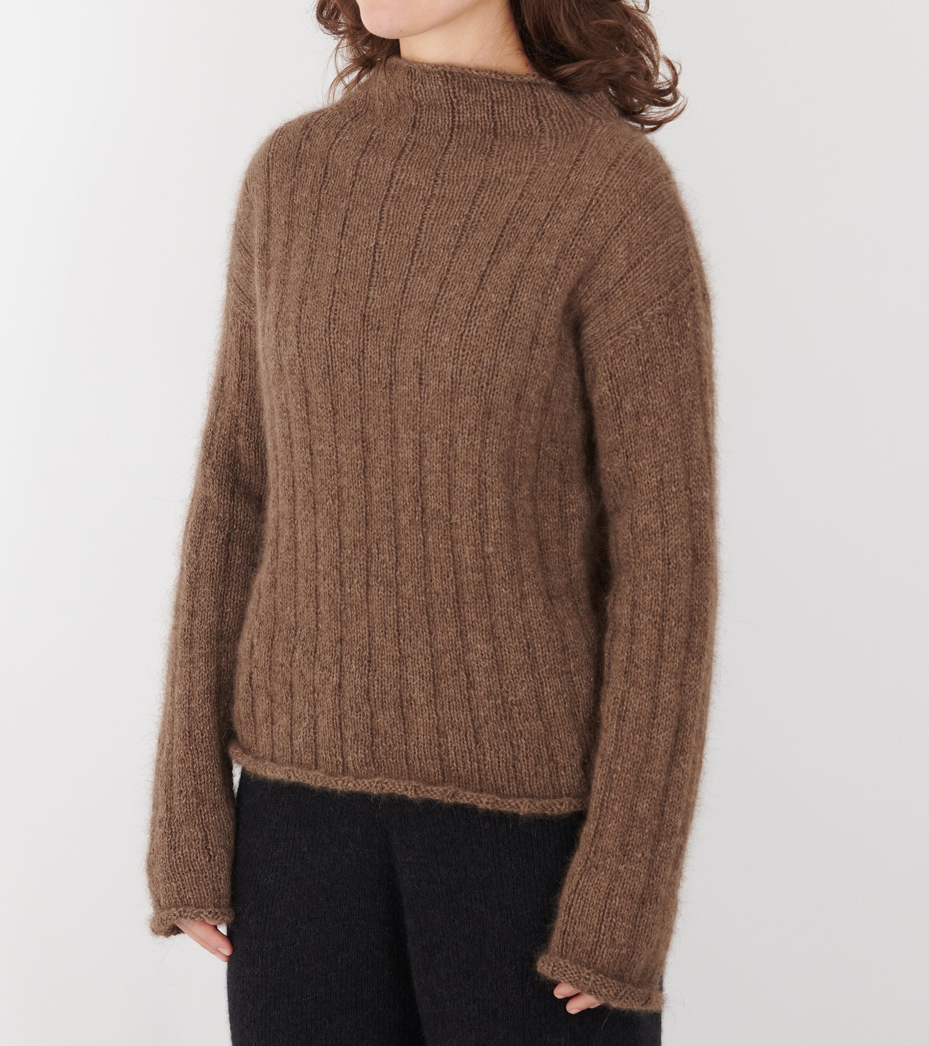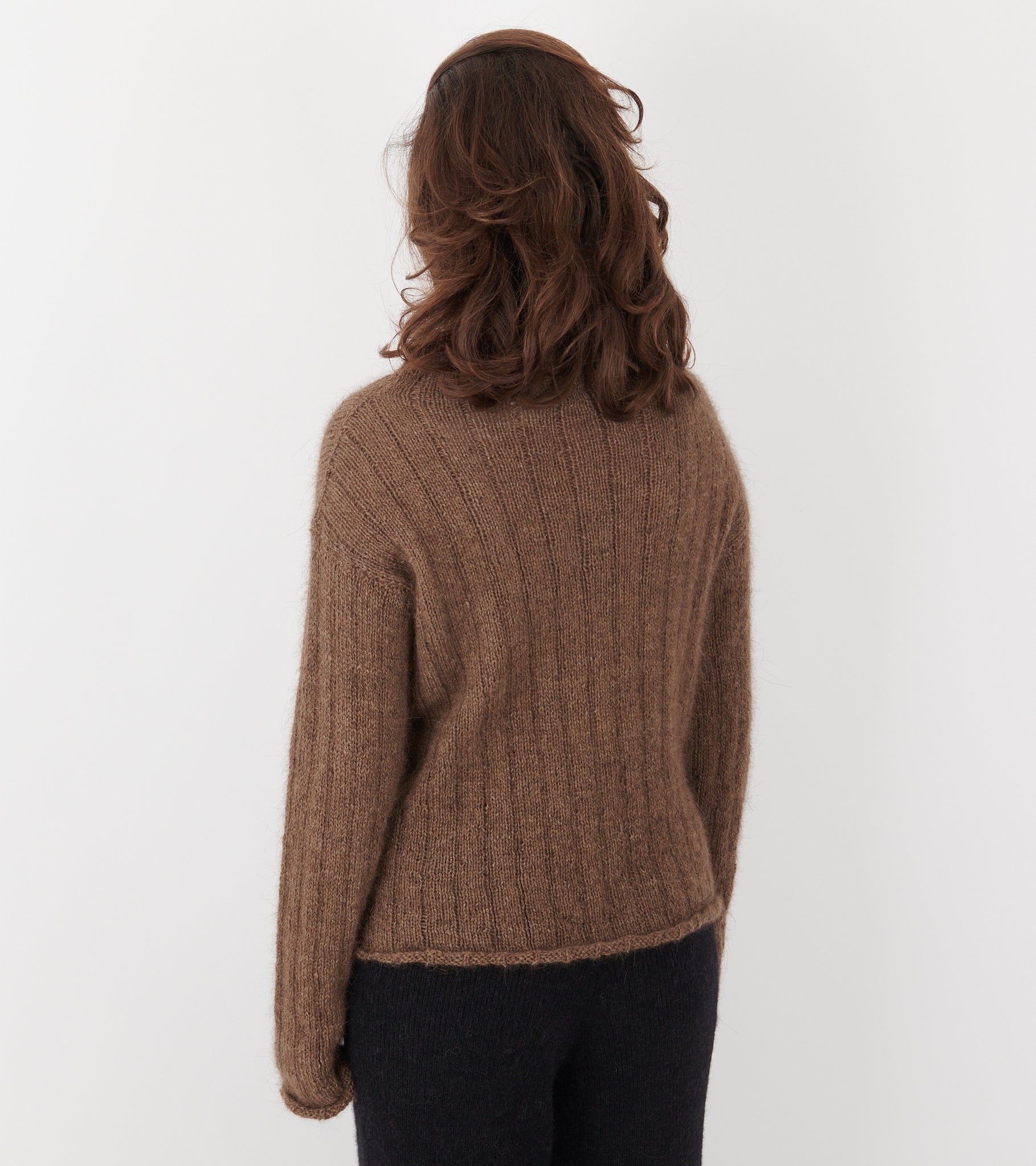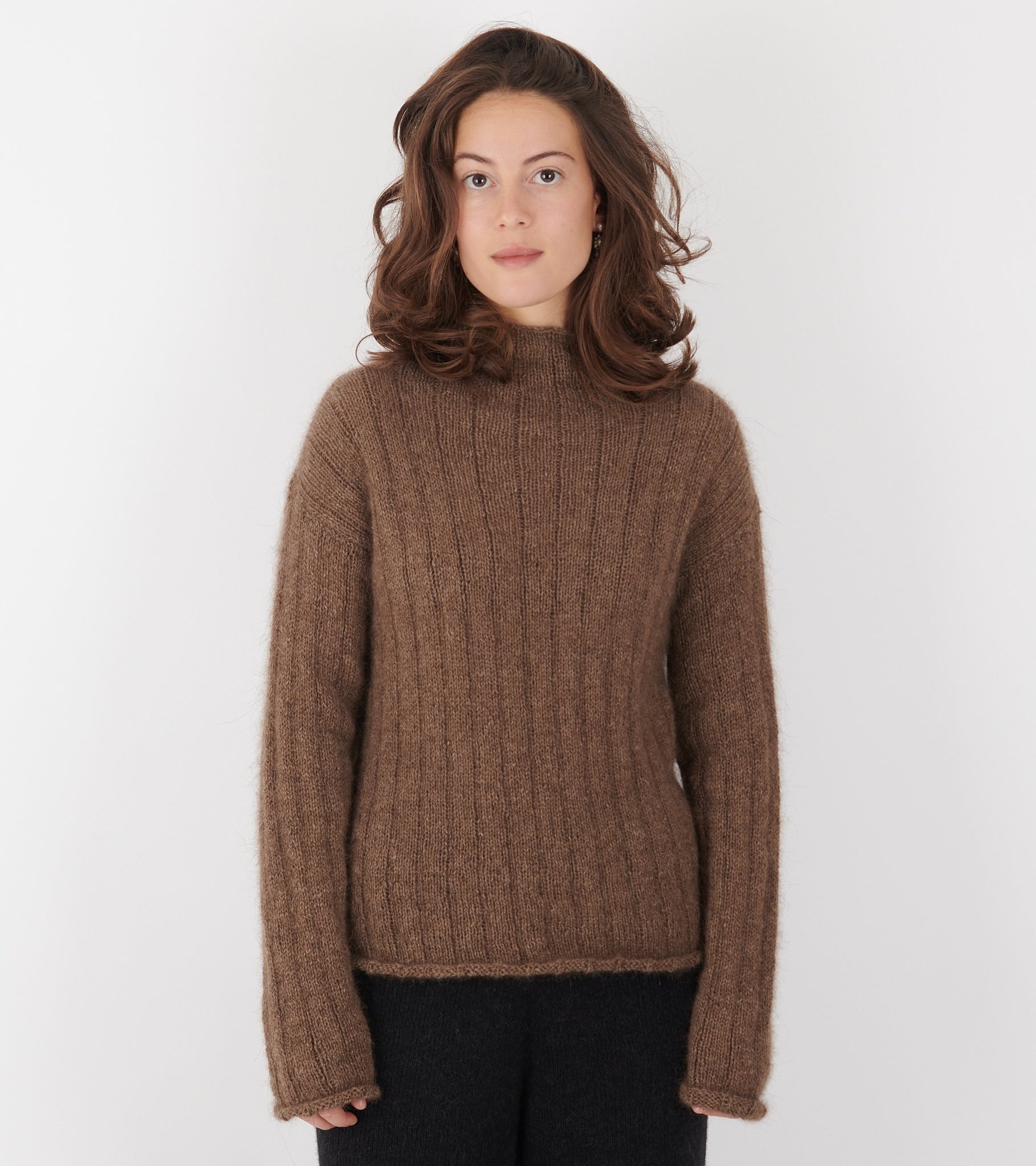 Brun strik i moskusgarn fra Gudrun & Gudrun. Moskus Sweater har rullede ender samt en bred og let høj hals.
