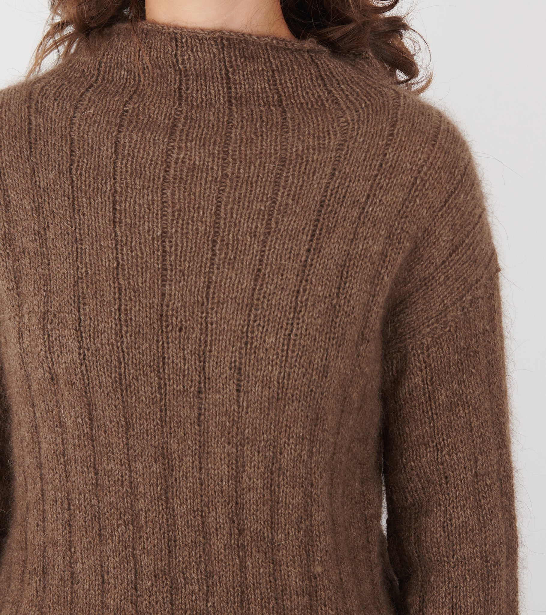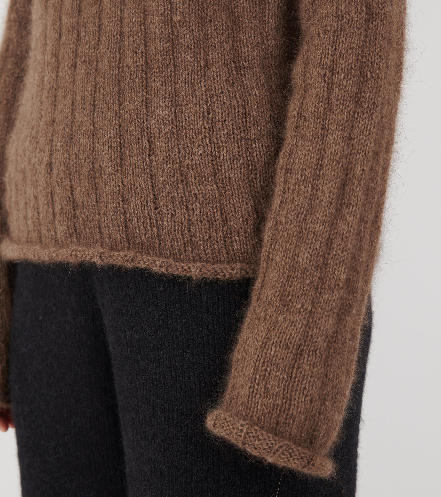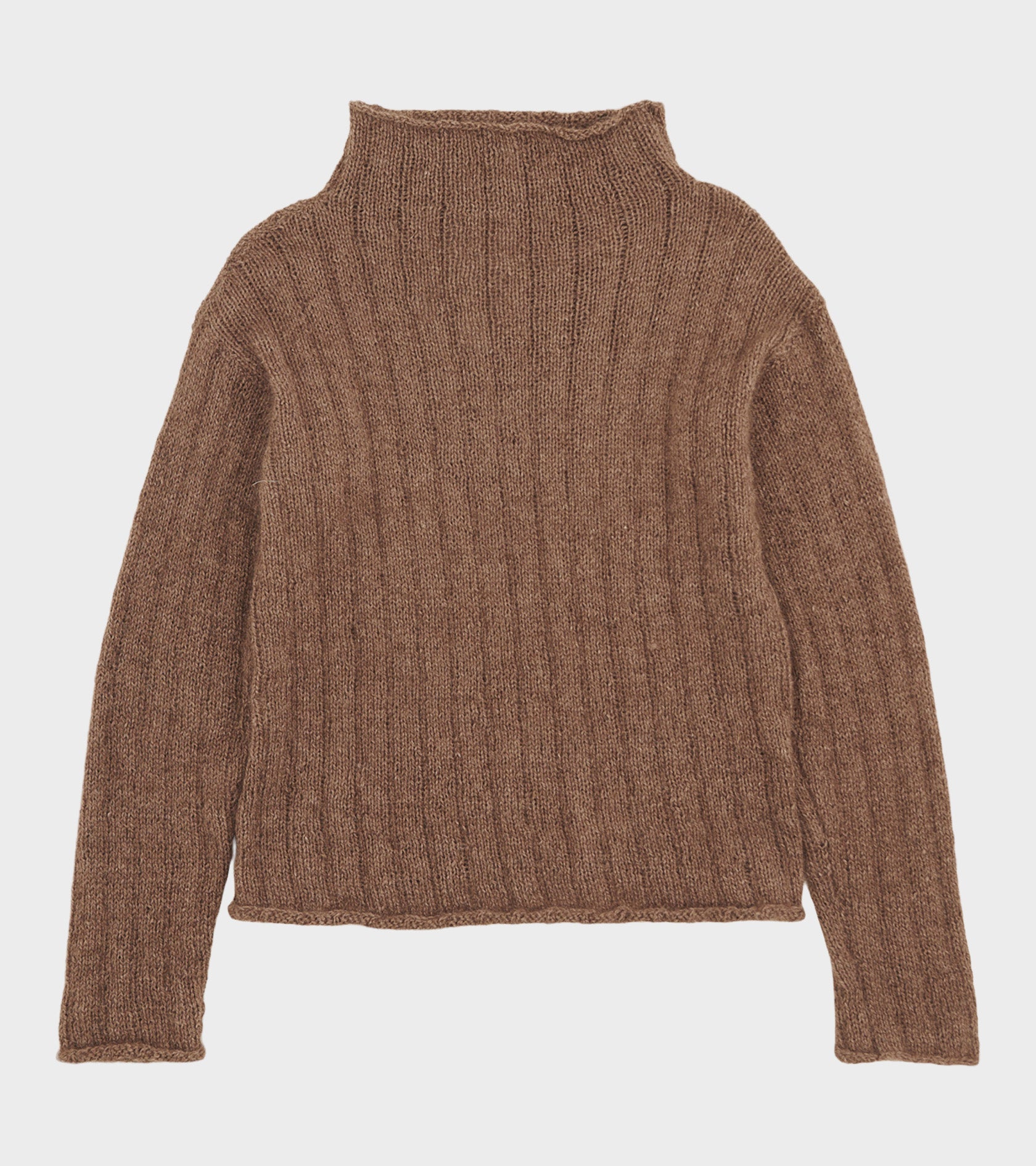 Brun strik i moskusgarn fra Gudrun & Gudrun. Moskus Sweater har rullede ender samt en bred og let høj hals.