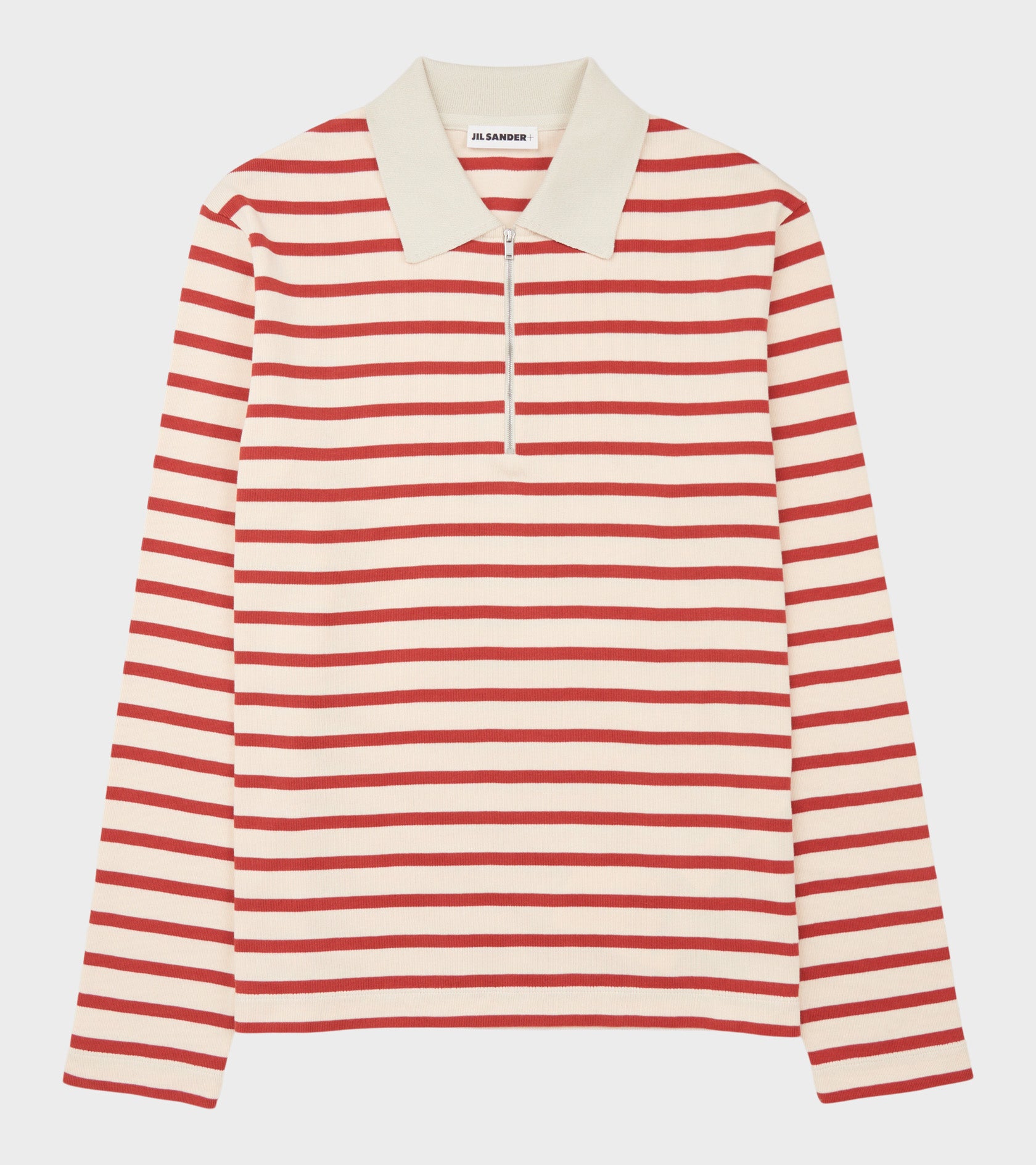 Råhvid rib langærmet polo med røde striber fra Jil Sander. Poloen har en klassisk krave, en sølv half-zip lynlåslukning og er fremstillet i en kraftig bomuldskvalitet. Øverst bagpå er et stort logotag.