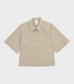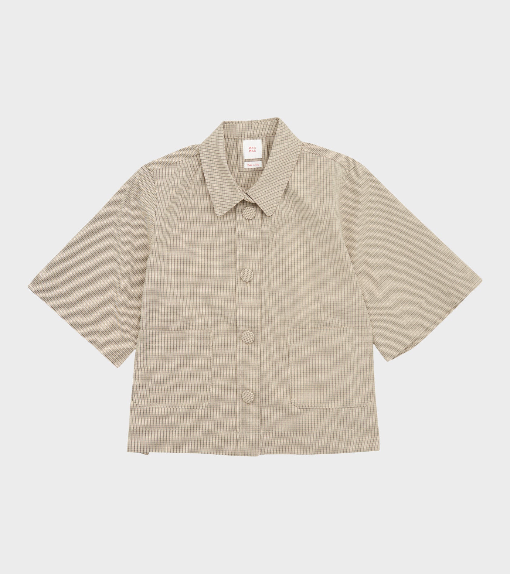 Ternet kortærmet skjorte fra Mati Mati. Skjorten har brede ærmer, en klassisk krave, to lommer på fronten samt en knaplukning med stofbetrukne knapper.