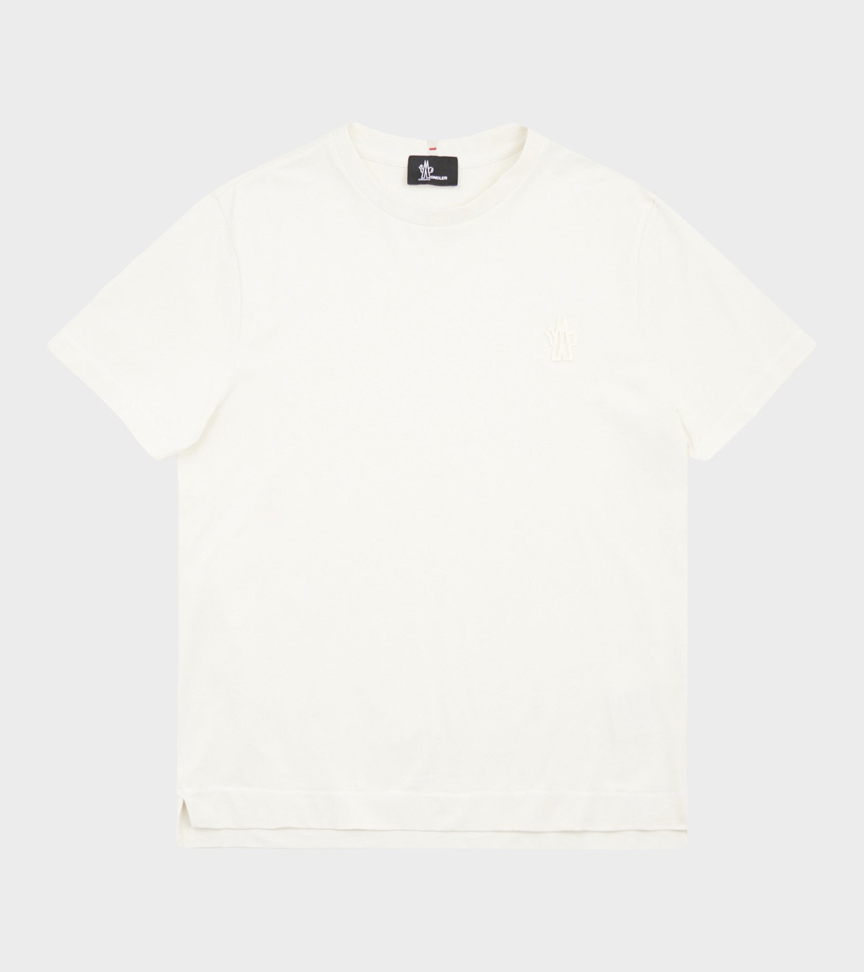 Hvid t-shirt fra Moncler Grenoble. T-shirten har et logo ved venstre bryst samt en lille slids i hver side. Nederst i venstre side samt øverst bagpå er et lille logotag.