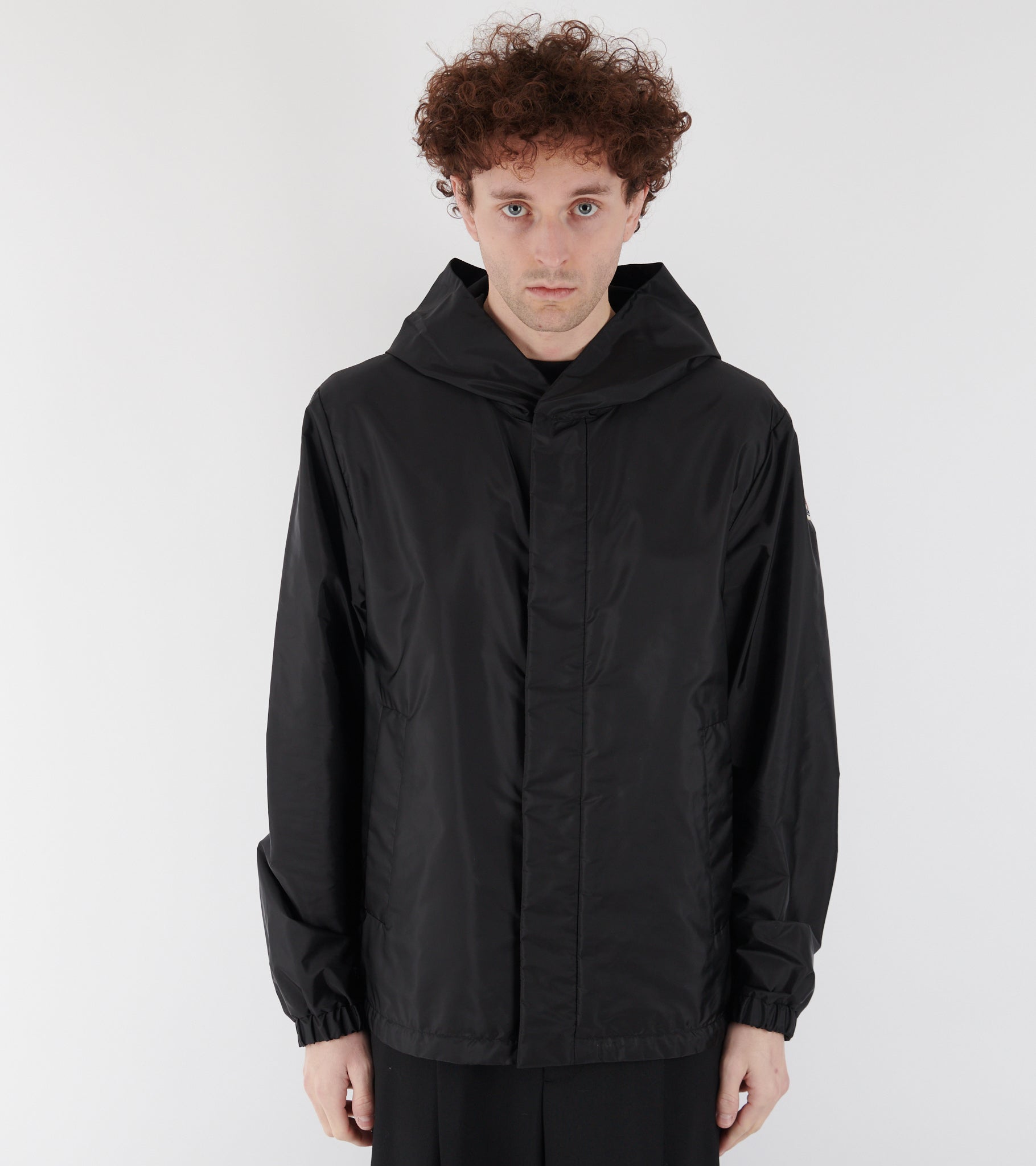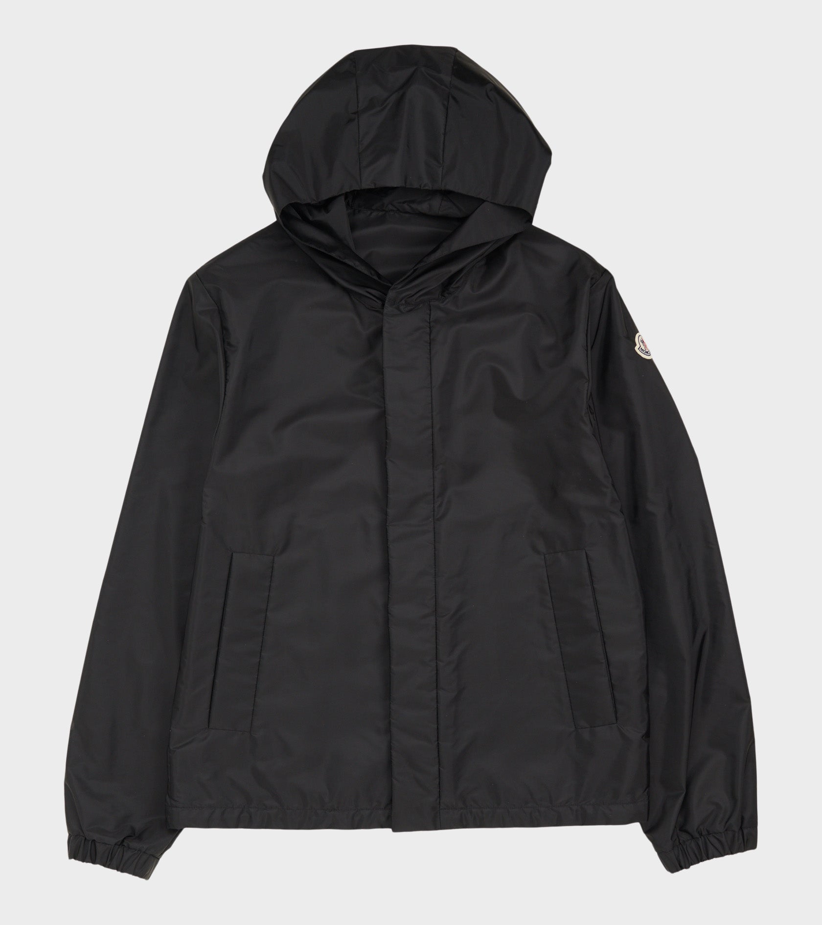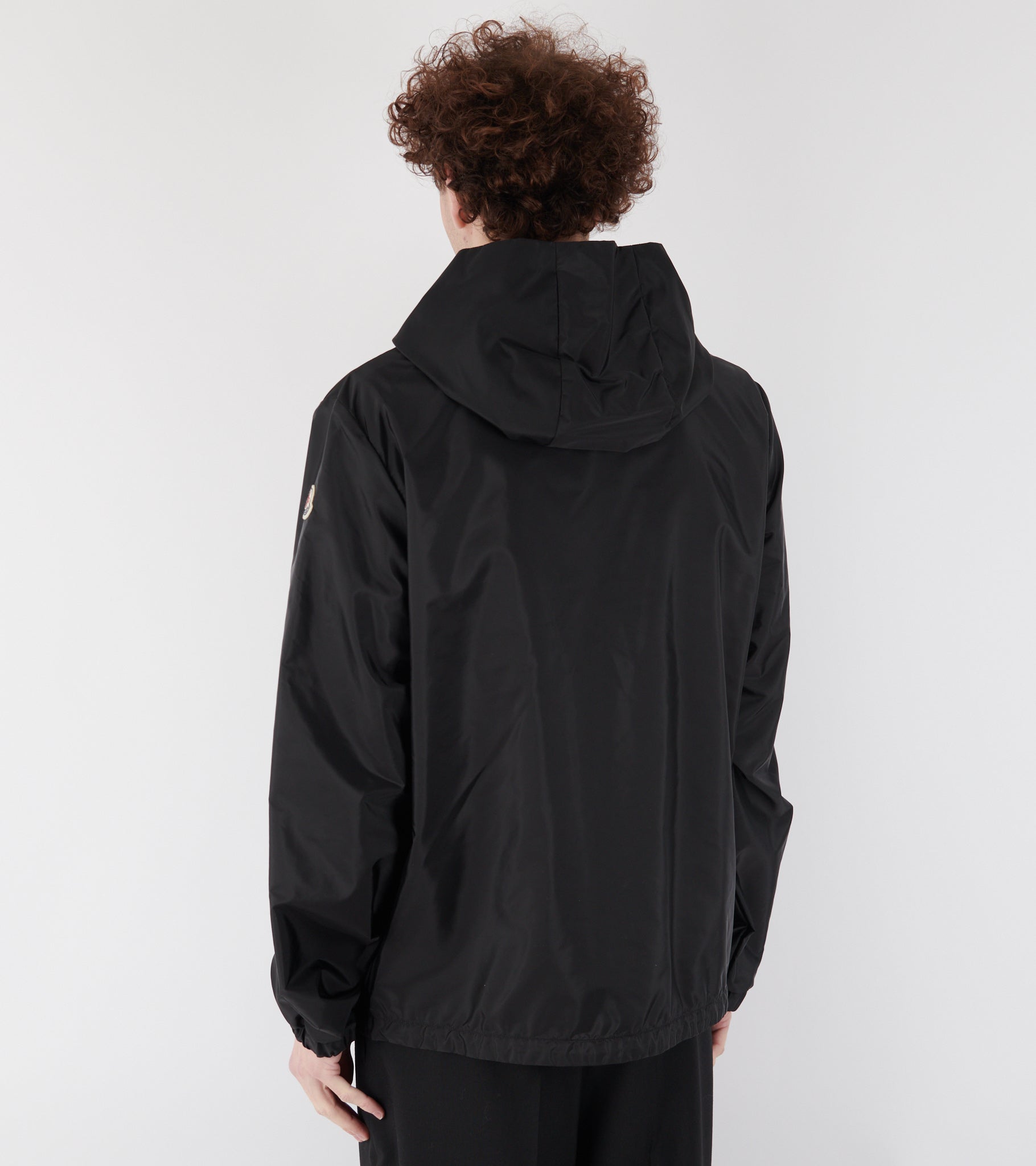 Sort vindjakke i nylon fra Moncler. Jakken har en klassisk hætte, en skjult lynlås- og trykknaplukning samt en skrålomme i hver side. På venstre ærme er det ikoniske logo i filt.