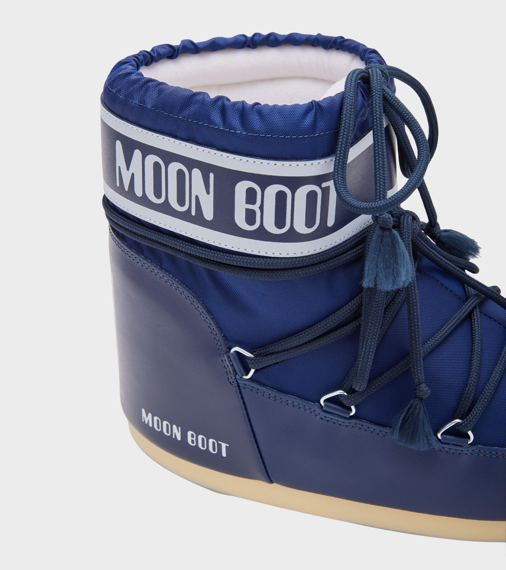 De ikoniske Moon Boots i blå nylon. Denne støvle er almindelig i størrelsen, men kan virke oversize på grund af støvlens struktur. Moon Boots har en rund snude, er foret med skum og betrukket med vandafvisende nylon. Den tykke skum gør, at støvlen har en høj komfort, som netop gør denne støvle til det perfekte valg af vinterstøvle.