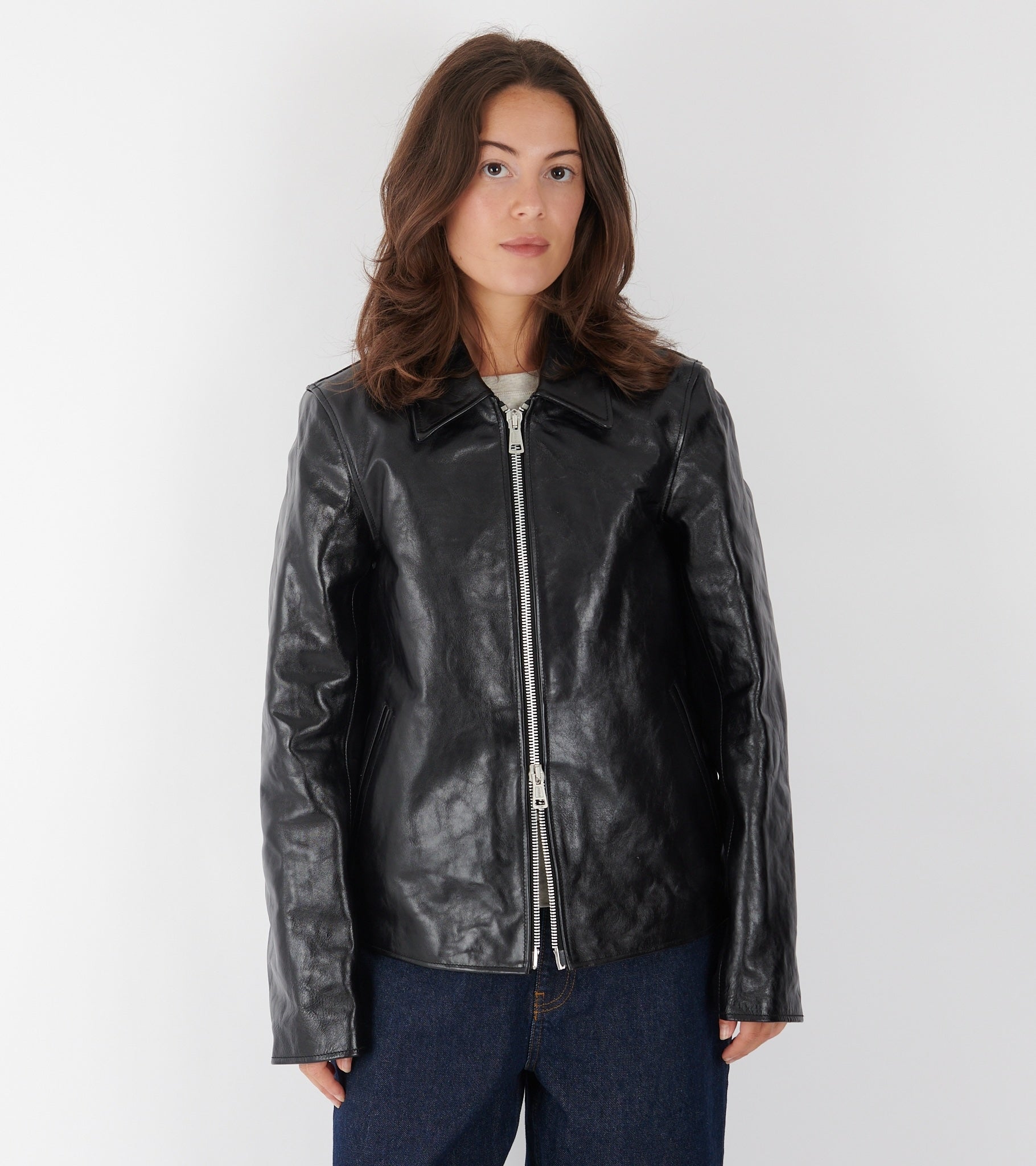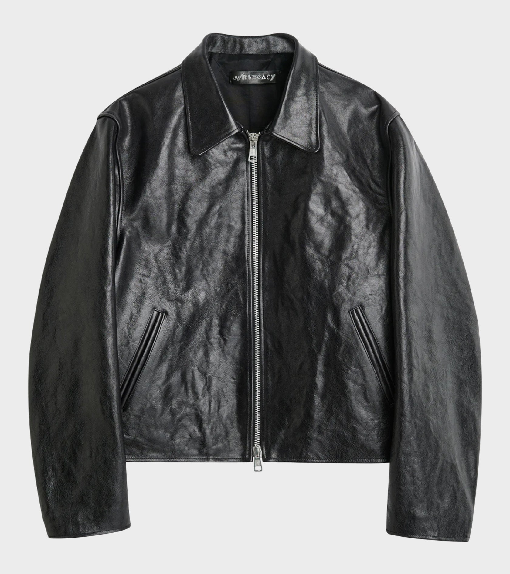 Sort læderjakke i glat let skindende koskind fra Our Legacy.