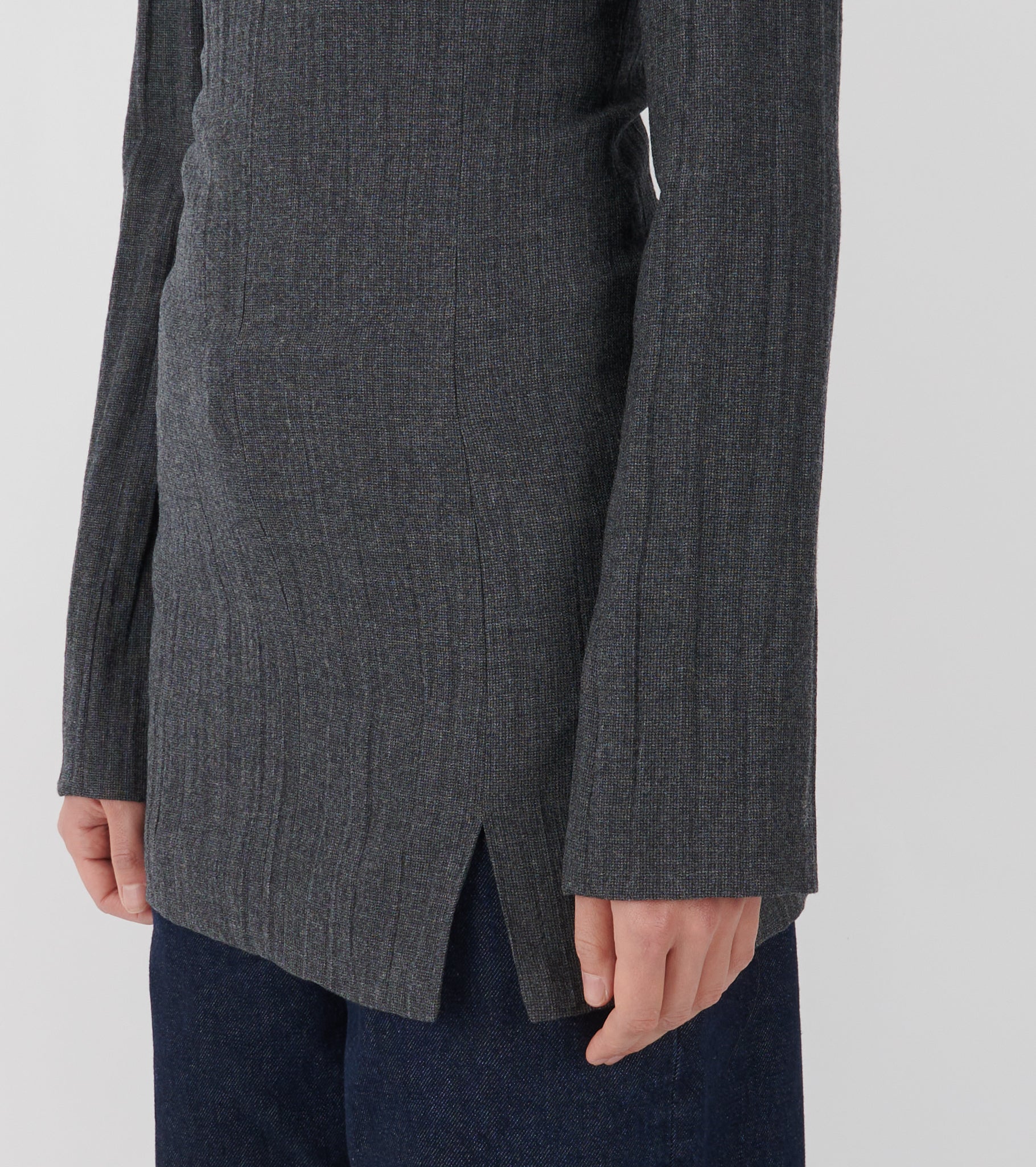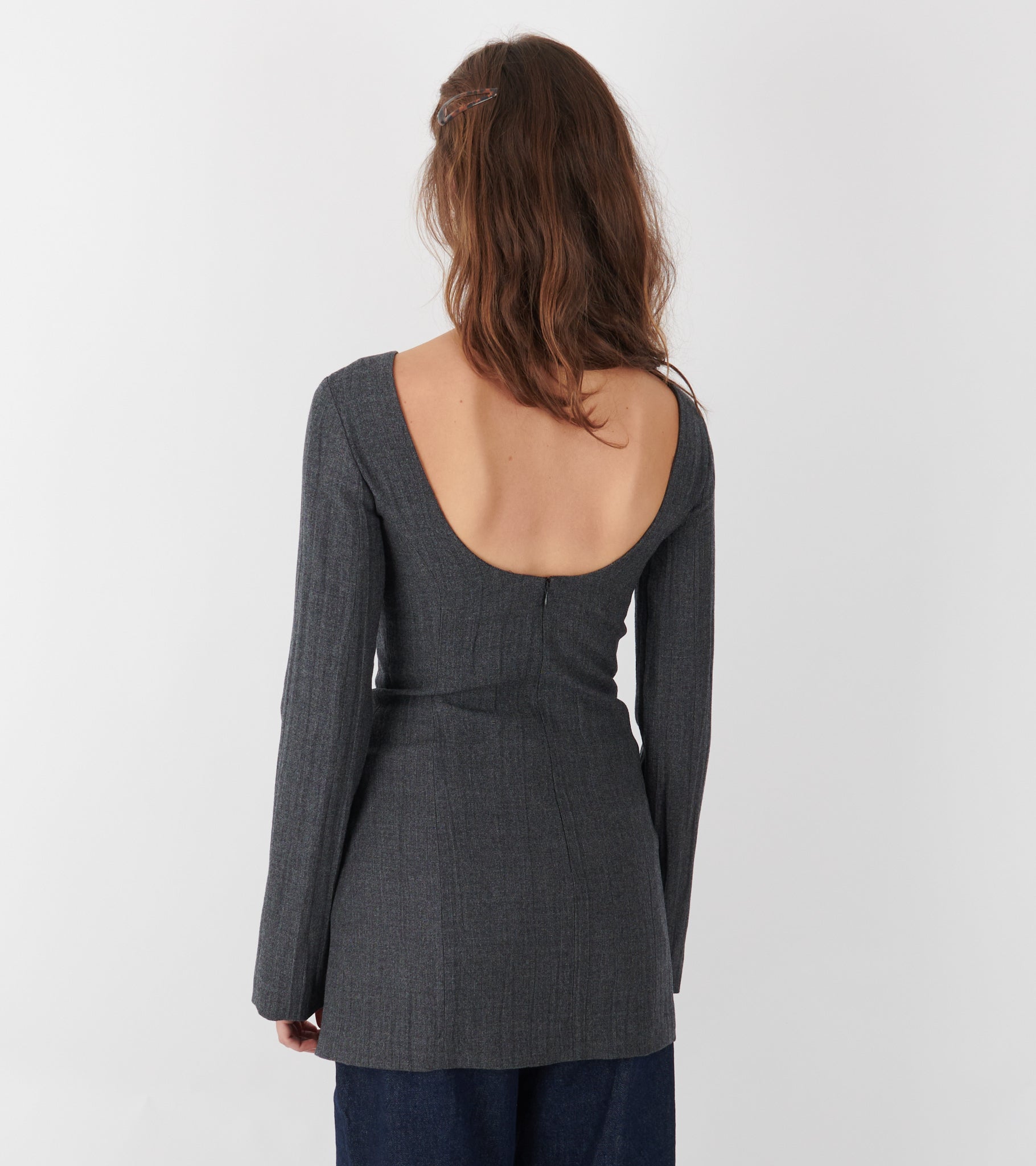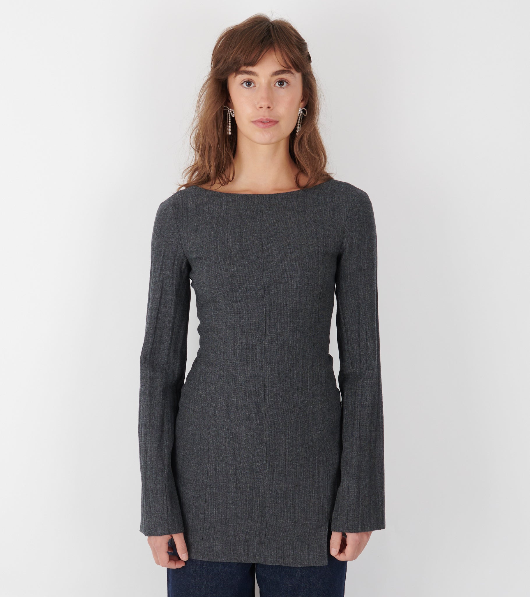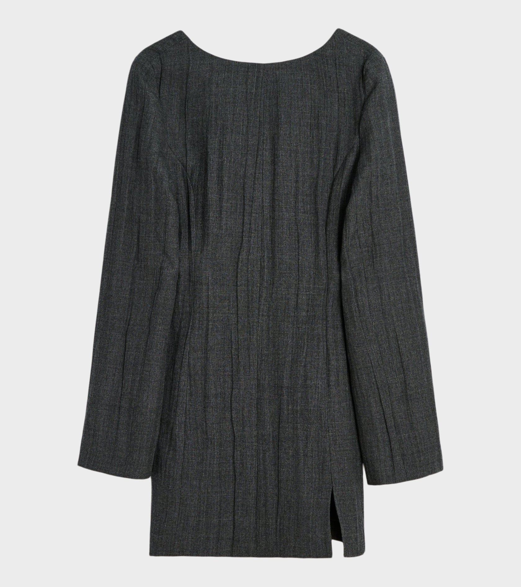 Kort grå kjole i en italiensk jomfru-uldblanding fra Our Legacy. Kjolen har lange ærmer, en båd-udskæring på fronten, en dyb rund udskæring bagpå samt en slids i siden. Bagpå er en diskret lynlåslukning.