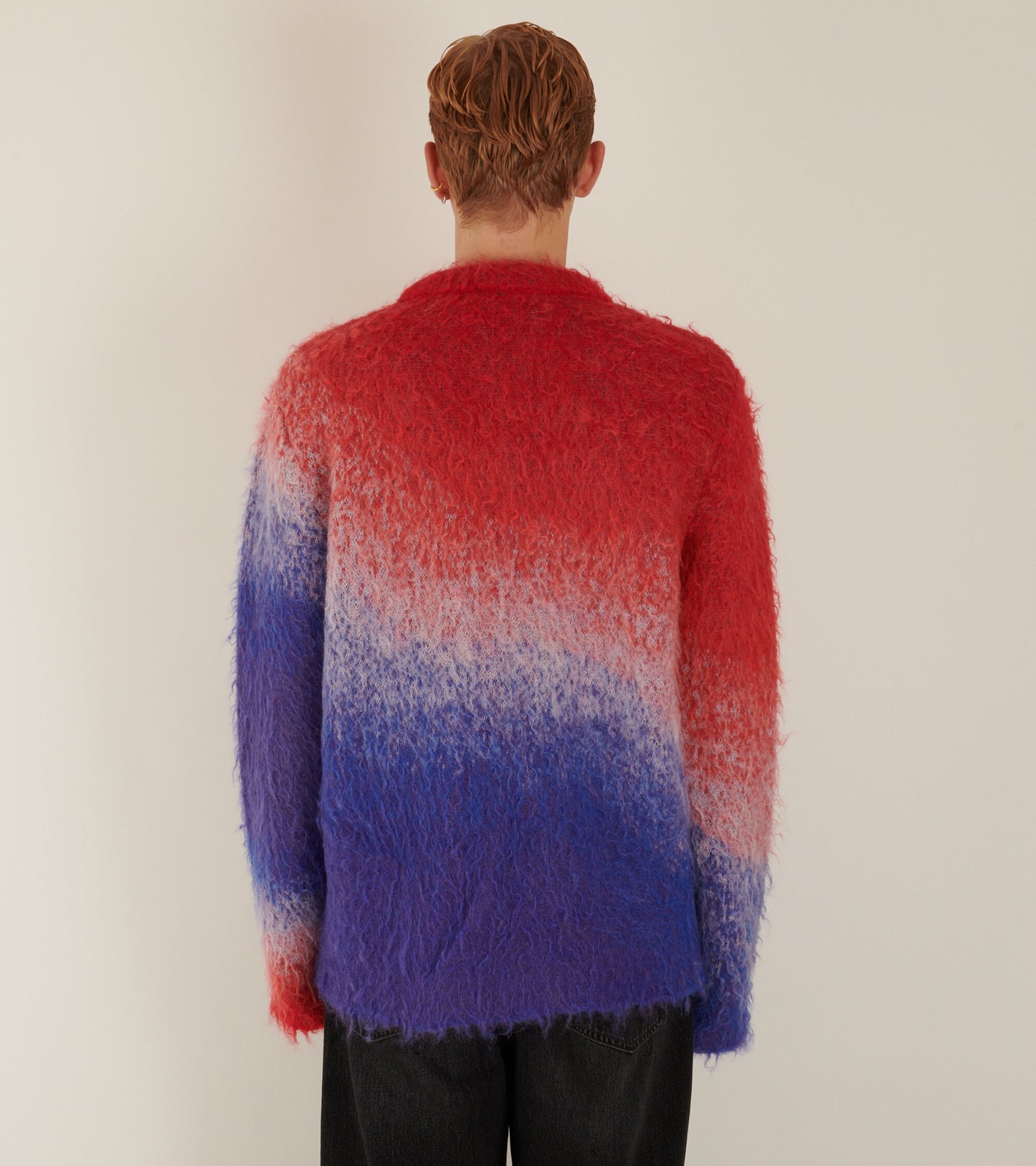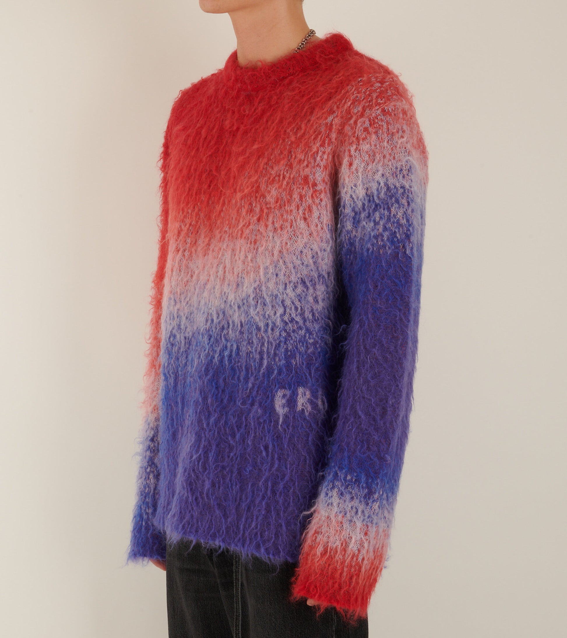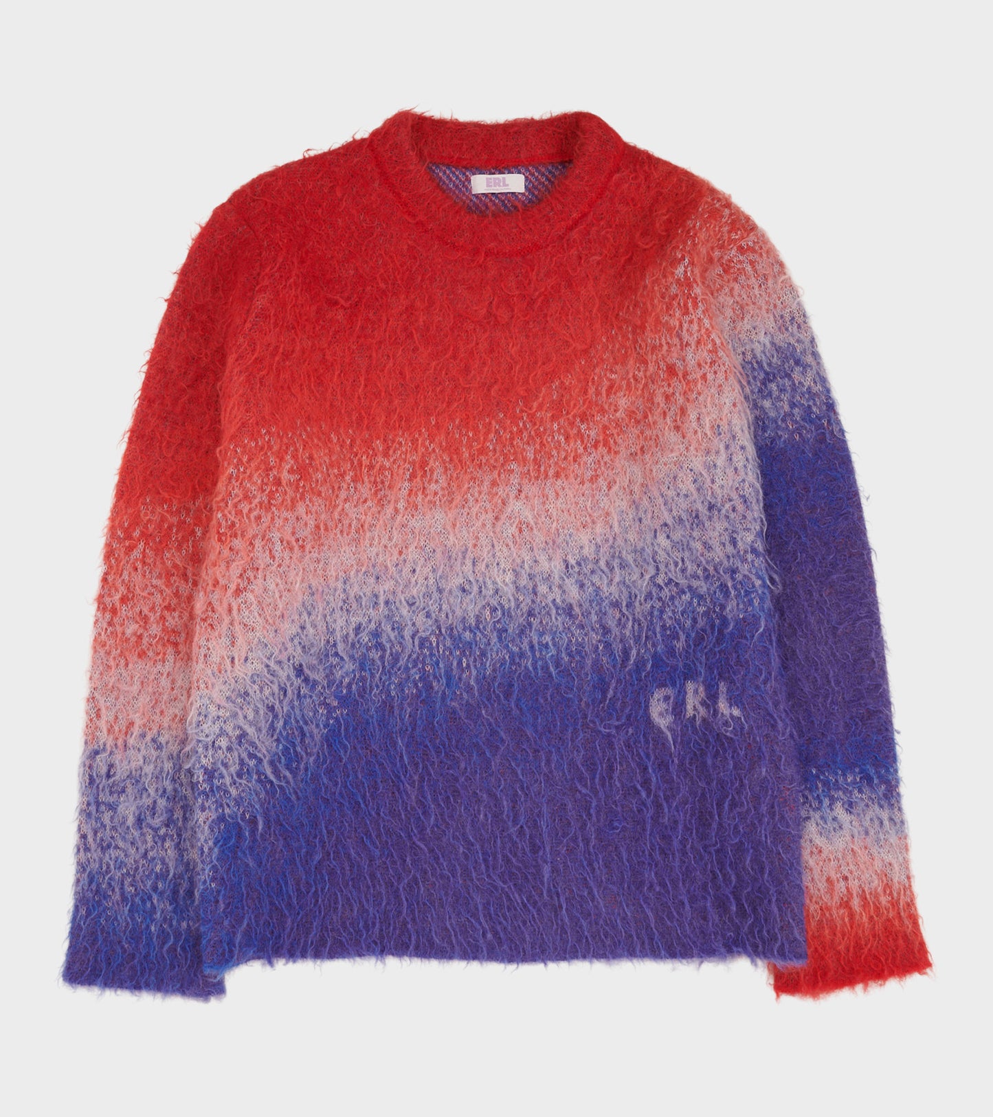 Strik fra ERL i en blød mohair-uldblanding. Denne strik har et 'ombre' design i rød, hvid og blå. Nederst på fronten er et diskret vævet logo. Den er produceret i Italien og har en afslappet samt oversize pasform.
