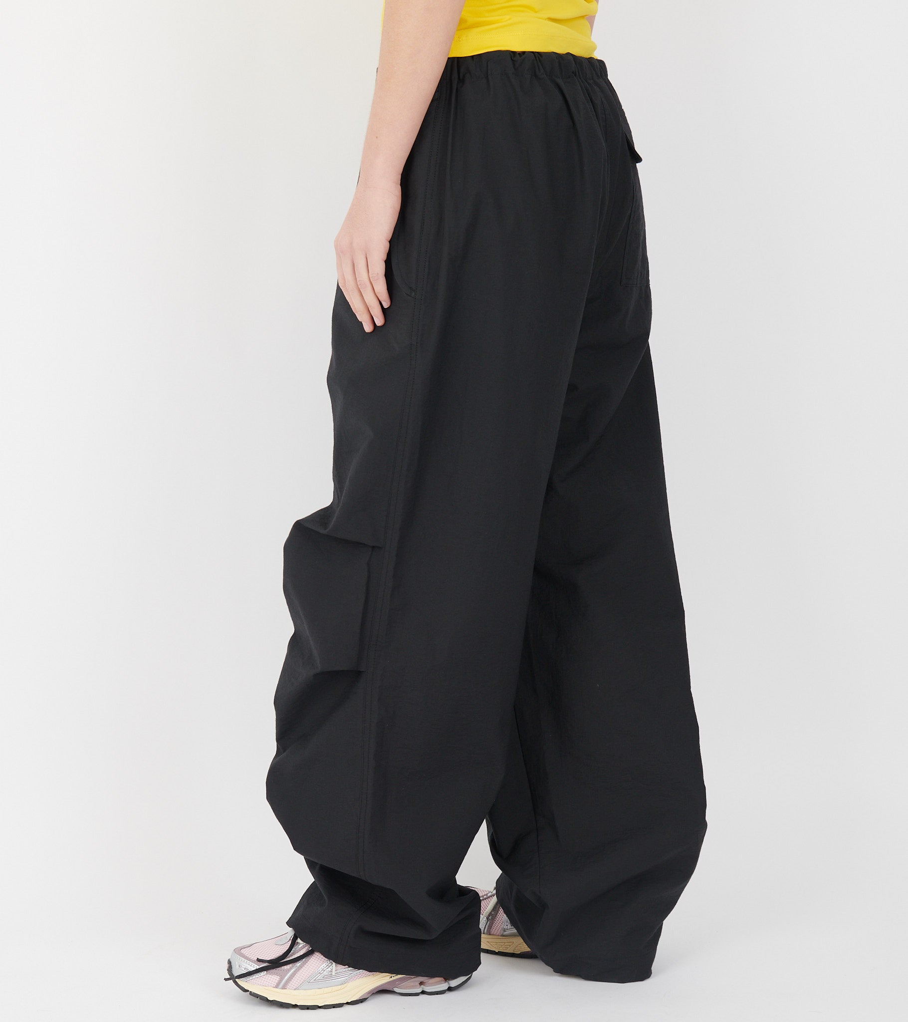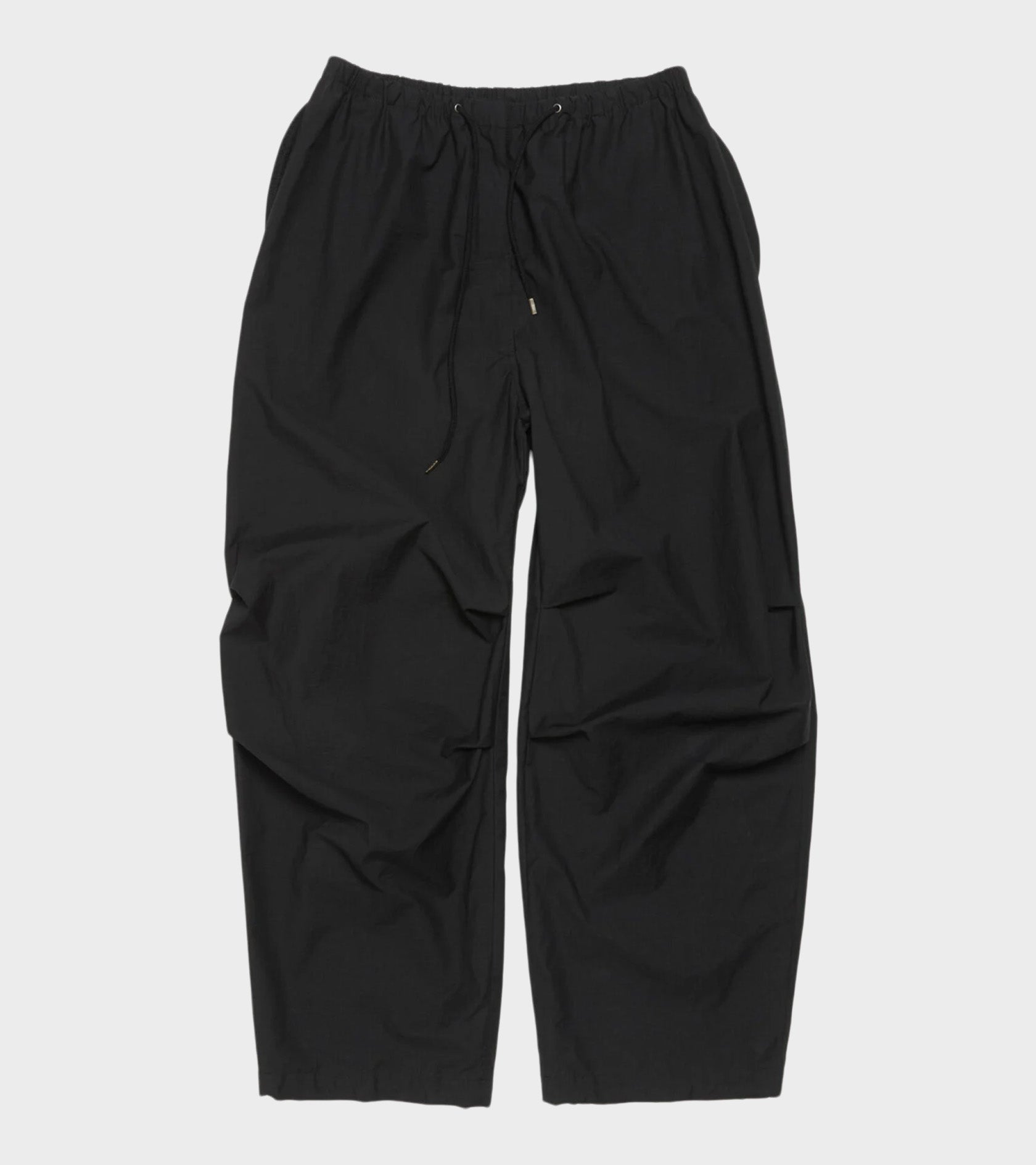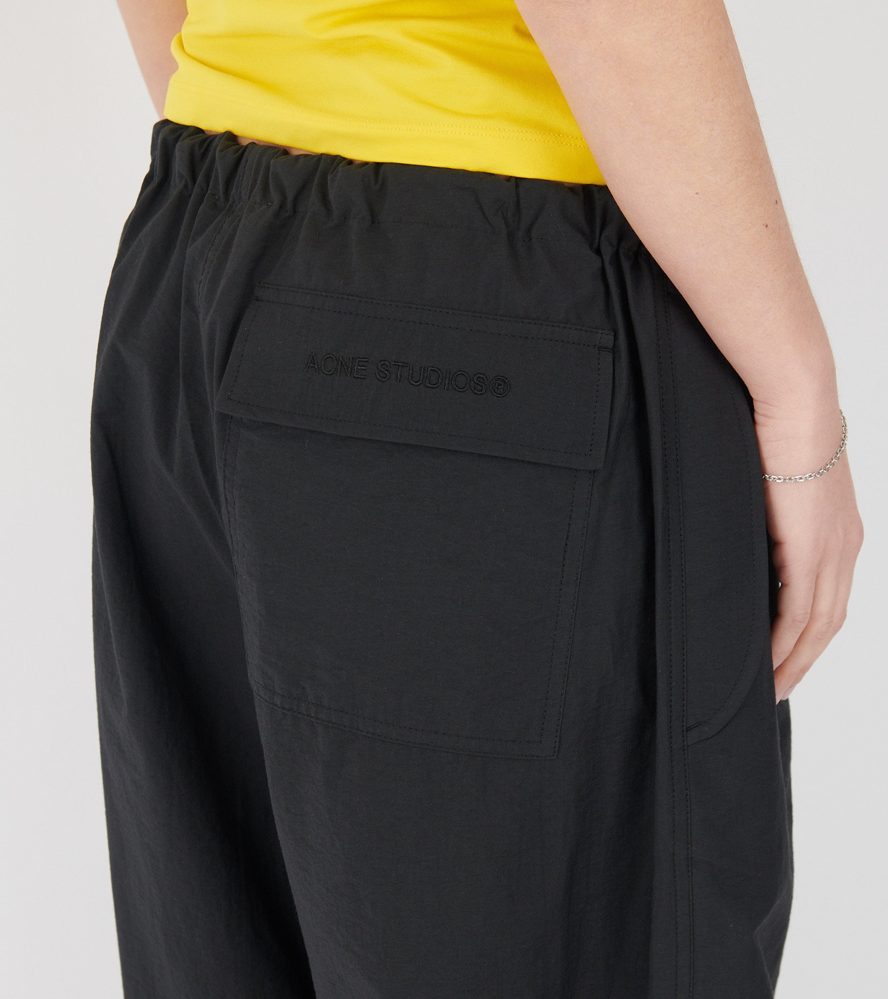 Sorte bukser med læg ved knæet fra Acne Studios. Bukserne er fremstillet i en blanding af økologisk bomuld og nylon, med en crinkled finish. Bukserne har elastik og et bindebånd i livet, justerbar snore i bunden, en skrålomme i hver side og én lomme bagpå. På baglommen er et sort broderet logo.