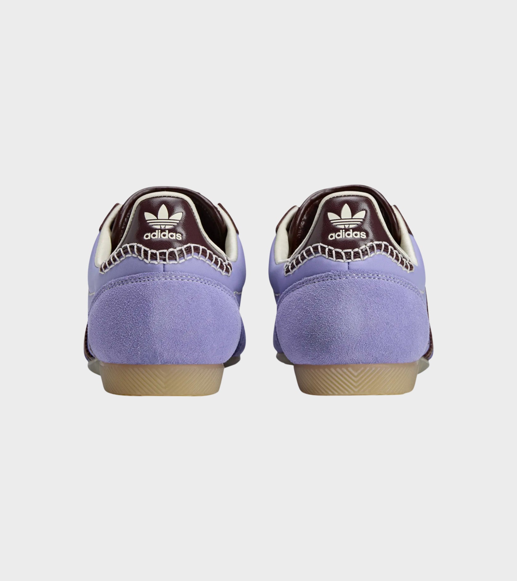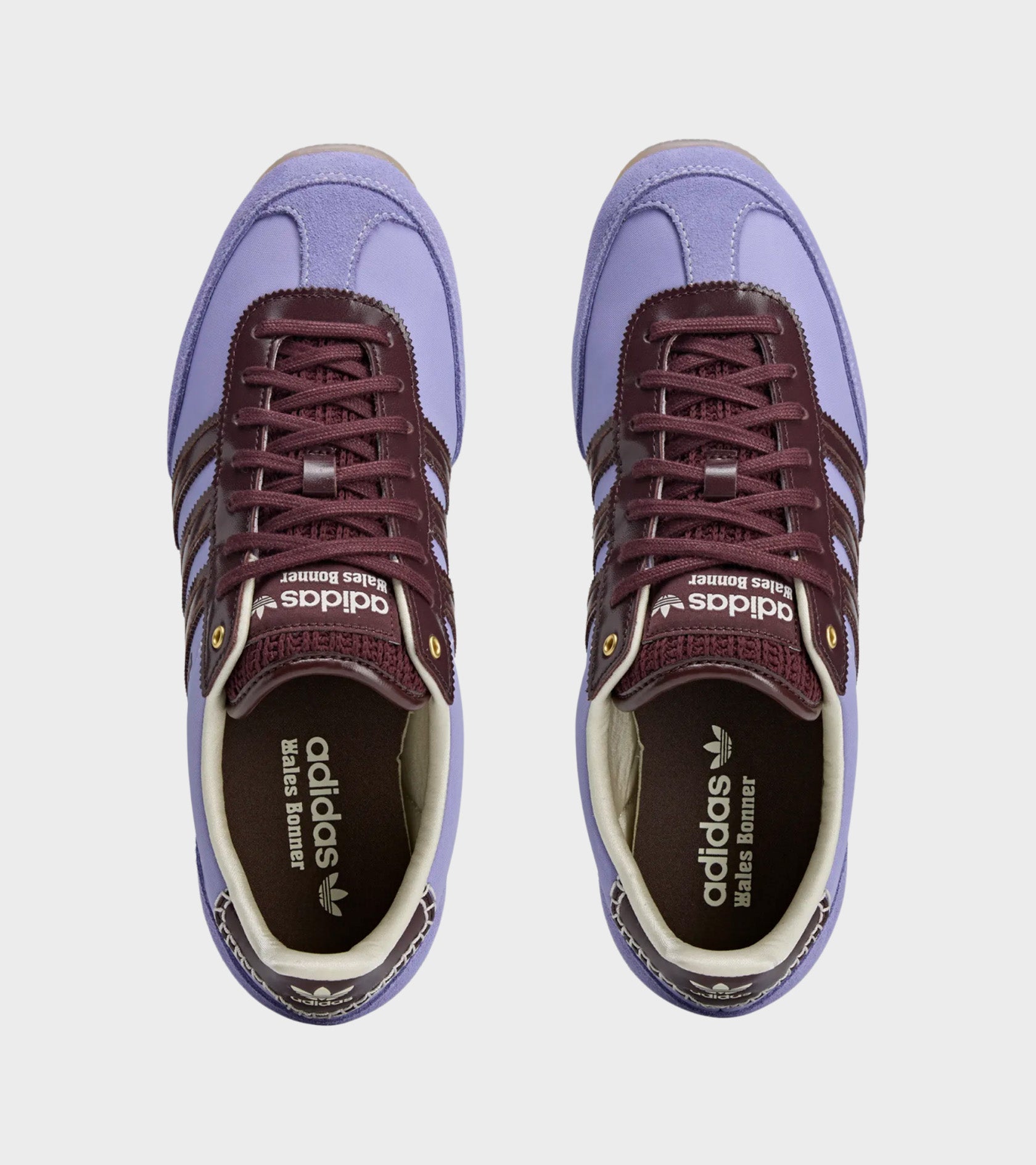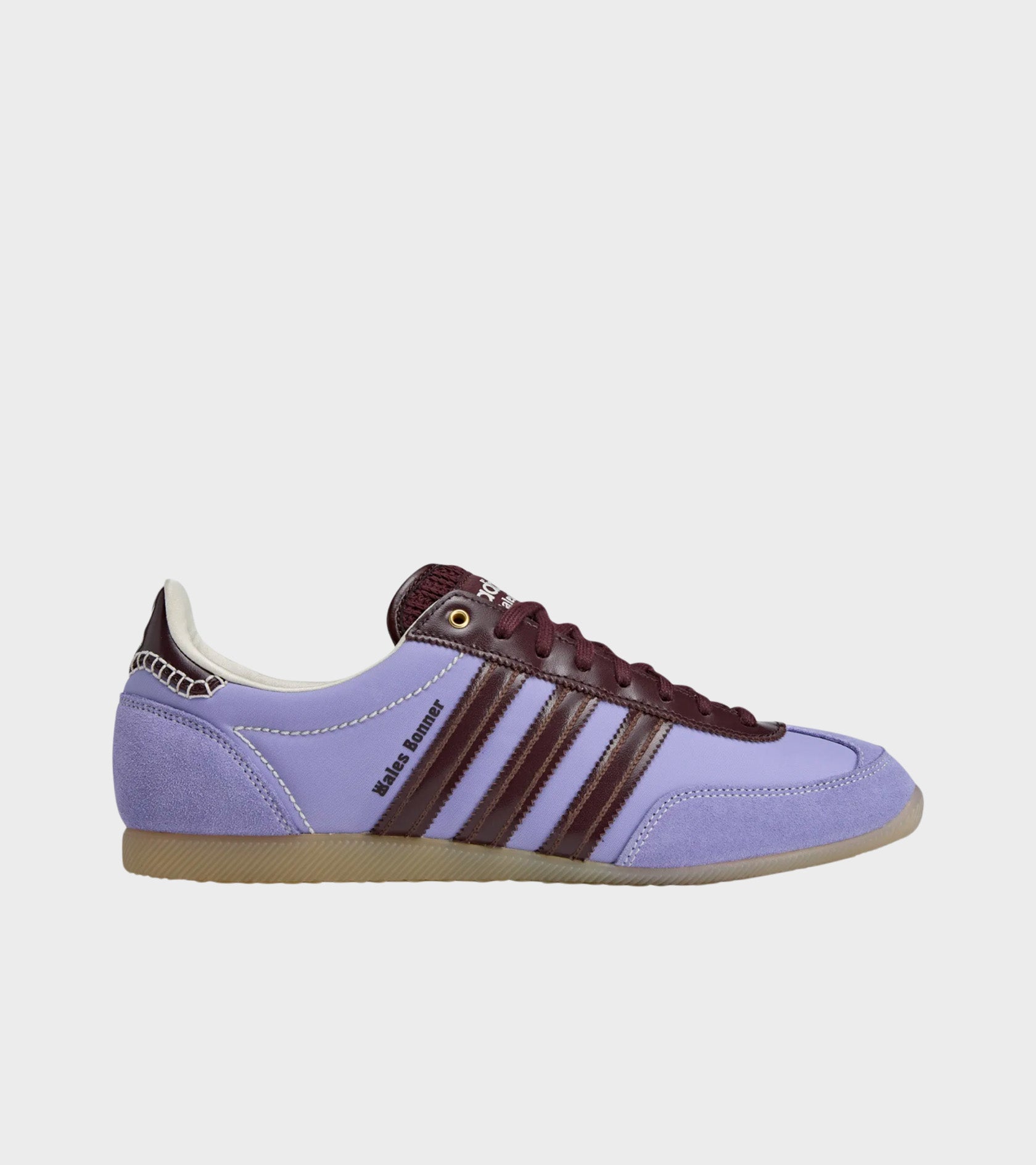 Den ikoniske Japan-model fra Adidas, nu i samarbejde med Wales Bonner. Skoen har en overdel i lilla nylon, overlays i lilla ruskind samt overlays i mørk burgundy-farvet læder. På hælen er synlige hvide syninger. På siden, tungen og hælen er et logo.