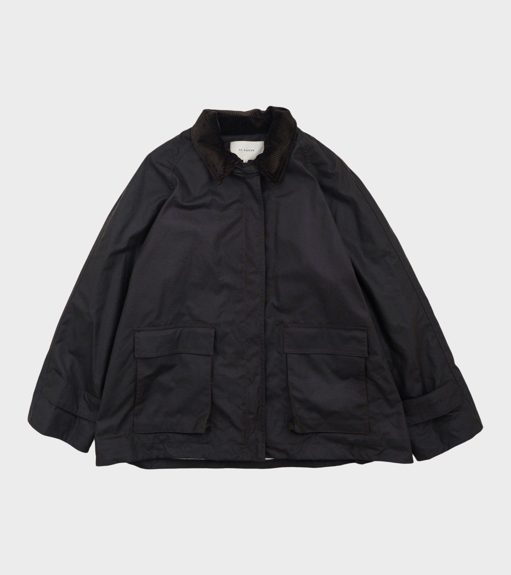 Mørkebrun jakke i oilskin fra AF Agger. Denne jakke er fremstillet i oliebehandlet bomuld fra England og er foret med uld på indersiden. Jakken har en krave i bomuldsfløj, en stropdetalje øverst ved kraven, en skjult lynlås- og knaplukning, to lommer på fronten samt strop-detaljer på ærmerne. På det ene ærme er et diskret broderet logo.