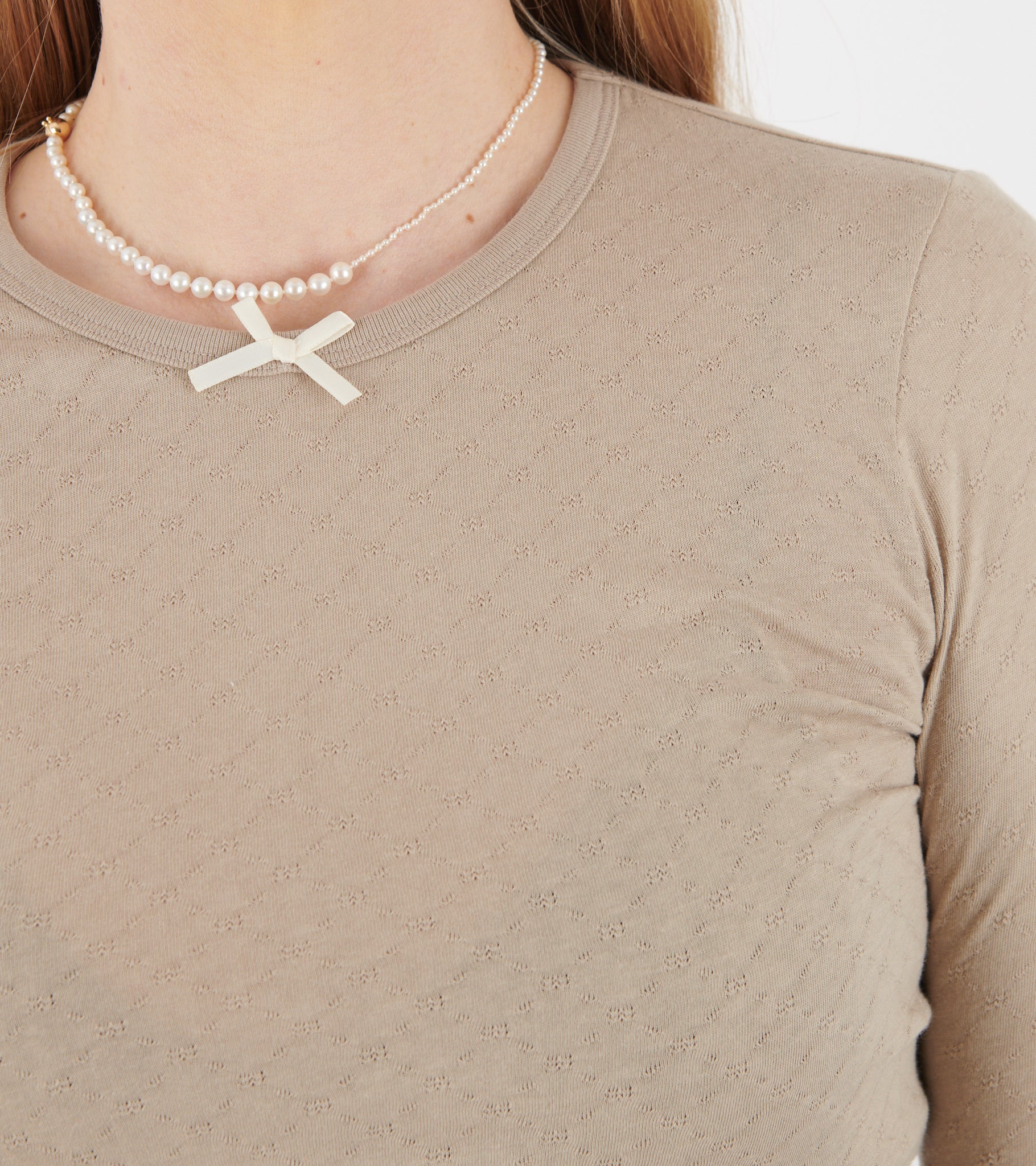 Beige langærmet bluse fra Aiayu. Messhu Long Sleeve er fremstillet i en økologisk bomuldsjersey kvalitet med let struktur. Den har ribkanter, en rund hals og en sløjfedetalje på fronten.