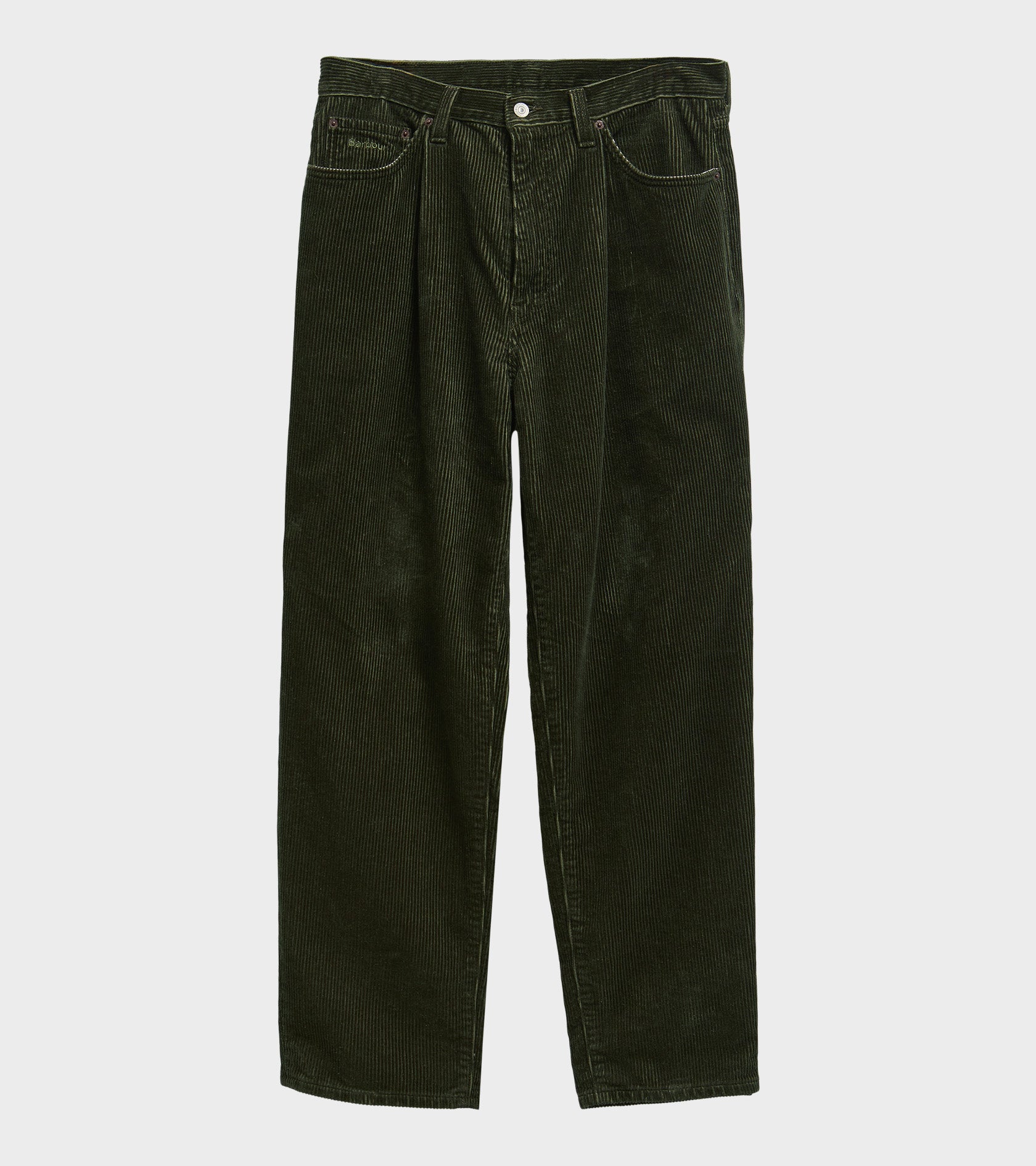 Mørkegrønne fløjlsbukser fra Barbour x Levi's. Bukserne har et klassisk 5-pocket design, bæltestropper og et logotag øverst bagpå. På den ene baglomme er et lille rødt Levi's-logo. På den ene forlomme er et lille broderet Barbour-logo. Bukserne har brede lige ben.