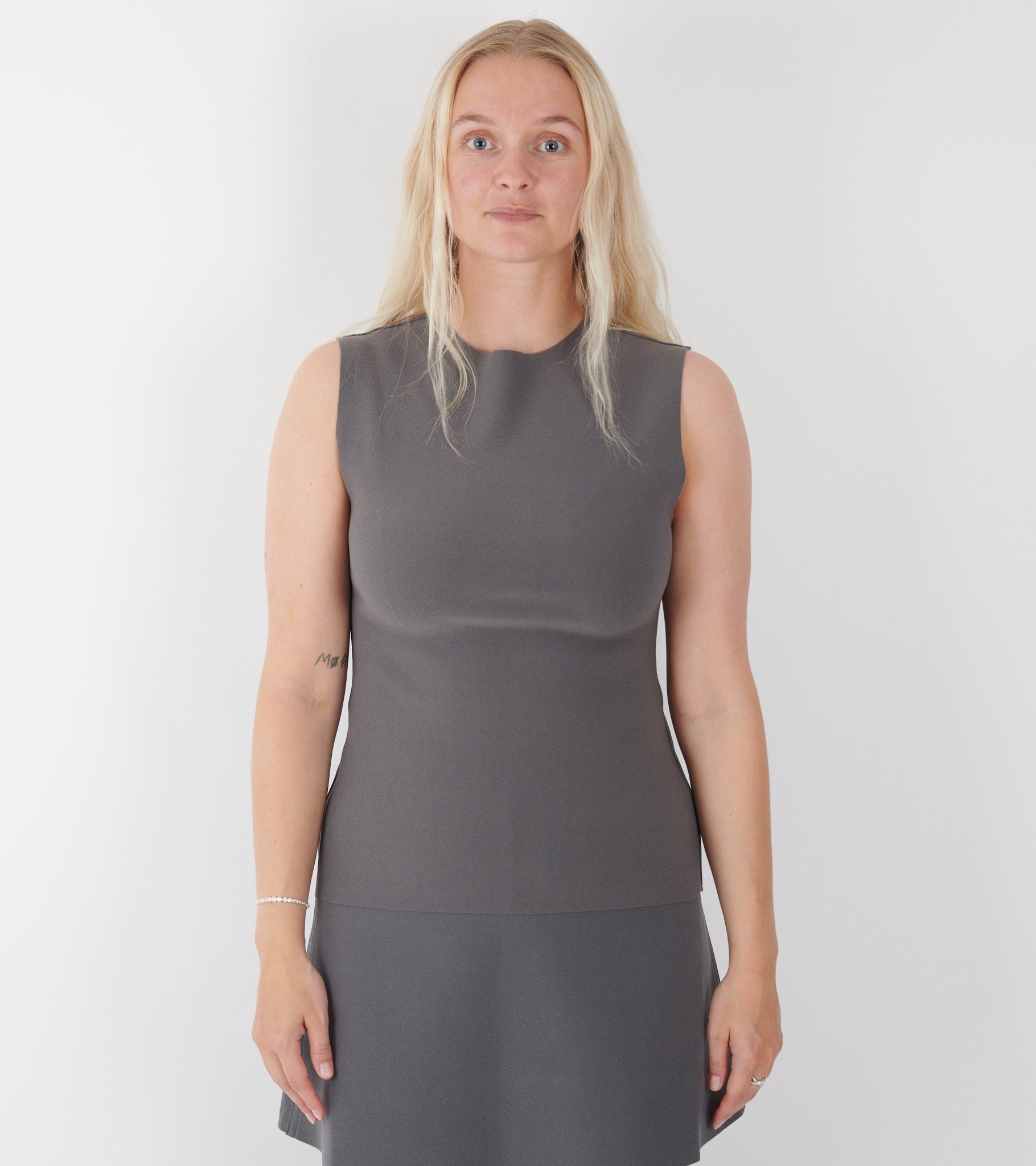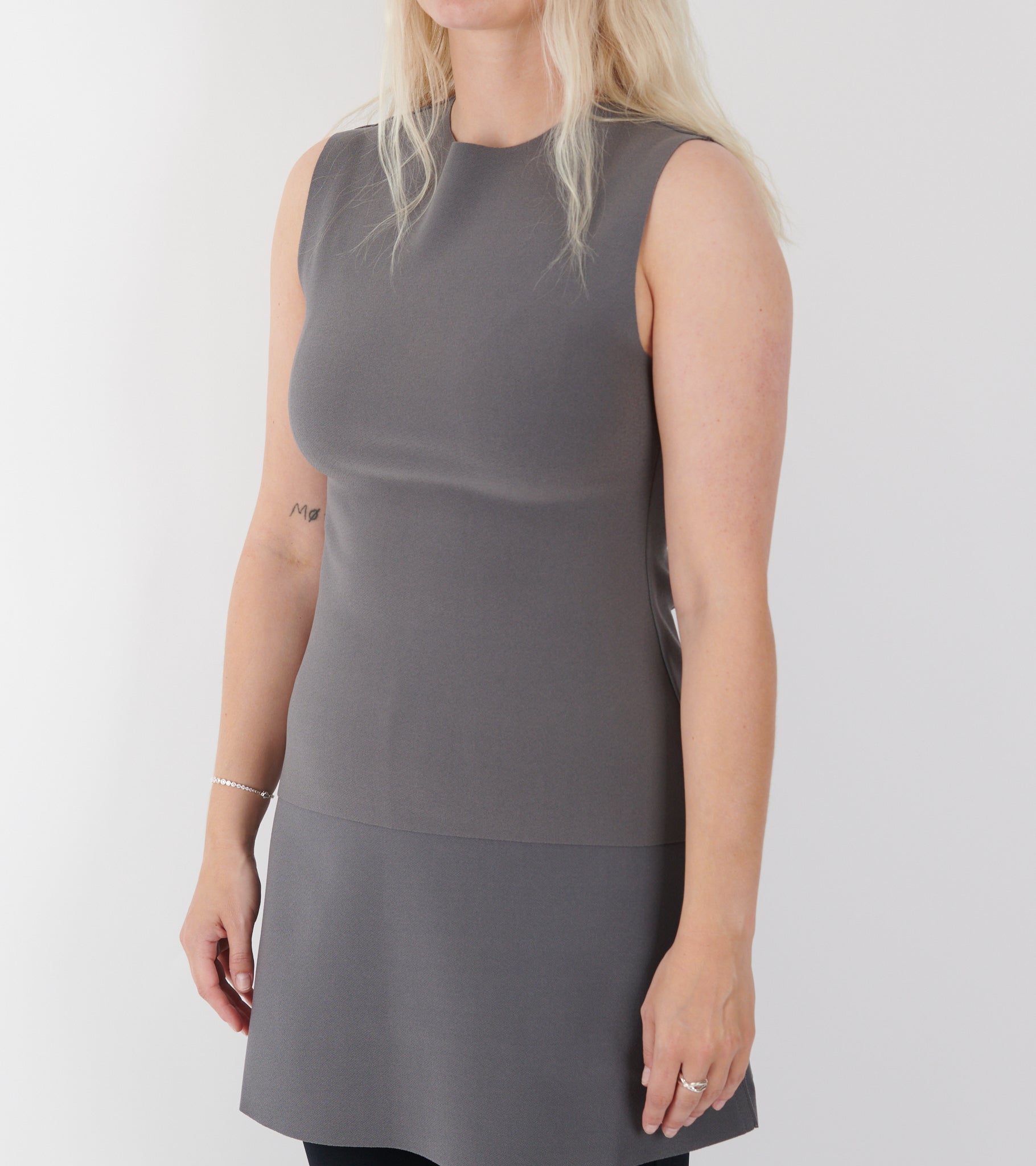 Top i grå fra Birrot. Toppen har et klassisk glat udtryk, men kan som på billedet trækkes op så den får et draperende udtryk.