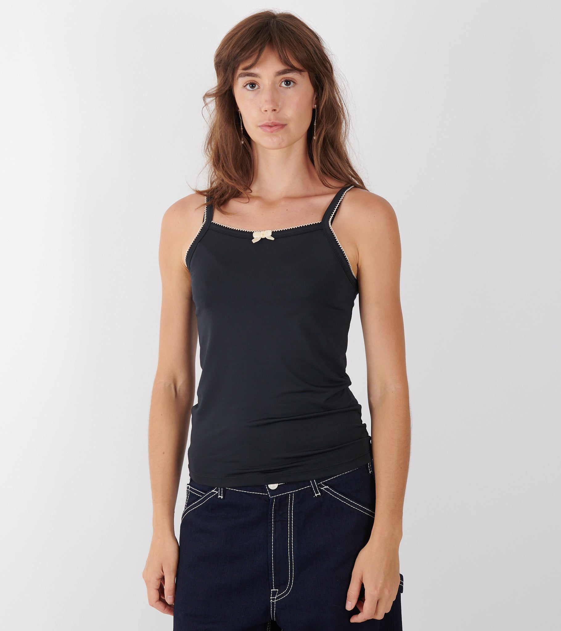 Sort top fra Caro Editions. Caro Jersey Tank Black er fremstillet i en strækbar polyesterkvalitet og har tynde stropper samt hvide bølgede kontrastkanter. Øverst på fronten er en lille hvid sløjfe. Øverst bagpå er 'Caro' broderet i hvid.