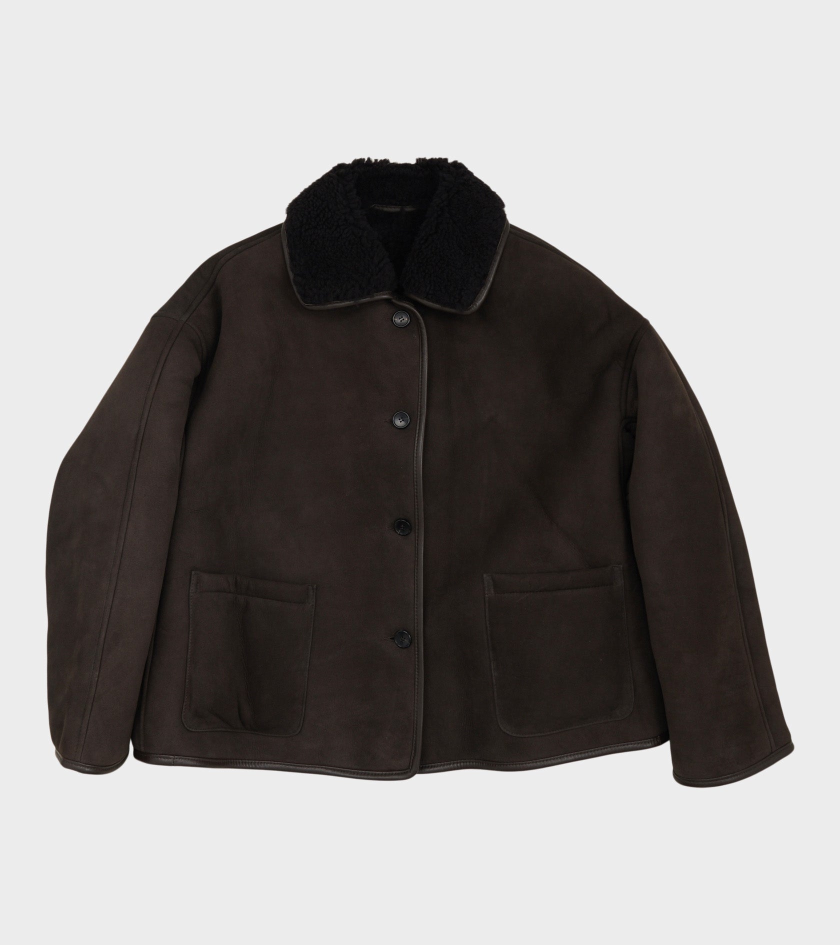 Jakke i en mørk brun nuance fra Cawley. Denne jakke er vendbar og er fremstillet i lammeskind. Jakken har en stor klassisk krave, en knaplukning med hornknapper, to lommer på fronten og kontrastkanter i brunt skind. Jakkens ene side er fremstillet i lamme-ruskind og den anden side er fremstillet i krøllet lamme-shearling. Den er produceret i London og har en afslappet pasform.