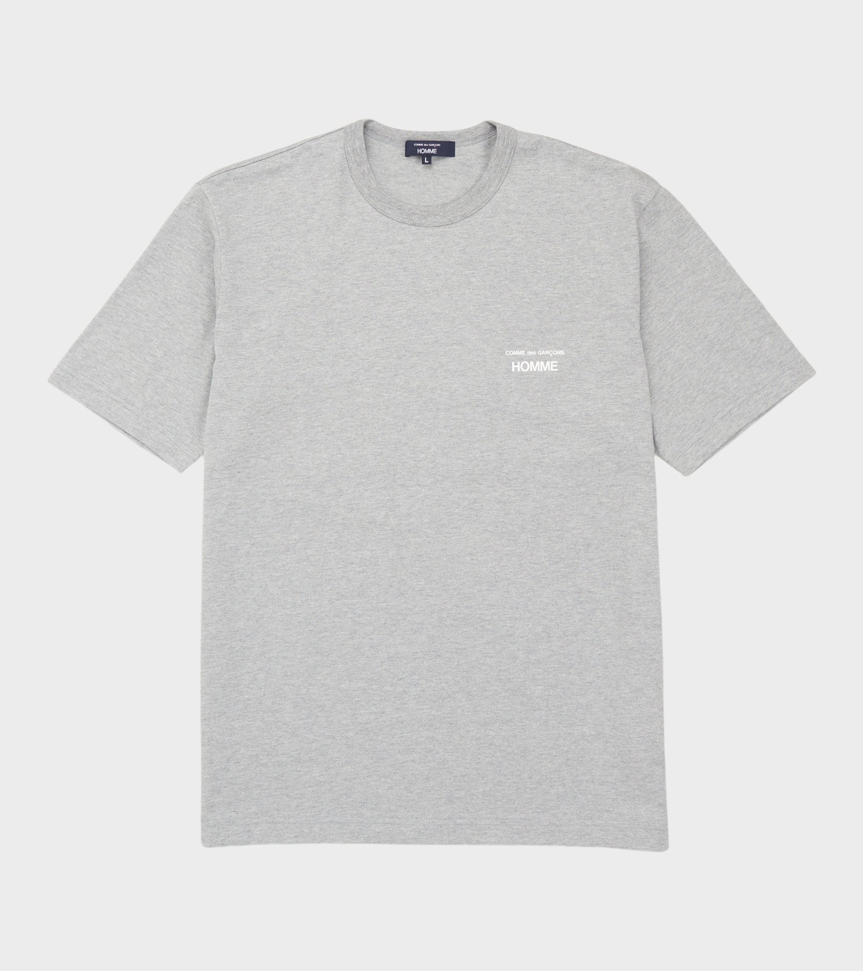 Lysegrå t-shirt fra Comme des Garcons Homme. Denne t-shirt er fremstillet i bomuld og har et printet logo ved venstre bryst.