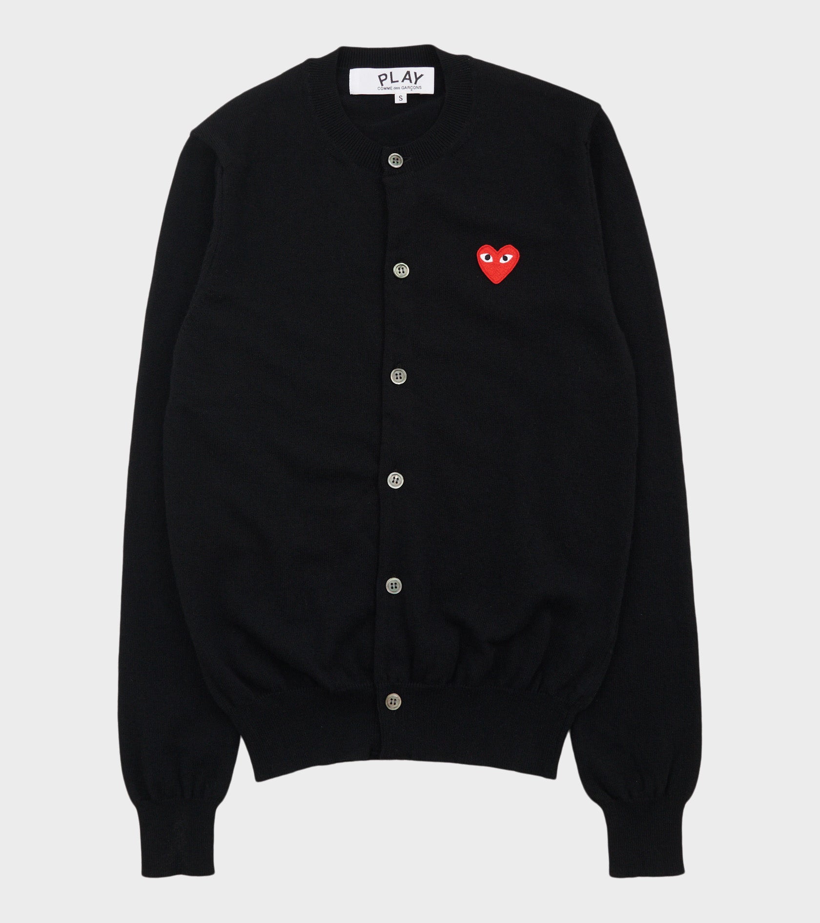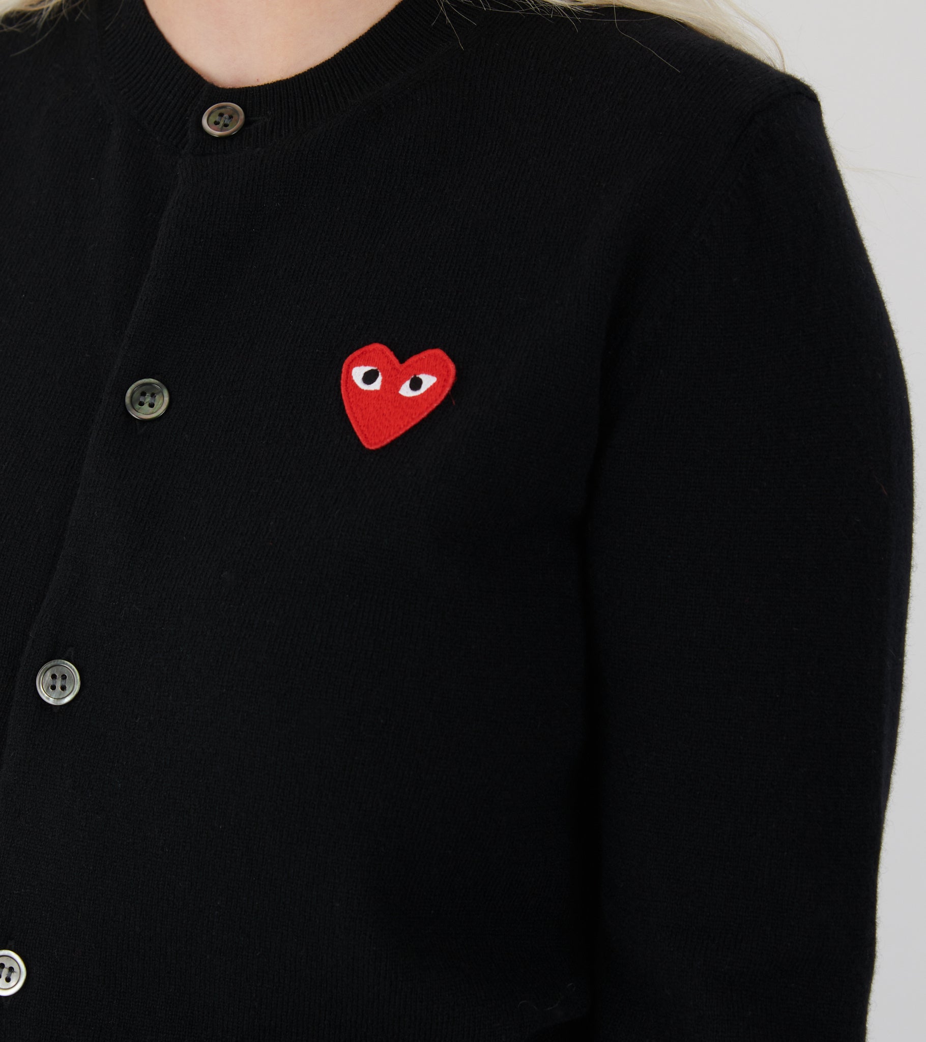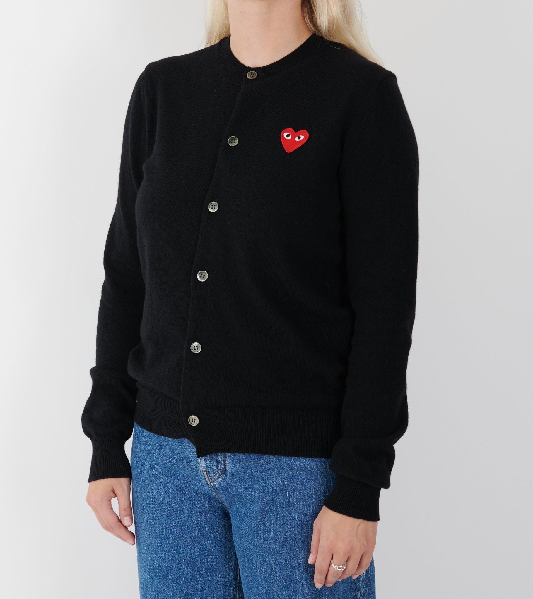 Sort unisex cardigan i uld fra Comme des Garcons PLAY. Denne cardigan har en rund hals, ribstrikkede kanter og en knaplukning med perlemorsknapper. Ved venstre bryst er det røde PLAY-hjerte broderet. Det ikoniske hjerte med øjnene fra PLAY er designet af Filip Pagowski og er gennemgående på alle PLAY produkter.