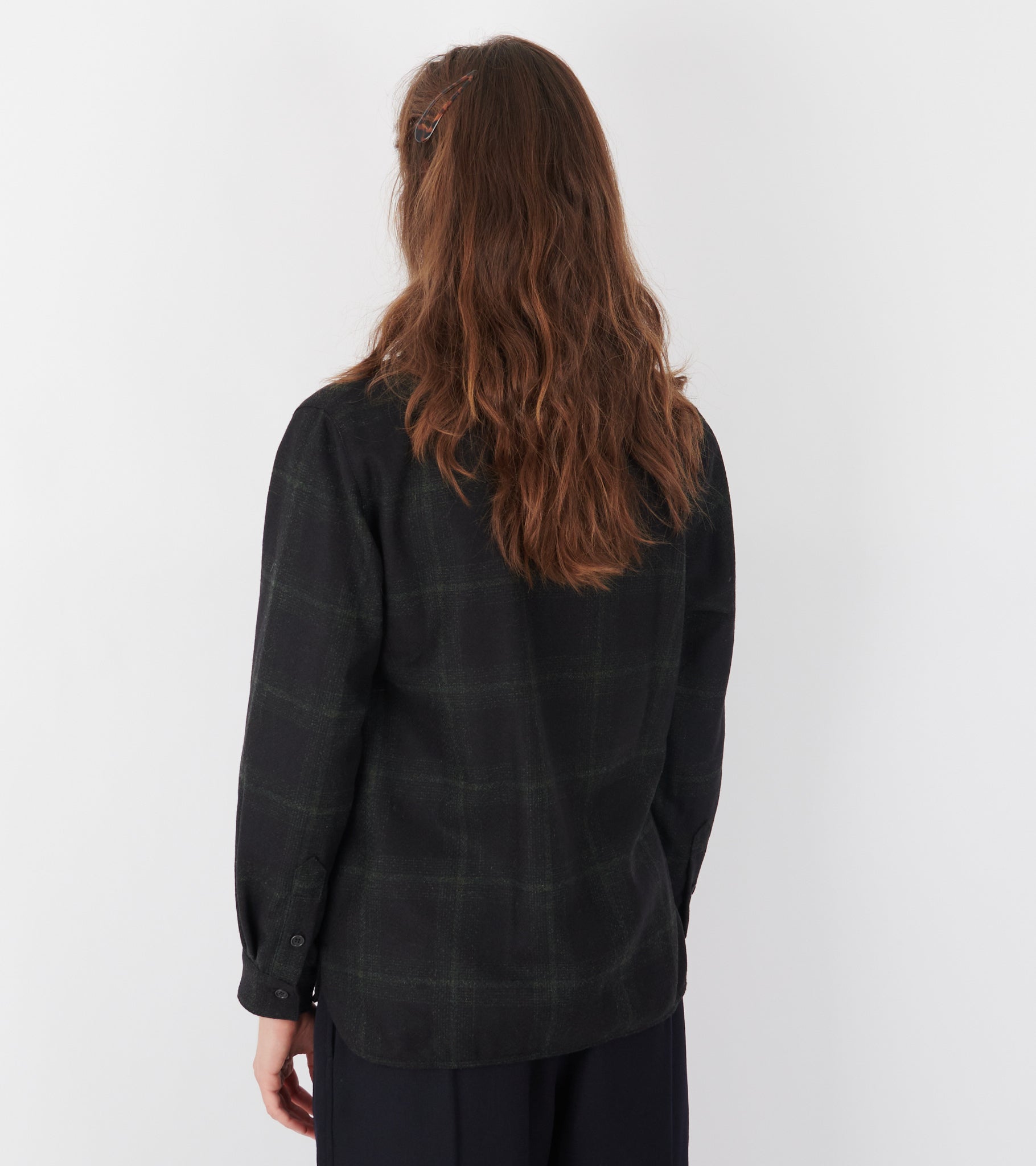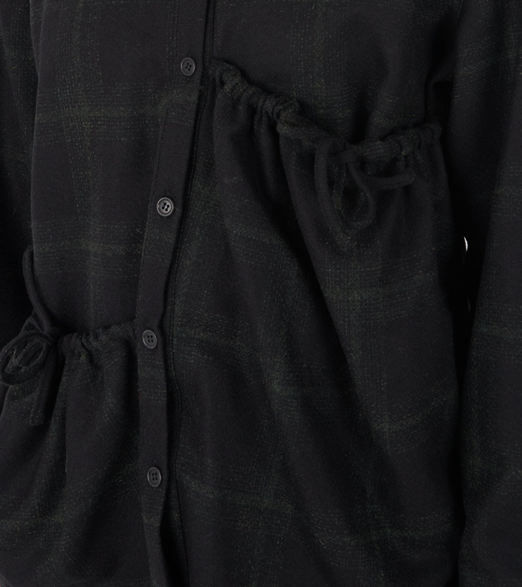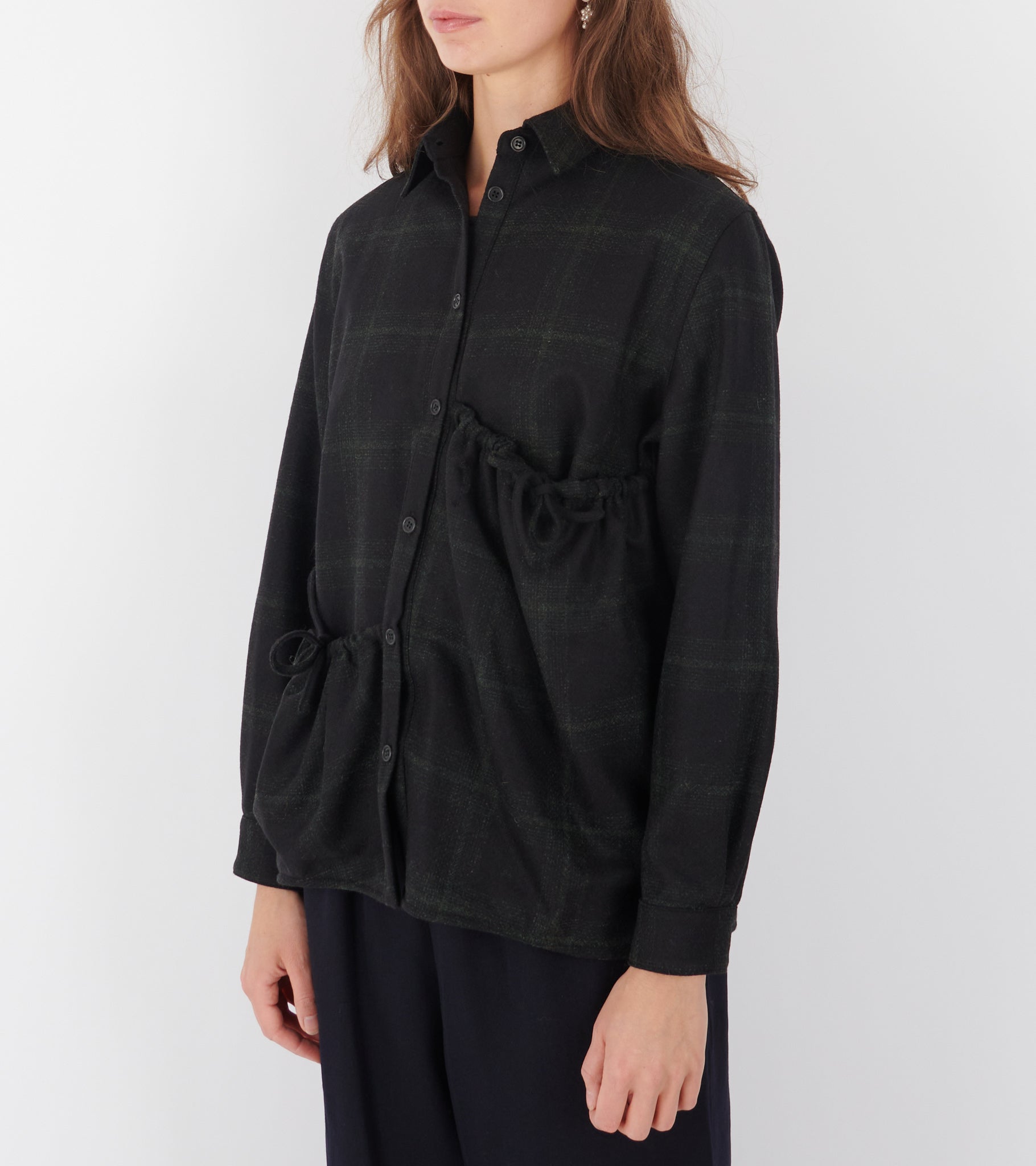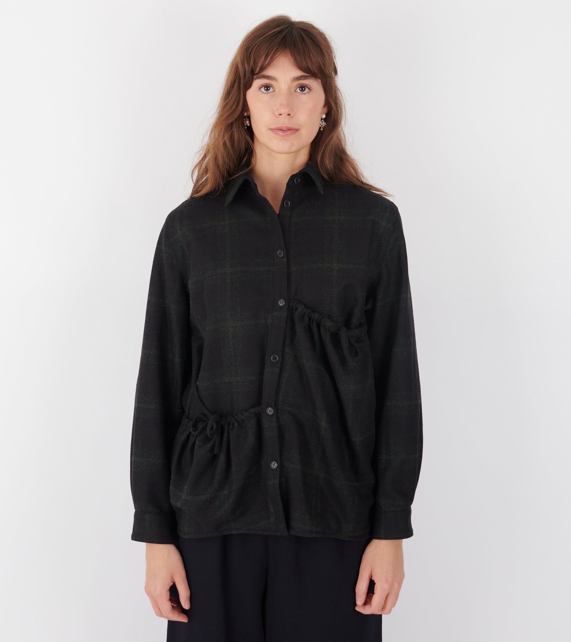 Ternet skjorte i merinould fra Henrik Vibskov. Skjorten har en klassisk krave, en knaplukning og to lommer på fronten. Lommerne har flæsedetaljer med bindebånd.