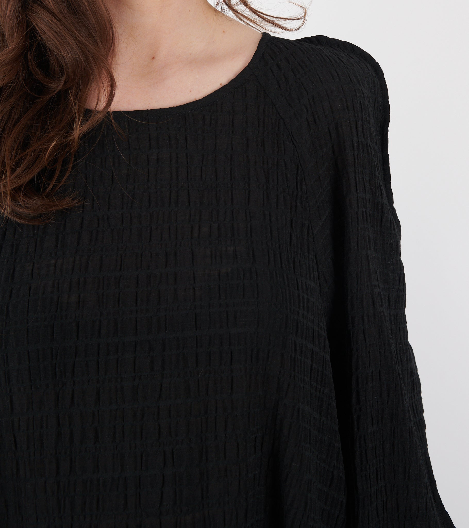 Sort kjole i en ternet viskoseblanding med let tekstur fra Henrik Vibskov. Octo Dress har bølgede kanter, lange ærmer samt en bådudskæring øverst.
