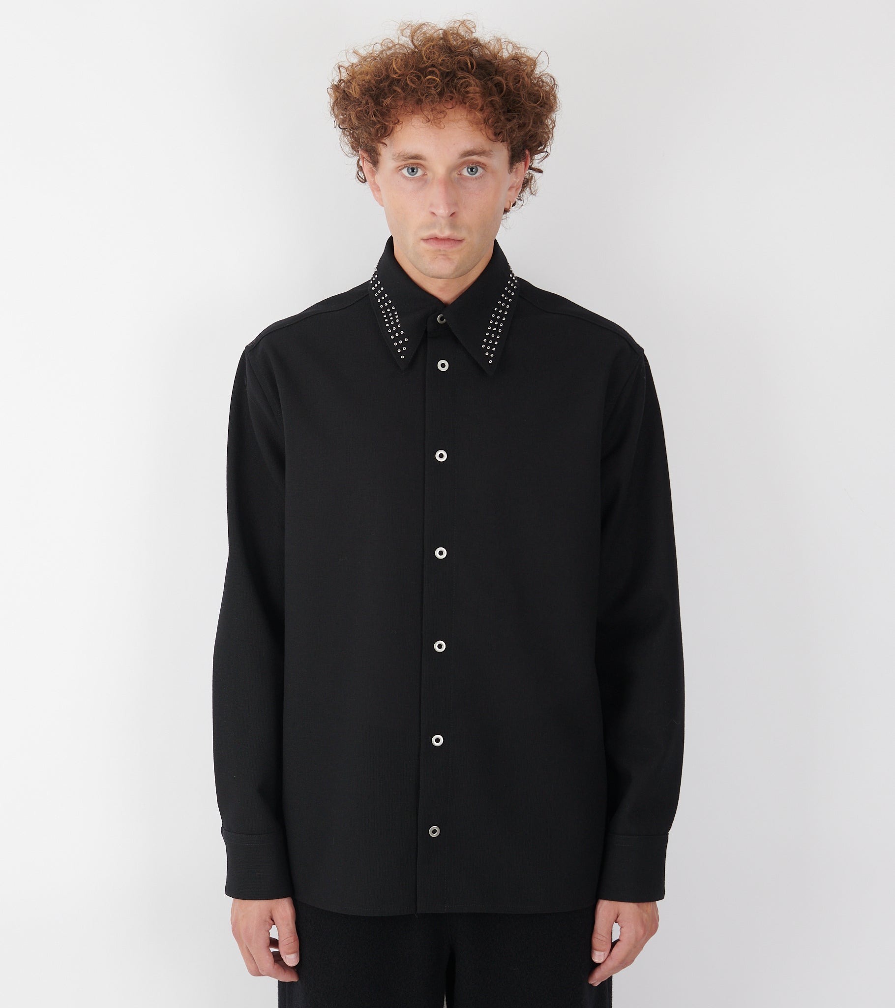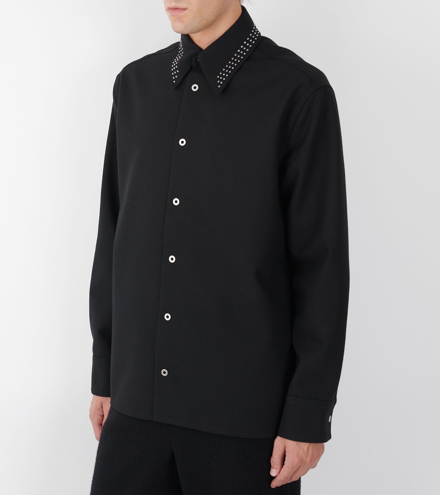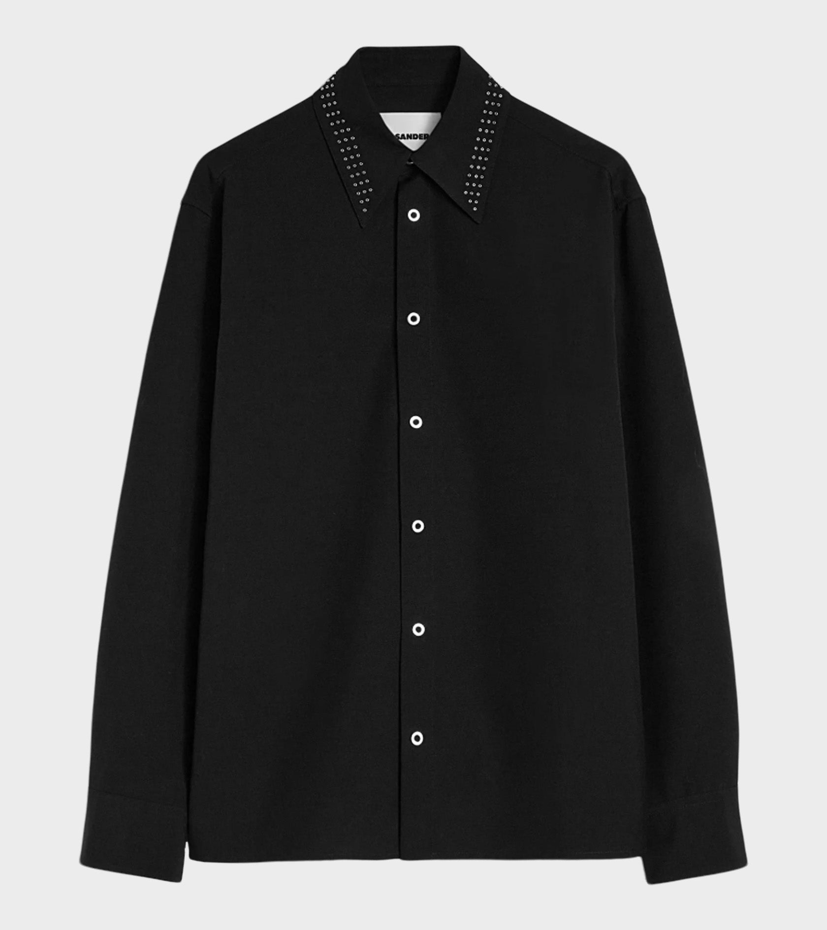 Sort skjorte i en vævet uld-poplin kvalitet fra Jil Sander. Skjorten har en let spids krave - detaljeret med metal-studs. På fronten er en trykknaplukning med eyelet metal-knapper.