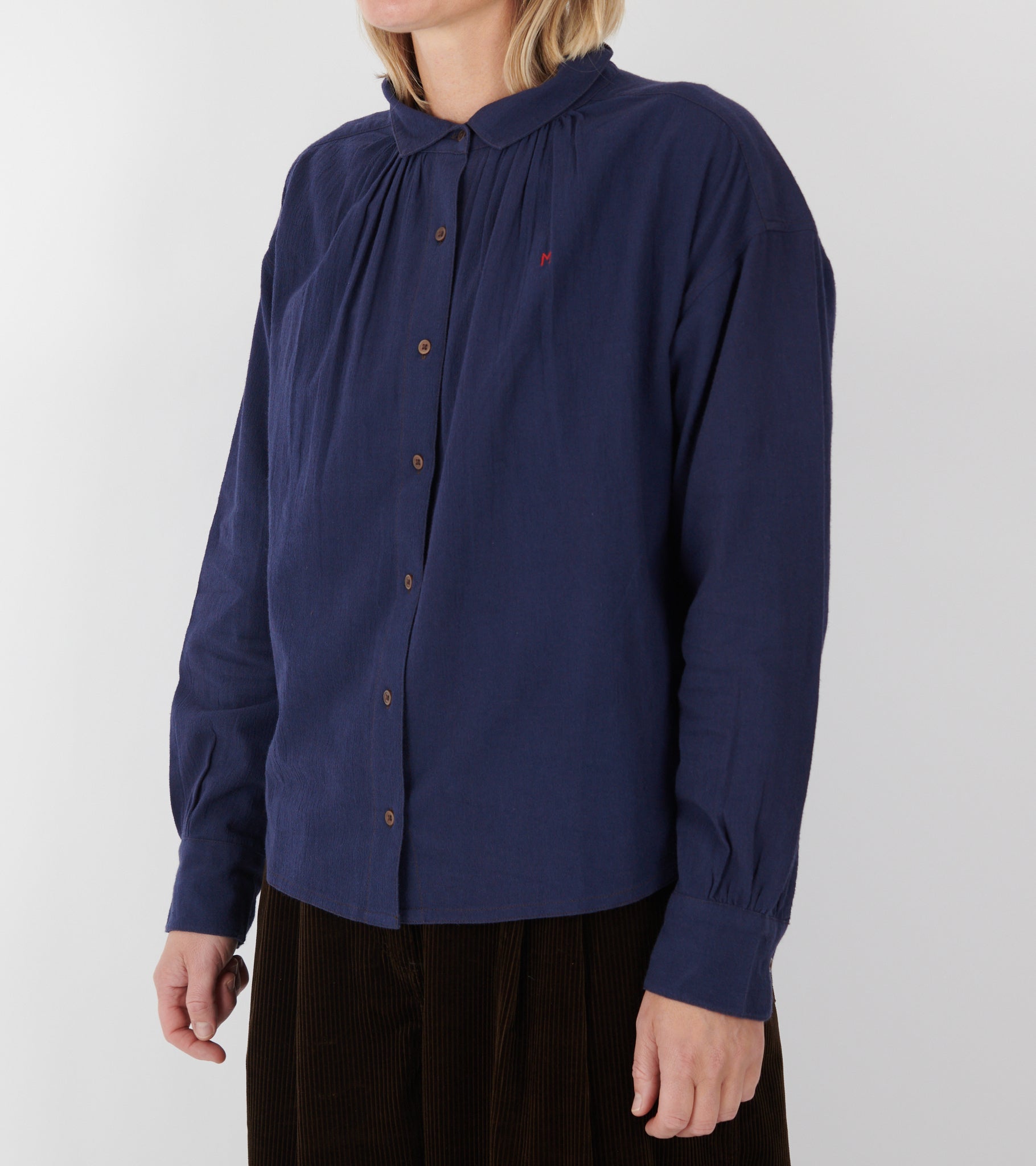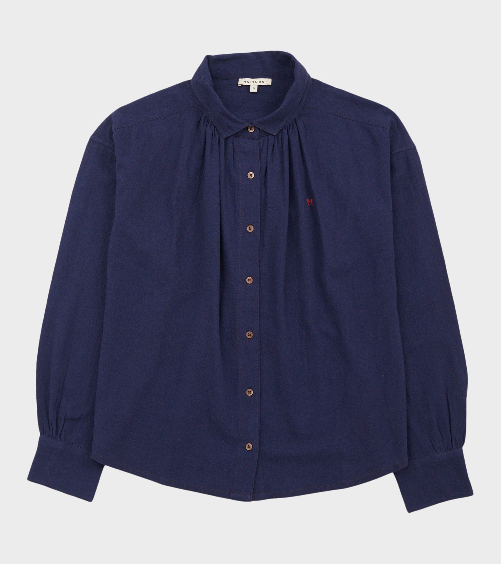 Navy skjorte fra Moismont. Denne skjorte har en lille krave, en knaplukning på fronten, manchetknapper og plisseringer på både front og ryg. Ved venstre bryst er et lille rødt broderet logo.