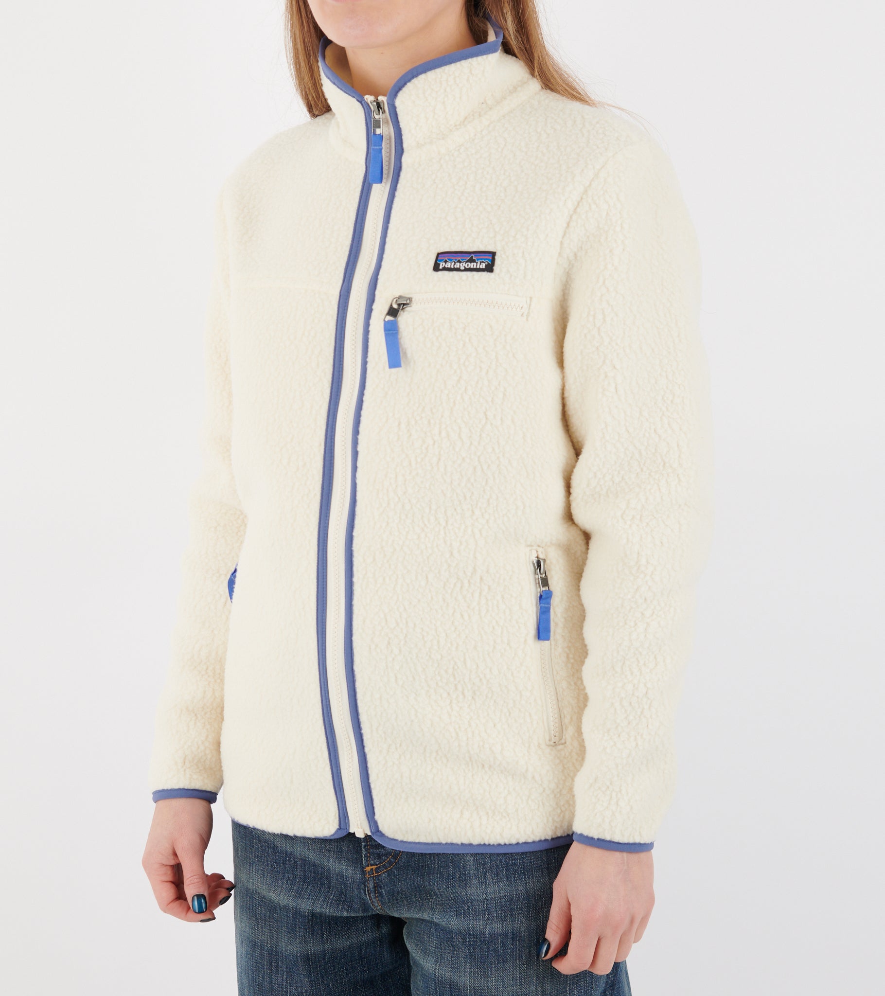 Råhvid fleecejakke fra Patagonia. W's Retro Pile Jacket er fremstillet i genanvendt double-sided polyesterfleece og har en høj hals, en lynlåslukning samt tre lynlåslommer på fronten. Ved venstre bryst er et logo.