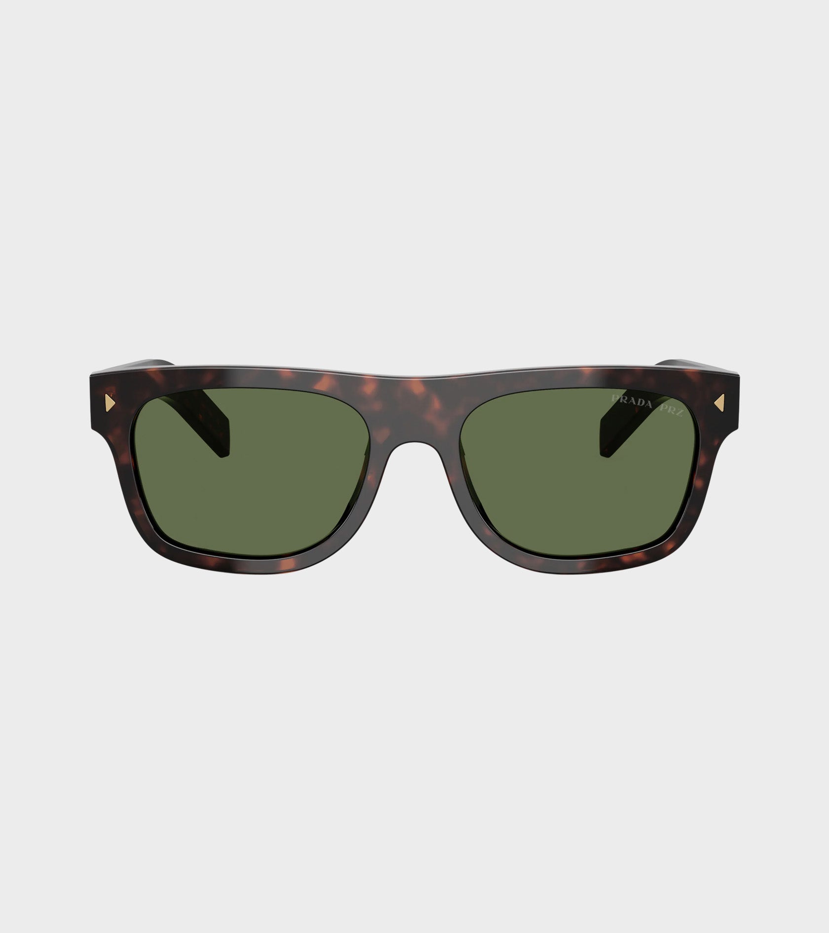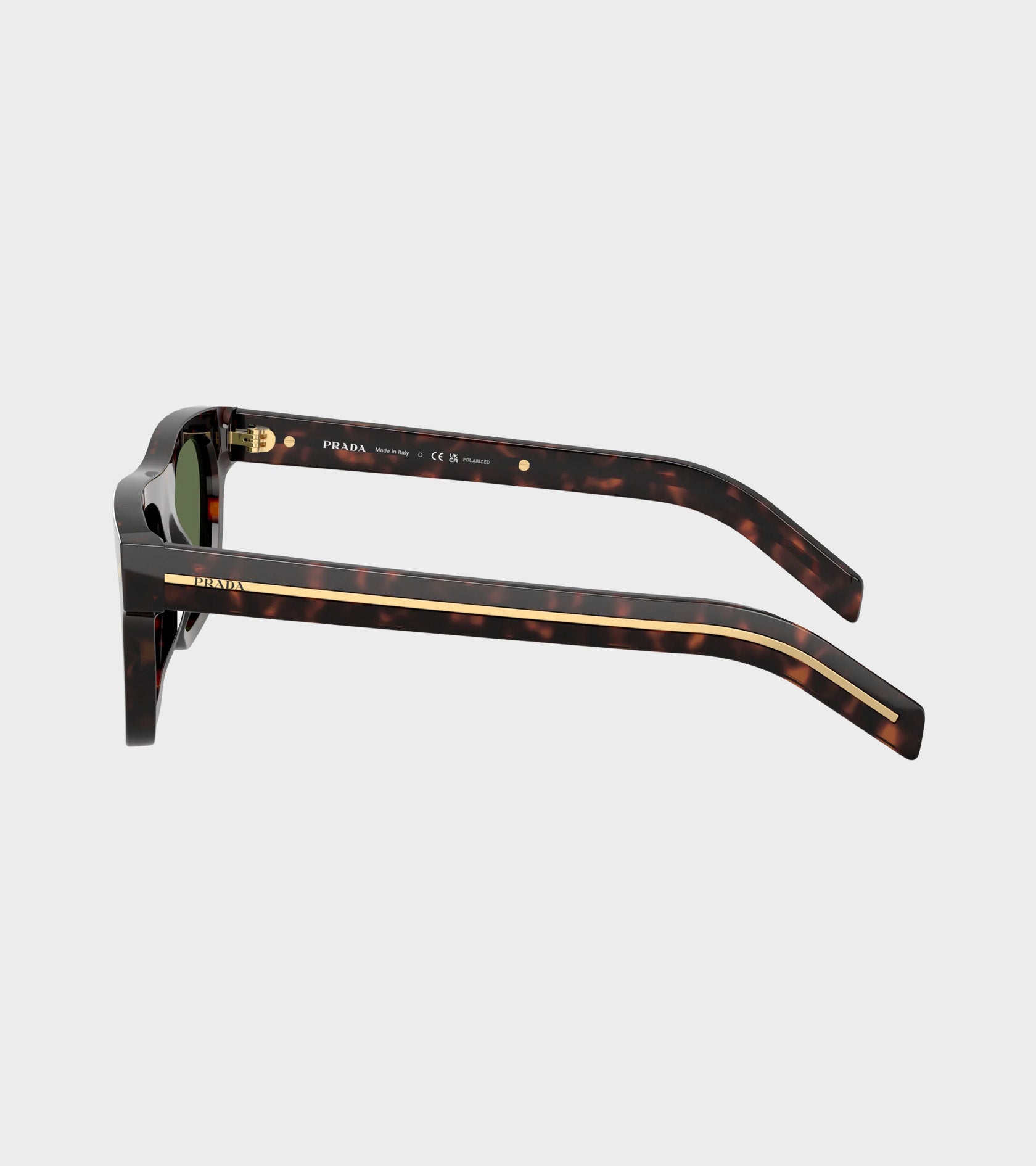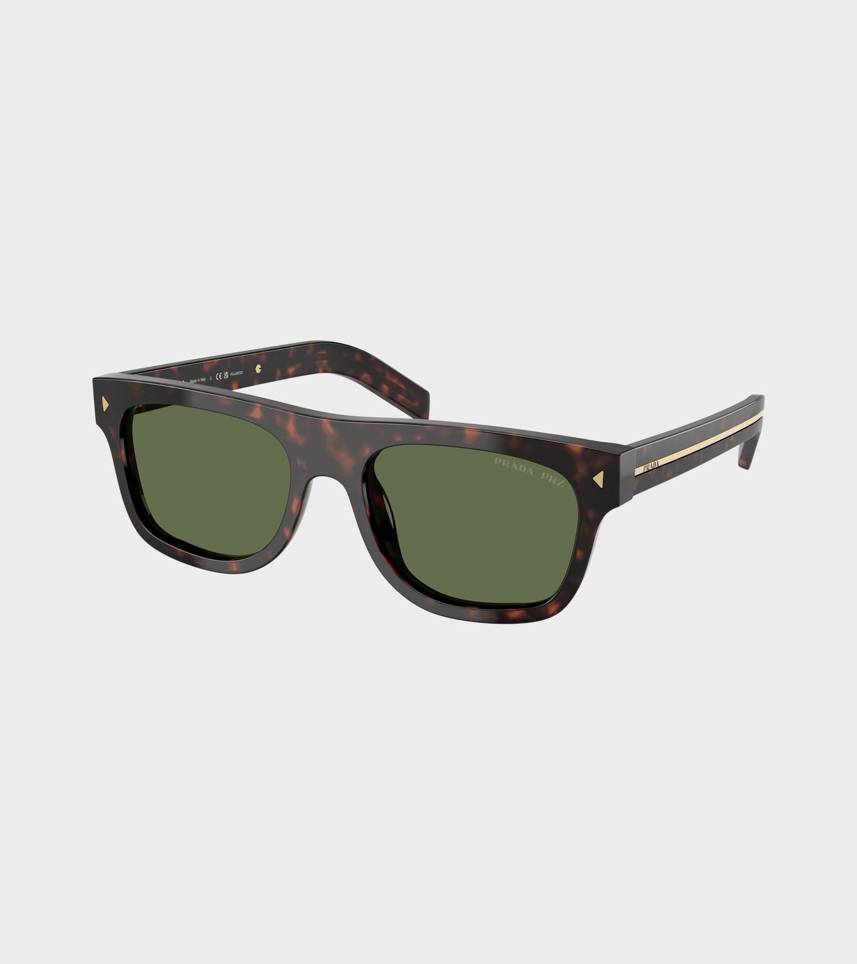 Brune solbriller fra Prada Eyewear. Disse solbriller har grønt glas - i det ene glas er et lille diskret indgraveret logo. Siderne er detaljeret med guld og har et lille logo. Solbrillerne kommer i et sort æske og etui medfølger.