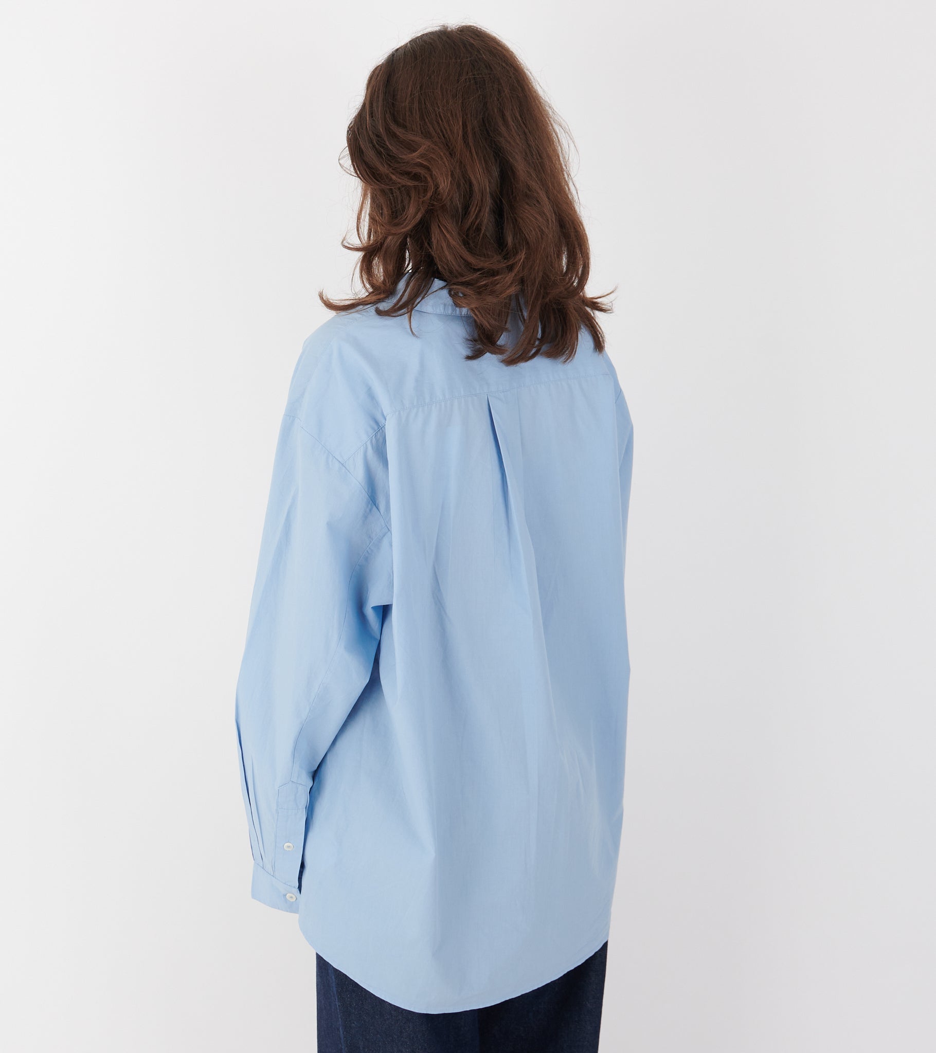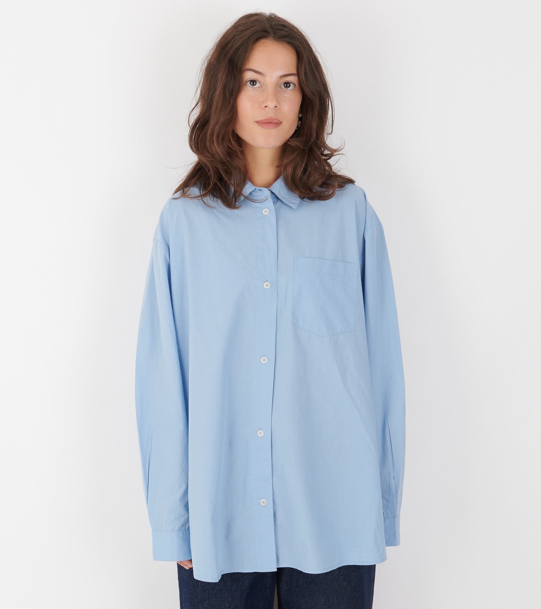 Lyseblå skjorte i økologisk bomuldspoplin fra Skall Studio. Edgar skjorten har en oversize pasform og et herreinspireret fit. Den har en klassisk krave, en åben brystlomme og en knaplukning på fronten.
