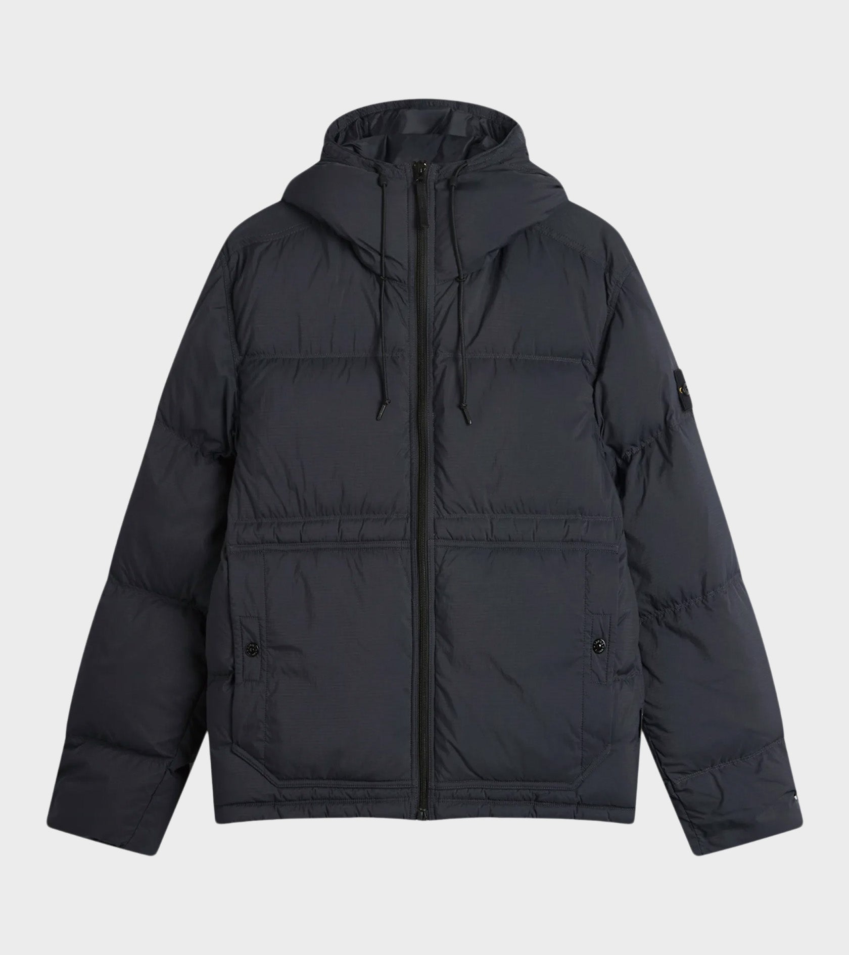 Sort dunjakke i mat nylon ripstop fra Stone Island. Jakken har en hætte med snore, en dobbeltgående lynlåslukning og en skrålomme i hver side. På venstre ærme er det ikoniske Stone Patch.