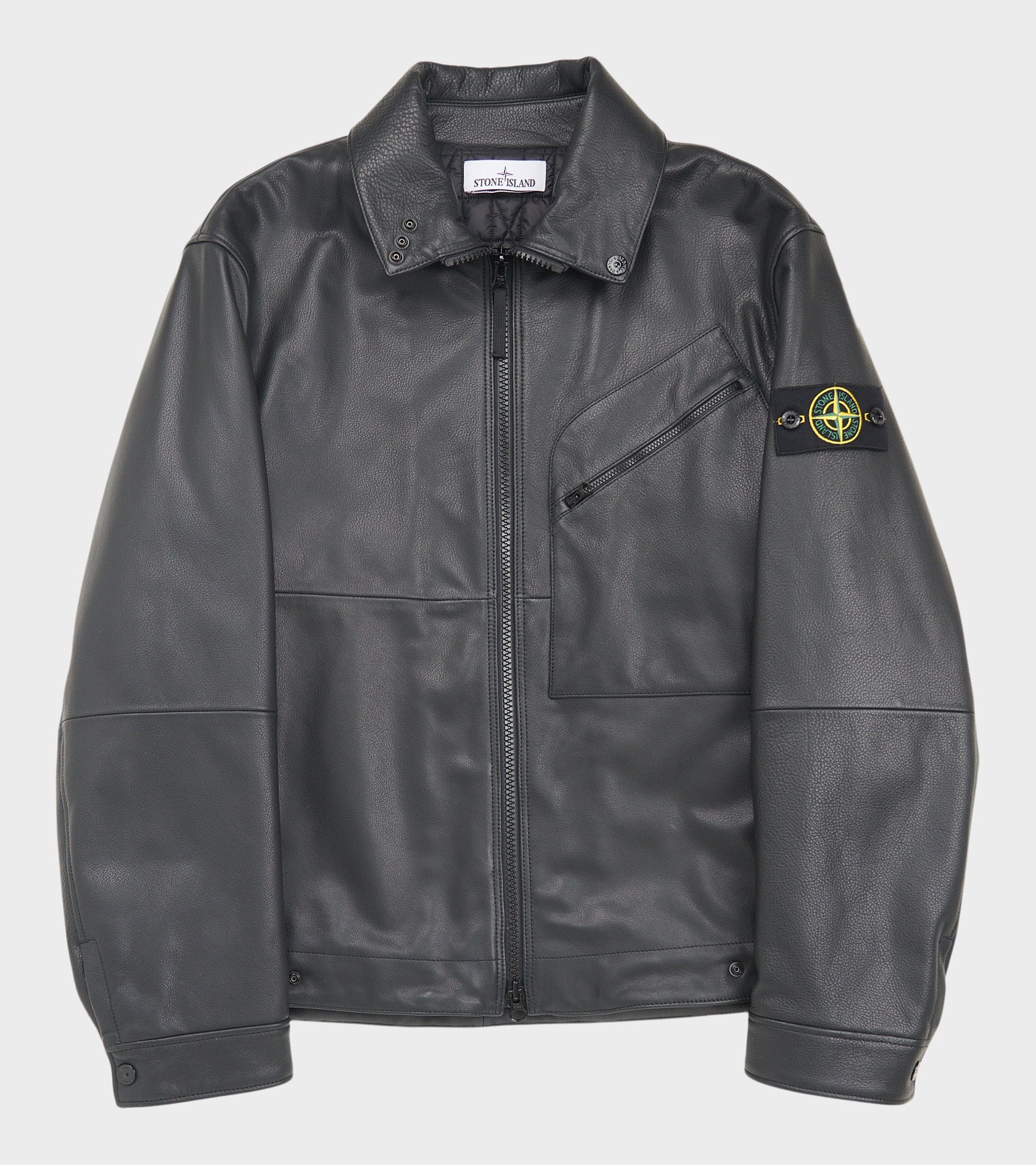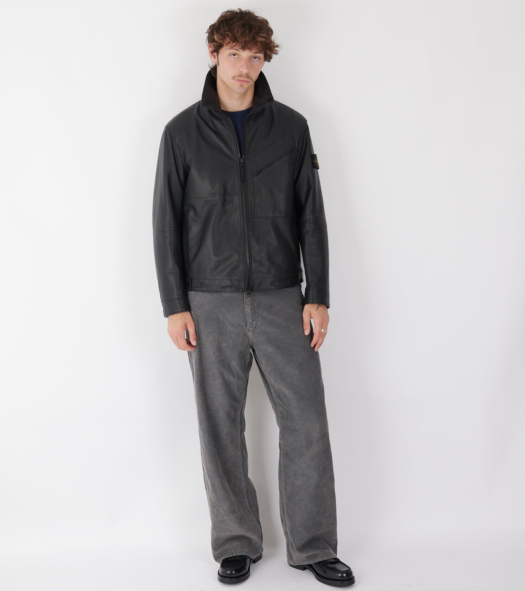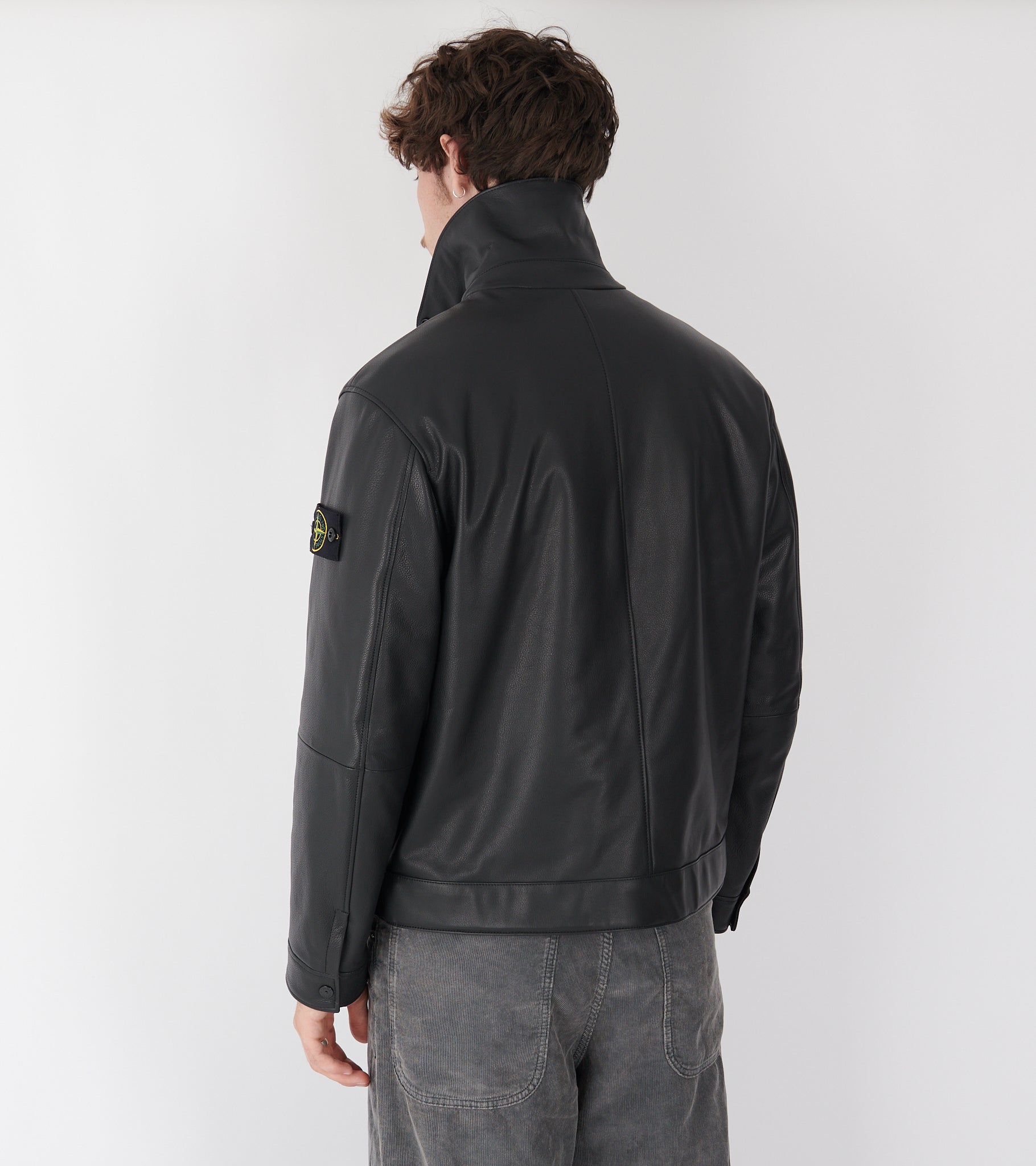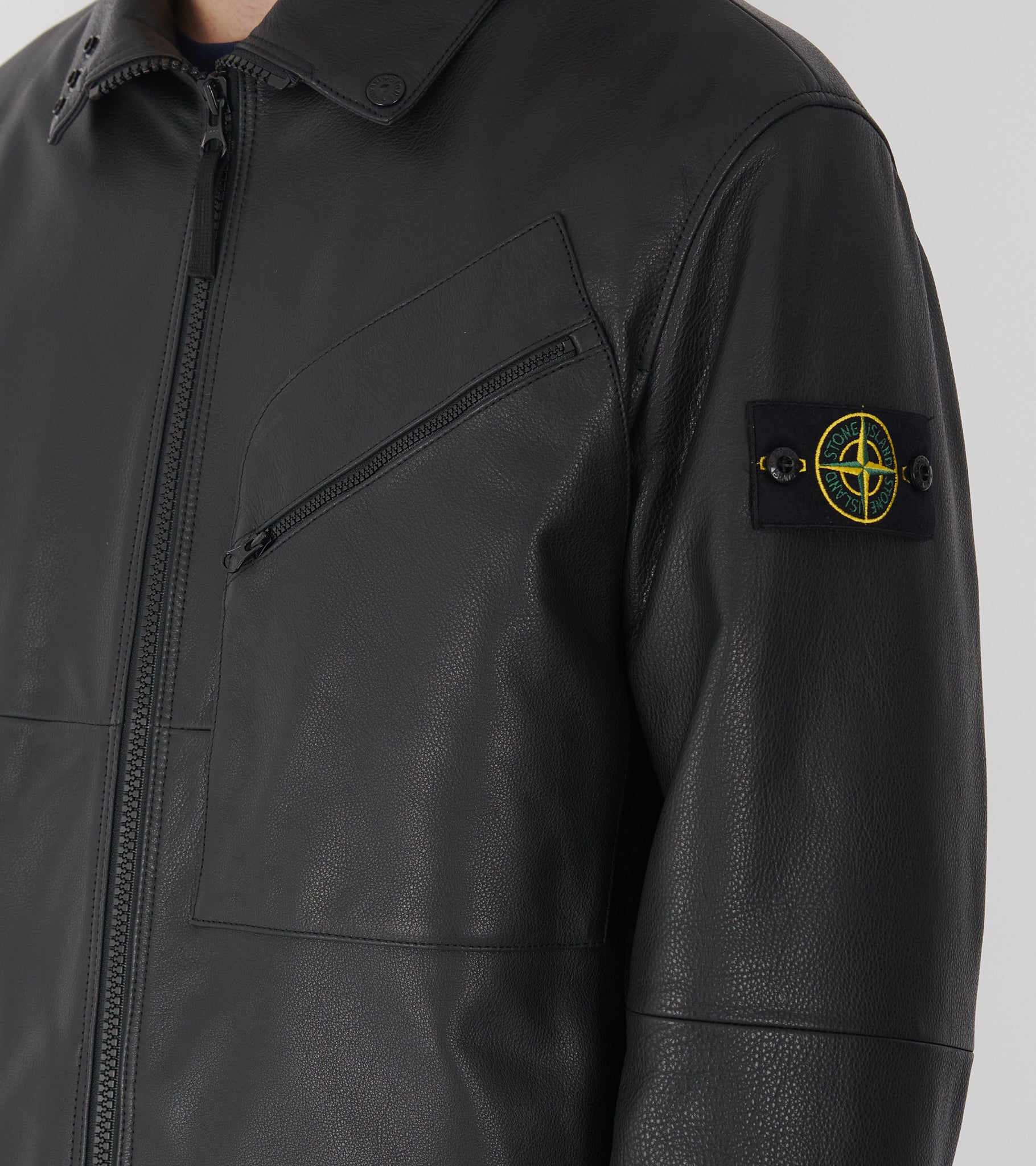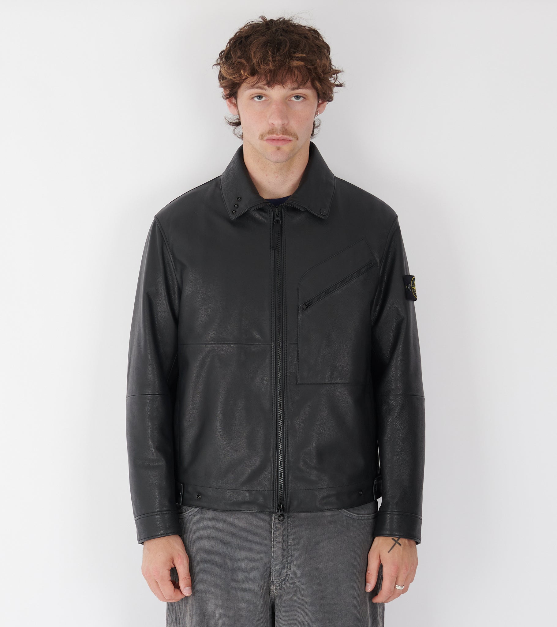 Sort læderjakke fra Stone Island. Jakken har en klassisk krave med en trykknap, en sort dobbeltgående lynlåslukning, en skrålomme i hver side samt en lynlåslomme ved venstre bryst. På venstre ærme er det ikoniske Stone Patch.