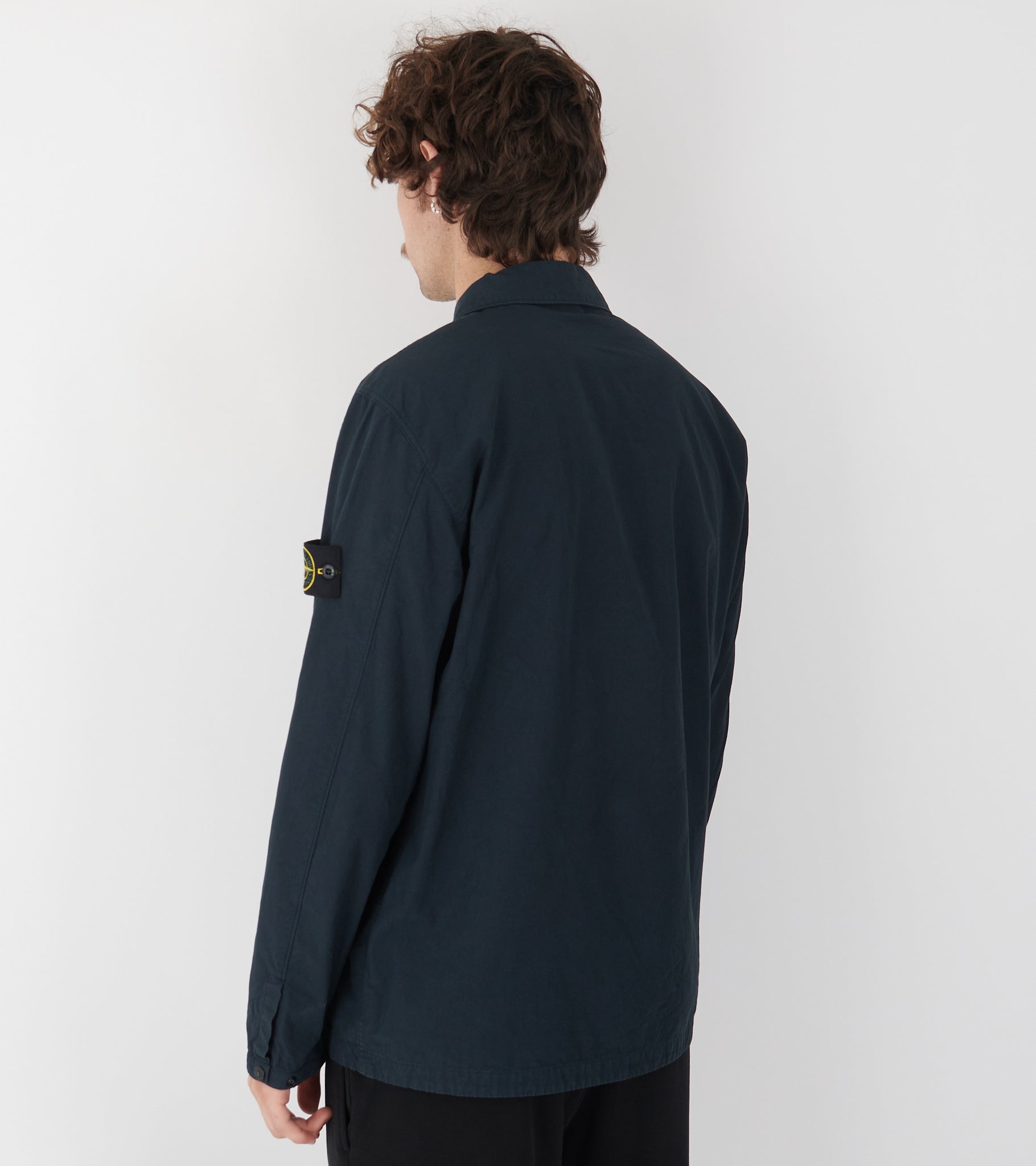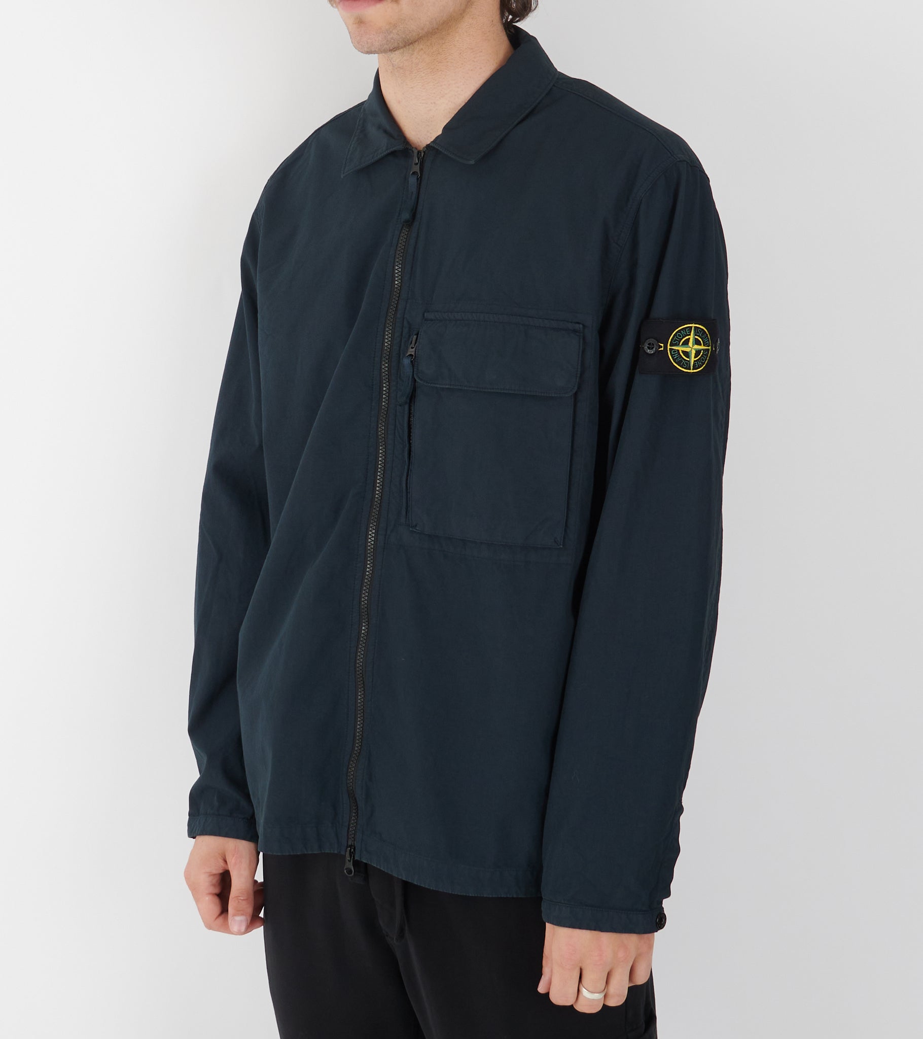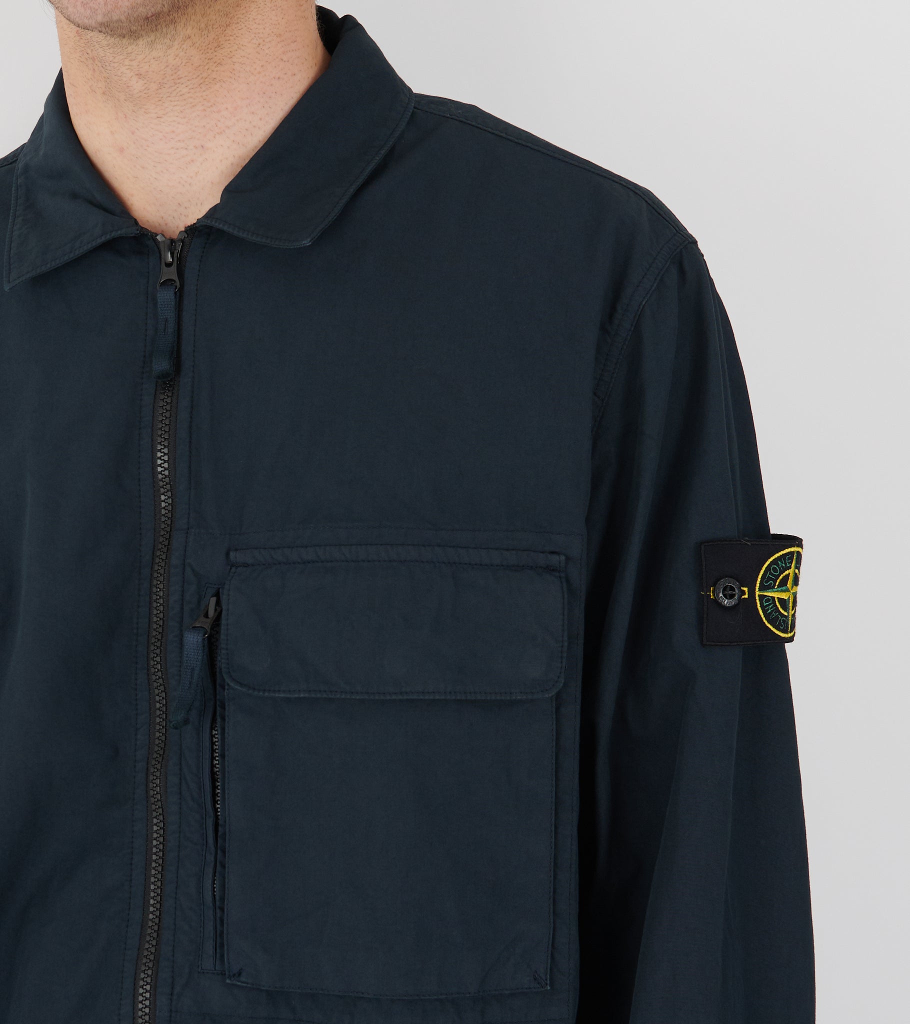 Navy overshirt i bomuld fra Stone Island. Denne overshirt har en klassisk krave, en sort dobbeltgående lynlåslukning og en dobbelt-lomme på fronten. På venstre ærme er det ikoniske Stone Patch.