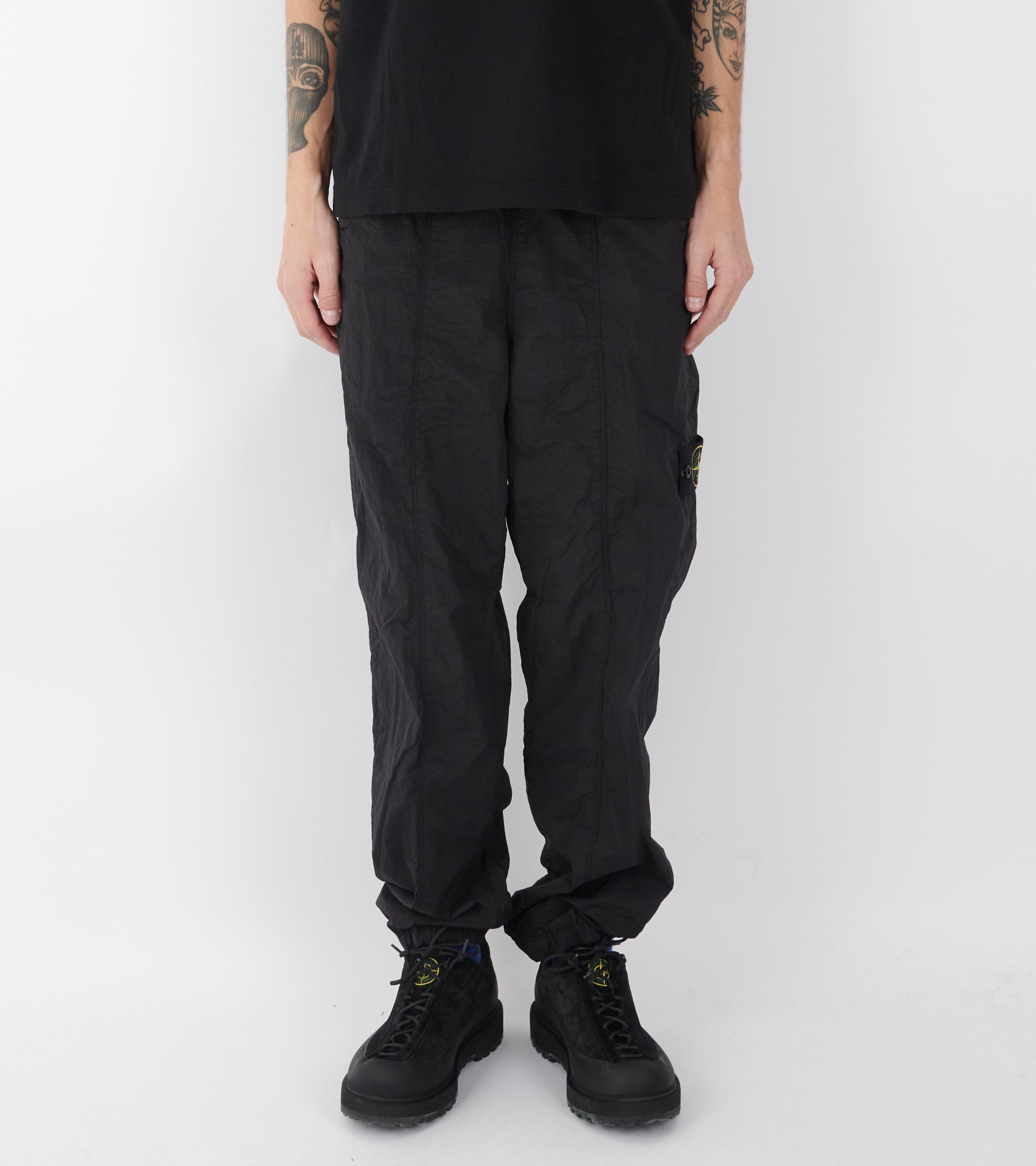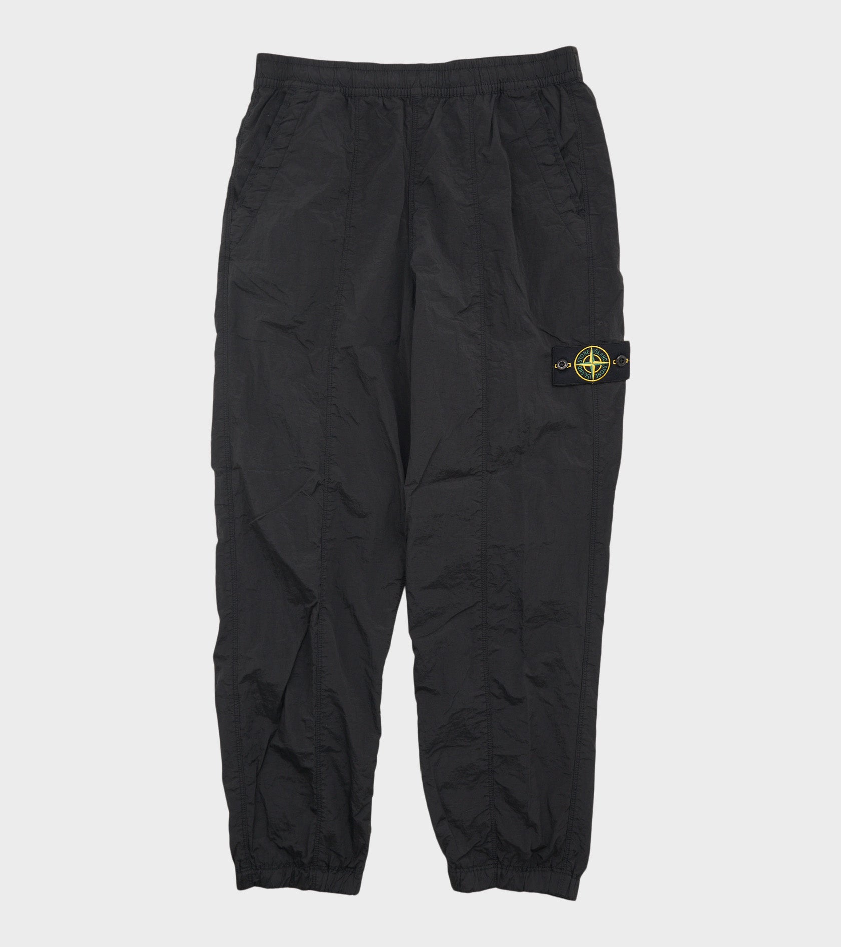 Sorte bukser fra Stone Island. Bukserne er fremstillet i en let skinnende Econyl nylon kvalitet og har elastik i livet samt bunden af benene, et indvendigt bindebånd, en skrålomme i hver side samt én baglomme. På venstre ben er det ikoniske Stone Patch.