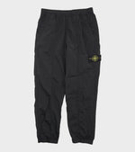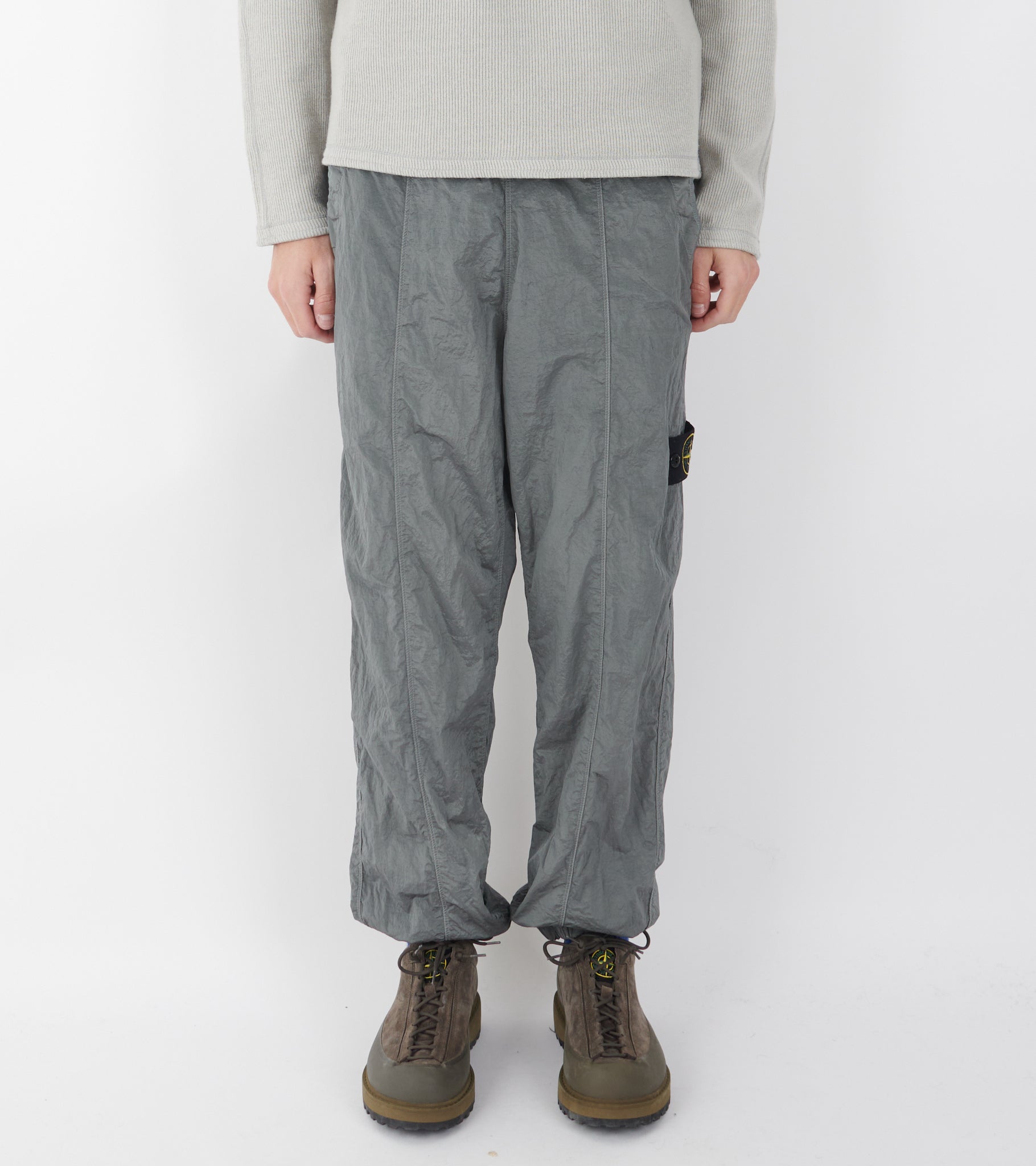 Grå bukser fra Stone Island. Bukserne er fremstillet i en let skinnende Econyl nylon kvalitet og har elastik i livet samt bunden af benene, et indvendigt bindebånd, en skrålomme i hver side samt én baglomme. På venstre ben er det ikoniske Stone Patch.