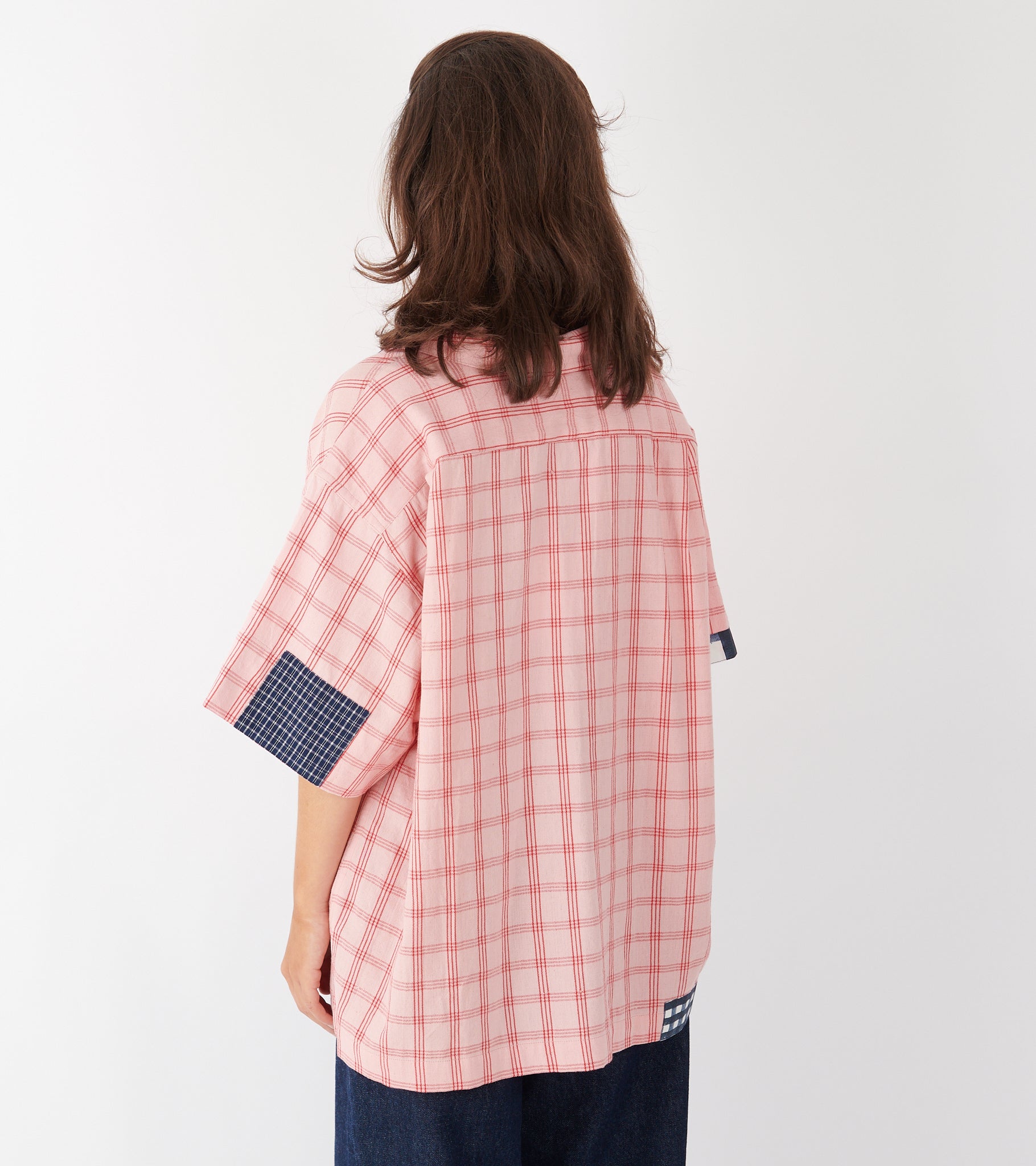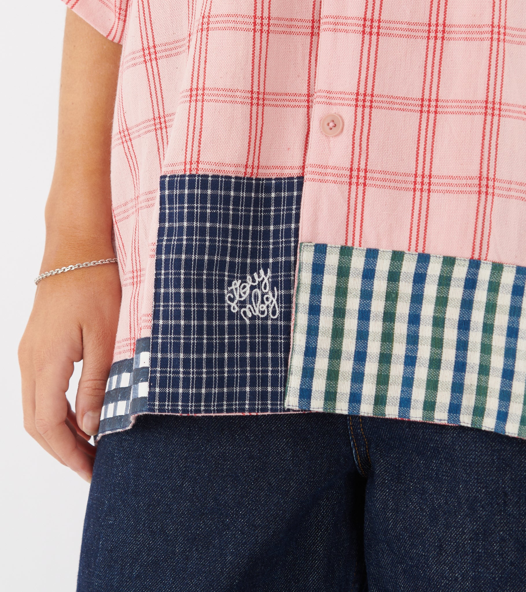 Lyserød ternet skjorte med korte ærmer fra Story mfg. PA Shirt Pink Picnic Handloom er fremstillet i økologisk håndvævet bomuld og har en åben krave, en knaplukning og to lommer på fronten. Skjorten har navy ternet patchwork samt et broderet logo nederst på fronten.