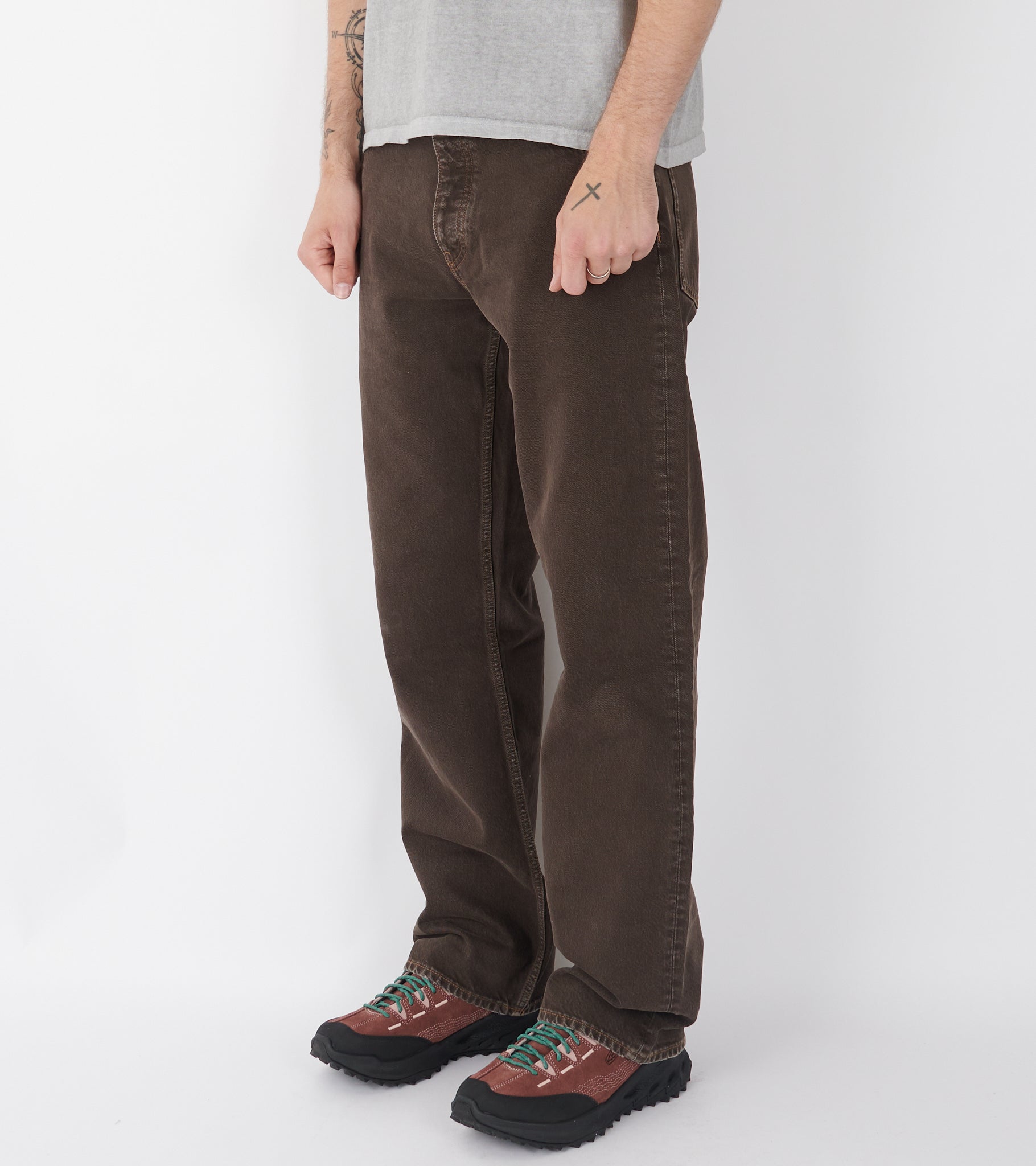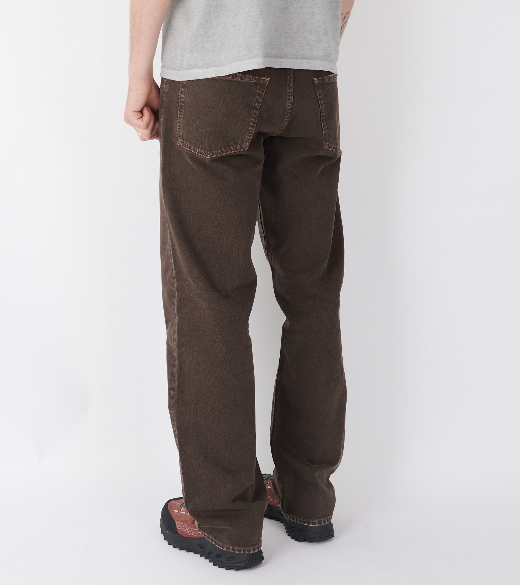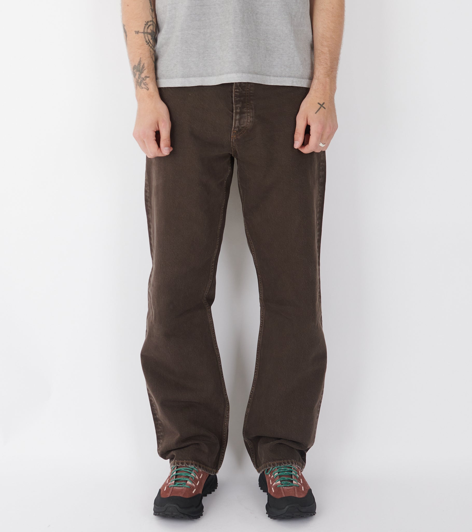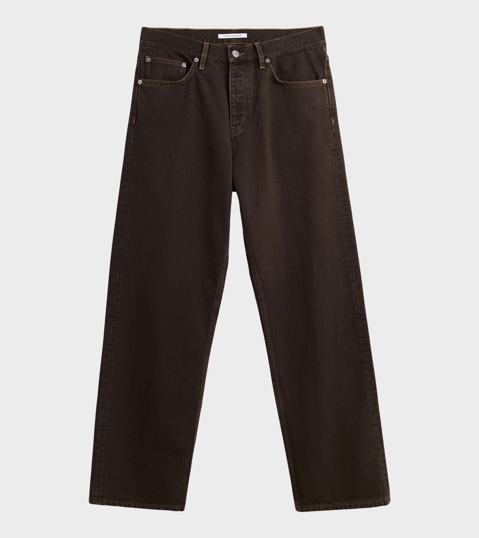 Jeans fra Sunflower i farven 'Vintage Brown'. Loose Jeans har bæltestropper, tre skrålommer på fronten og to baglommer. Øverst bagpå er et hvidt logotag i læder. De er unisex og har en let afslappet pasform.